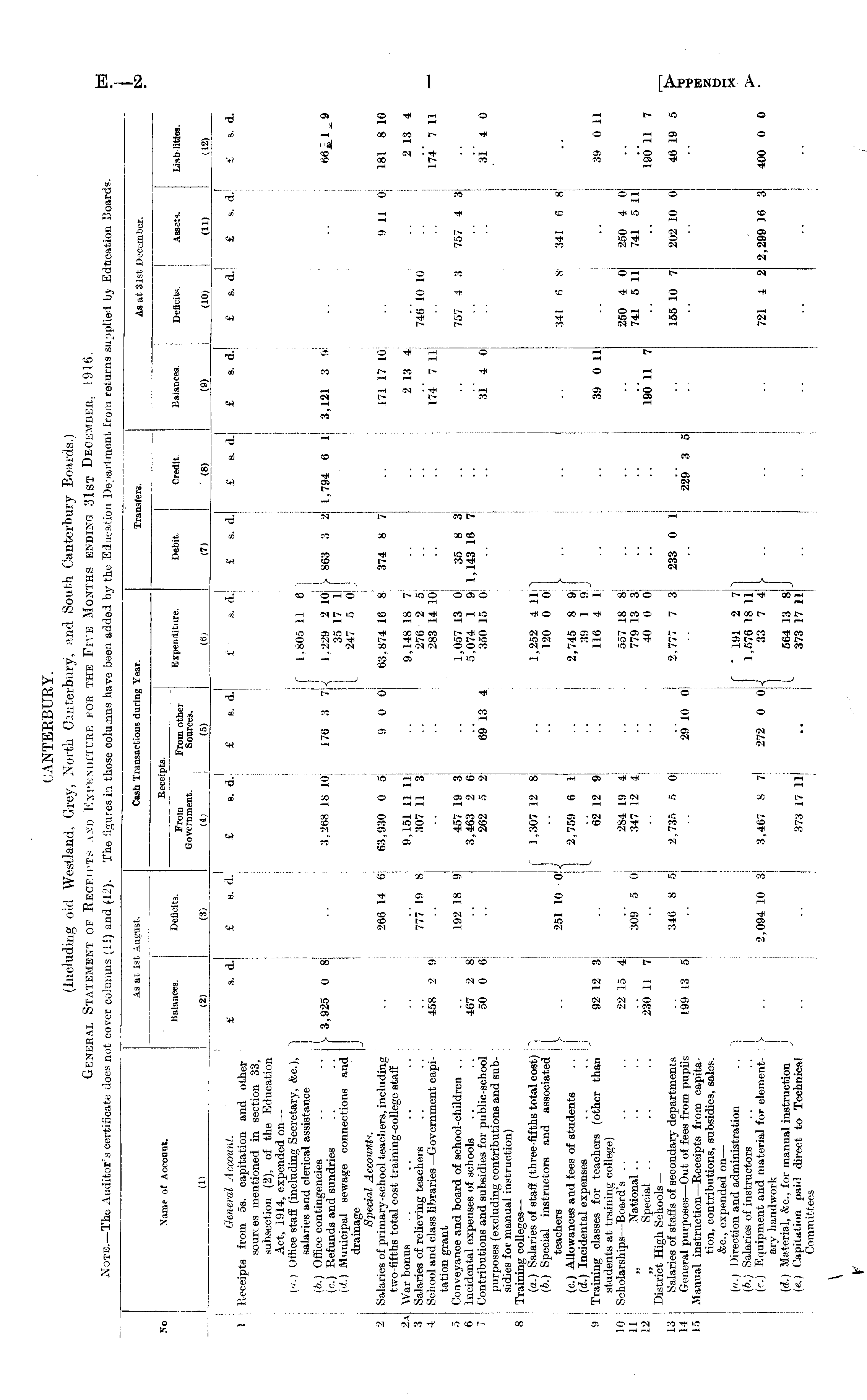 Note. —The -Auditor's certificate does not cover columns (11) and t;12). The figures in those columns have been added b; the Education Department from returns supplied by Education Boards. No Xarae of Account. .As at ] Balances. (2) As at 1st .August. 1st An ugust. Deficits. (3>_ Beet From Government. Cash Transactions during Year. Receipts. leipte i 3S. From other Sources. (5) Expenditure. (8) Debit. (7) Transfers. Credit. (8) Balances. (9) Deficits. (10) As at 31st December. ..Assets. (11) Liab lities. (18) (1) General Account. £ s. d. £ s. d. 1 Receipts from 5s. capitation and other sources mentioned in section 33, subsection (2), of the Education Act, 1914, expended on — («.) Uffiee staff (including Secretary, &c.), j "| salaries and clerical assistance (b.) Office contingencies .. ' „ „„, ,, s (ci) Refunds and sundries .. |. ' (d.) Municipal sewage connections and drainage Special Account*. 2 Salaries of primary-school teachers, including .. 266 14 6 two-fifths total cost training-college staff 2a War bonus .. .. .. 3 Salaries of relieving teachers .. .. .. 777 19 8 4 School and class libraries —Government capi- 458 2 9j tation grant 5 Conveyance and board of school-children .. .. 192 18 9 6 Incidental expenses of schools .. .. 467 2 8 7 Contributions and subsidies for public-school 50 0 6 purposes (excluding contributions and subsidies for manual instruction) S Training colleges — (a.) Salaries of staff (three-fifths total cost) ~) (b.) Special instructors and associated teachers V- .. 261 10 • 0 - (c.) Allowances and fees of students (d.) Incidental expenses .. 9 | Training classes for teachers (other than 92 12 3 students at training college) 10 Scholarships —Board's .. . . .. 22 15 4 11 „ National.. .. .. .. 309 5 0 12 „ Special . . .. .. 230 11 7 District High Schools — 13 Salaries of staffs of secondary departments .. 346 8 5 14 General purposes —Out of fees from pupiis 199 13 5 15 Manual instruction —Receipts from capitation, contributions, subsidies, sales. &c, expended on — (a.) Direction and administration .. ~) (b.) Salaries of instructors .. .. (ri) Equipment and material for element- > .. 2,094 10 3 ary handwork (o\) Material, etc., for manual instruction J (c.) Capitation paid direct to Technical Committees 2 2a 3 4 5 6 7 1 f 1 L £ s. d.' 3,268 18 10 63,930 0 5 9,151 11 11 307 11 3 457 19 3 3,463 2 6 262 5 2 1,307 12 8 2,759 6 1 62 12 9 284 19 4 347 12 4 2,735 5 0 ' 3,467 S 7 3173 17 11 £ s. d.J £ s. d. £ s. d. f 1,805 11 6" 176 3 14 1,229 2 10 J> 863 3 2 35 17 1 _ 247 5 0 _ 9 0 0 63,874 16 8 374 8 7 9,148 18 7 276 2 5; 283 14 10 1,057 13 0 35 8 3 5,074 1 9 1,143 16 7 69 13 4 3.50 15 0 1,252 4 IIP 120 0 o! \ y 2,745 8 9 39 1 9 116 4 1 557 18 8 779 13 3 40 0 0 I 2,777 7 3 233 0 1 29 10 0j f "191 2 7 1 1,576 18 11 272 0 Onj 33 7 4 » l_ 564 13 8 373 17 11 £ e. d. 1,794 6 1 i 229 3 5 £ s. d.J 3,121 3 9 171 17 10| 2 13 4 174 7 11 3i 4 0 39 0 11 190 11 7 f s. d. 746 10 10 757 4 3 341 6 8 250 4 0 741 5 11 155 10 7 721 4 2 £ b. d. 9 11 0 757 4 3 341 6 8 250 4 0 741 5 11 202 10 0 2,299 16 3 £ s. d. 181 8 10 2 13 4 174 7 11 31 1 U 39 0 11 190 11 7 46 19 5 400 0 0