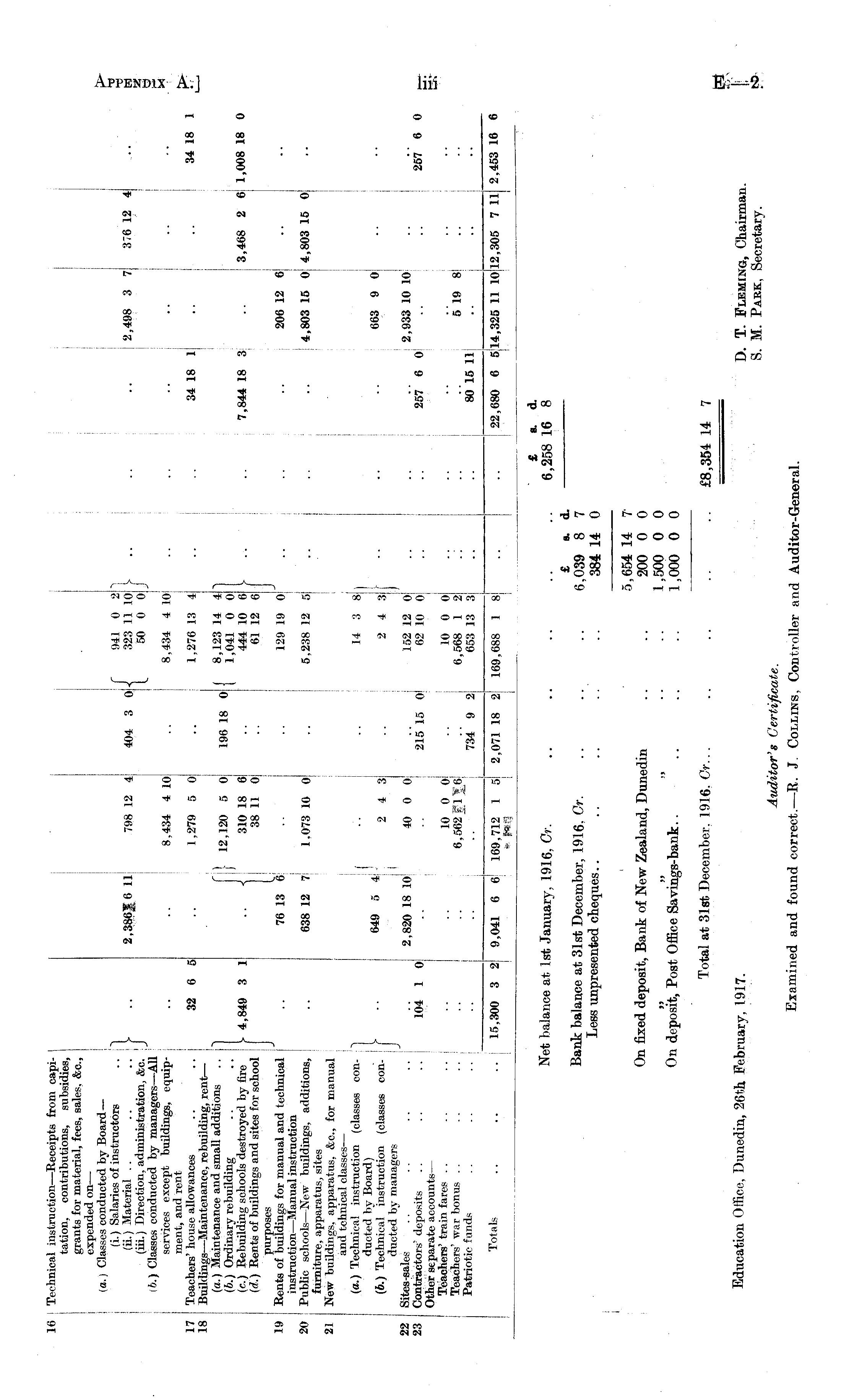 £ s. d. Net balance at. 1st January, 1916, Cr. .. .. .. .. .. 6,258 16 8 £ s. d. Bank balance at 31st December, 1916. Cr. .. .. .. 6,039 8 7 Less nnpresented cheques.. .. .. .. .. 384 14 0 i 5,654 14 7 On fixed deposit, Bank of New Zealand, Dunedin .. .. 200 0 0 .... 1,500 0 0 On deposit, Post Office Savings-bank.. .. .. .. 1,000 0 0 Total at 31st December. 1916. Cr... .. .. .. .. £8,354 14 7 Education Office, Dunedin, 26th February, 1917. D. T. Fleming, Chairman. S. M. Park, Secretary. Auditor's Certificate. Examined and found correct.— R. J. Collins, Controller and Auditor-General.