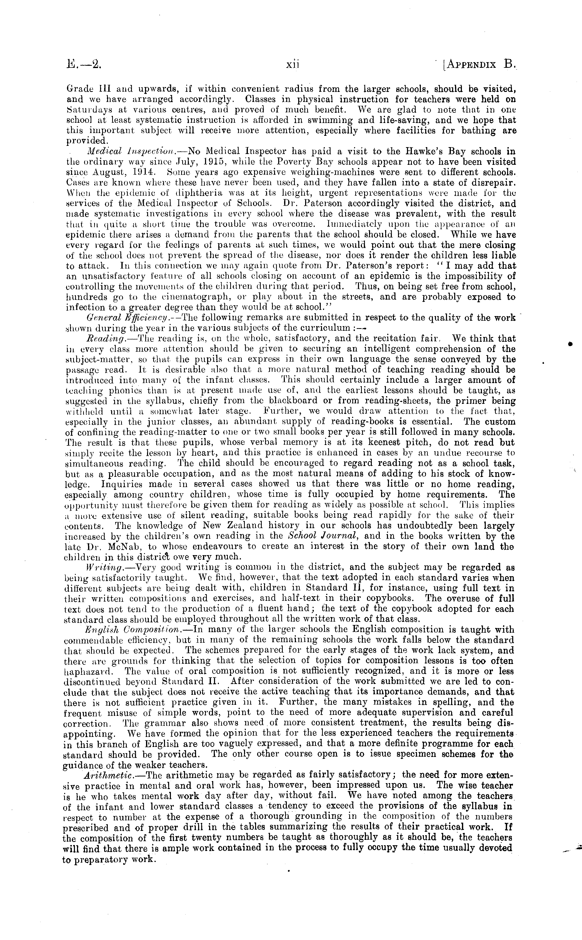 Grade 111 and upwards, if within convenient radius from the larger schools, should be visited, and we have arranged accordingly. Classes in physical instruction for teachers were held on Saturdays at various centres, and proved of much benefit. We are glad to note that in one school at least systematic instruction is afforded in swimming and life-saving, and we hope that this important subject will receive more attention, especially where facilities for bathing are provided. Medical Inspection. —No Medical Inspector has paid a visit to the Hawke's Bay schools in the ordinary way since July, 1915, while the Poverty Bay schools appear not to have been visited since August, 1914. Some years ago expensive weighing-machines were sent to different schools. Cases are known where these have never been used, and they have fallen into a state of disrepair. When the epidemic of diphtheria was at its height, urgent representations were made for the services of the Medical Inspector of Schools. Dr. Paterson accordingly visited the district, and made systematic investigations in every school where the disease was prevalent, with the result that in quite a short time the trouble was overcome. Immediately upon the appearance of an epidemic there arises a demand from the parents that the school should be closed. While we have every regard for the feelings of parents at such times, we would point out that the mere closing of the school does not prevent the spread of the disease, nor does it render the children less liable to attack. In this connection we may again quote from Dr. Paterson's report: " I may add that an unsatisfactory feature of all schools closing on account of an epidemic is the impossibility of controlling the movements of the children during that period. Thus, on being set free from school, hundreds go to the cinematograph, or play about in the streets, and are probably exposed to infection to a greater degree than they would be at school." General Efficiency .--The following remarks are submitted in respect to the quality of the work shown during the year in the various subjects of the curriculum : — Reading. —The reading is, on the whole, satisfactory, and the recitation fair, We think that in every class more attention should be given, to securing an intelligent comprehension of the subject-matter, so that the pupils can express in their own language the sense conveyed by the passage read. It is desirable also that a more natural method of teaching reading should be introduced into many of the infant classes. This should certainly include a larger amount of teaching phonics than is at present made use of, and the earliest lessons should be taught, as suggested in the syllabus, chiefly from the blackboard or from reading-sheets, the primer being withheld until a somewhat later stage. Further, we would draw attention to the fact that, especially in the junior classes, an abundant supply of reading-books is essential. The custom of confining the reading-matter to one or two small books per year is still followed in many schools. The result is that these pupils, whose verbal memory is at its keenest pitch, do not read but simply recite the lesson by heart, and this practice is enhanced in cases by an undue recourse to simultaneous reading. The child should be encouraged to regard reading not as a school task, but as a pleasurable occupation, and as the most natural means of adding to his stock of knowledge. Inquiries made in several cases showed us that there was little or no home reading, especially among country children, whose time is fully occupied by home requirements. The opportunity must therefore be given them for reading as widely as possible at school. This implies a more extensive use of silent reading, suitable books being read rapidly for the sake of their contents. The knowledge of New Zealand history in our schools has undoubtedly been largely increased by the children's own reading in the School Journal, and in the books written by the late Dr. McNab, to whose endeavours to create an interest in the story of their own land the children in this district owe very much. Writing. —Very good writing is common in the district, and the subject may be regarded as being satisfactorily taught. We find, however, that the text adopted in each standard varies when different subjects are being dealt with, children in Standard 11, for instance, using full text in their written compositions and exercises, and half-text in their copybooks. The overuse of full text does not tend to the production of a fluent hand; the text of the copybook adopted for each standard class should be employed throughout all the written work of that class. English Composition. —ln many of the larger schools the English composition is taught with commendable efficiency, but in many of the remaining schools the work falls below the standard that should be expected. The schemes prepared for the early stages of the work lack system, and there are grounds for thinking that the selection of topics for composition lessons is too often haphazard. The value of oral composition is not sufficiently recognized, and it is more or less discontinued beyond Standard 11. After consideration of the work submitted we are led to conclude that the subject does not receive the active teaching that its importance demands, and that there is not sufficient practice given in it. Further, the many mistakes in spelling, and the frequent misuse of simple words, point to the need of more adequate supervision and careful correction. The grammar also shows need.of more consistent treatment, the results being disappointing. We have formed the opinion that for the less experienced teachers the requirements in this branch of English are too vaguely expressed, and that a more definite programme for each standard should be provided. The only other course open is to issue specimen schemes for the guidance of the weaker teachers. Arithmetic
