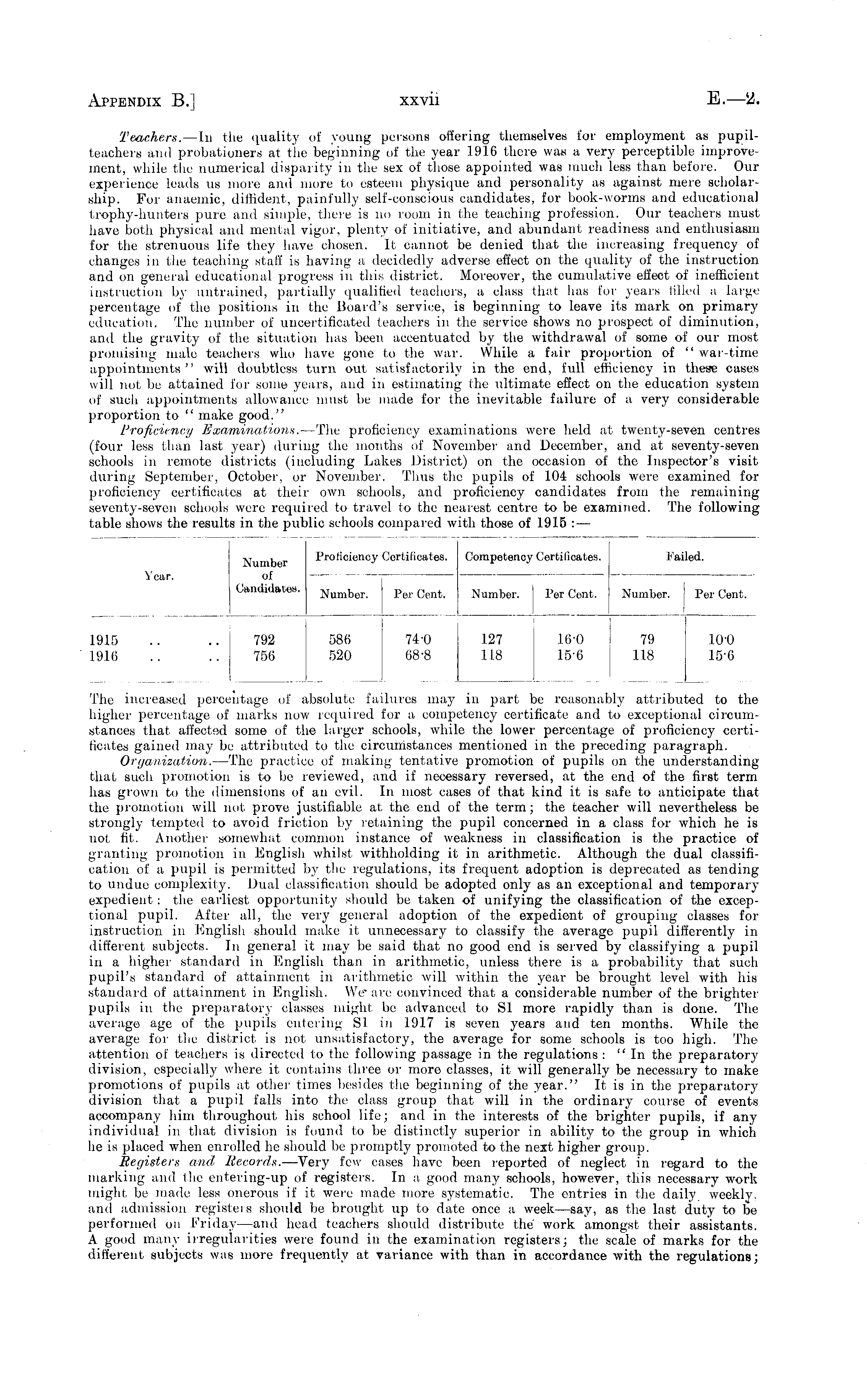 Teachers. —In the quality of young persons offering themselves for employment as pupilteachers and probationers at the beginning of the year 1916 there was a very perceptible improvement, while the numerical disparity in the sex of those appointed was much less than before. Our experience leads us more and more to esteem physique and personality as against mere scholarship. For anaemic, diffident, painfully self-conscious candidates, for book-worms and educational trophy-hunters pure and simple, there is no room in the teaching profession. Our teachers must have both physical and mental vigor, plenty of initiative, and abundant readiness and enthusiasm for the strenuous life they have chosen. It cannot be denied that the increasing frequency of changes in the teaching staff is having a decidedly adverse effect on the quality of the instruction and on general educational progress in this district. Moreover, the cumulative effect of inefficient instruction by untrained, partially qualified teachers, a class that has for years filled a large percentage of the positions in the Board's service, is beginning to leave its mark on primary education. The number of uncertificated teachers in the service shows no prospect of diminution, and the gravity of the situation has been accentuated by the withdrawal of some of our most promising male teachers who have gone to the war. While a fair proportion of " war-time appointments" will doubtless turn out satisfactorily in the end, full efficiency in these cases will not be attained lor some years, and in estimating the ultimate effect on the education system of such appointments allowance must be made for the inevitable failure of a very considerable proportion to " make good." Proficiency Examinations. —The proficiency examinations were held at twenty-seven centres (four less than last year) during the months of November and December, and at seventy-seven schools in remote districts (including Lakes District) on the occasion of the Inspector's visit during September, October, or November. Thus the pupils of 104 schools were examined for proficiency certificates at their own schools, and proficiency candidates from the remaining seventy-seven schools were required to travel to the nearest centre to be examined. The followingtable shows the results in the public schools compared with those of 1915 : —