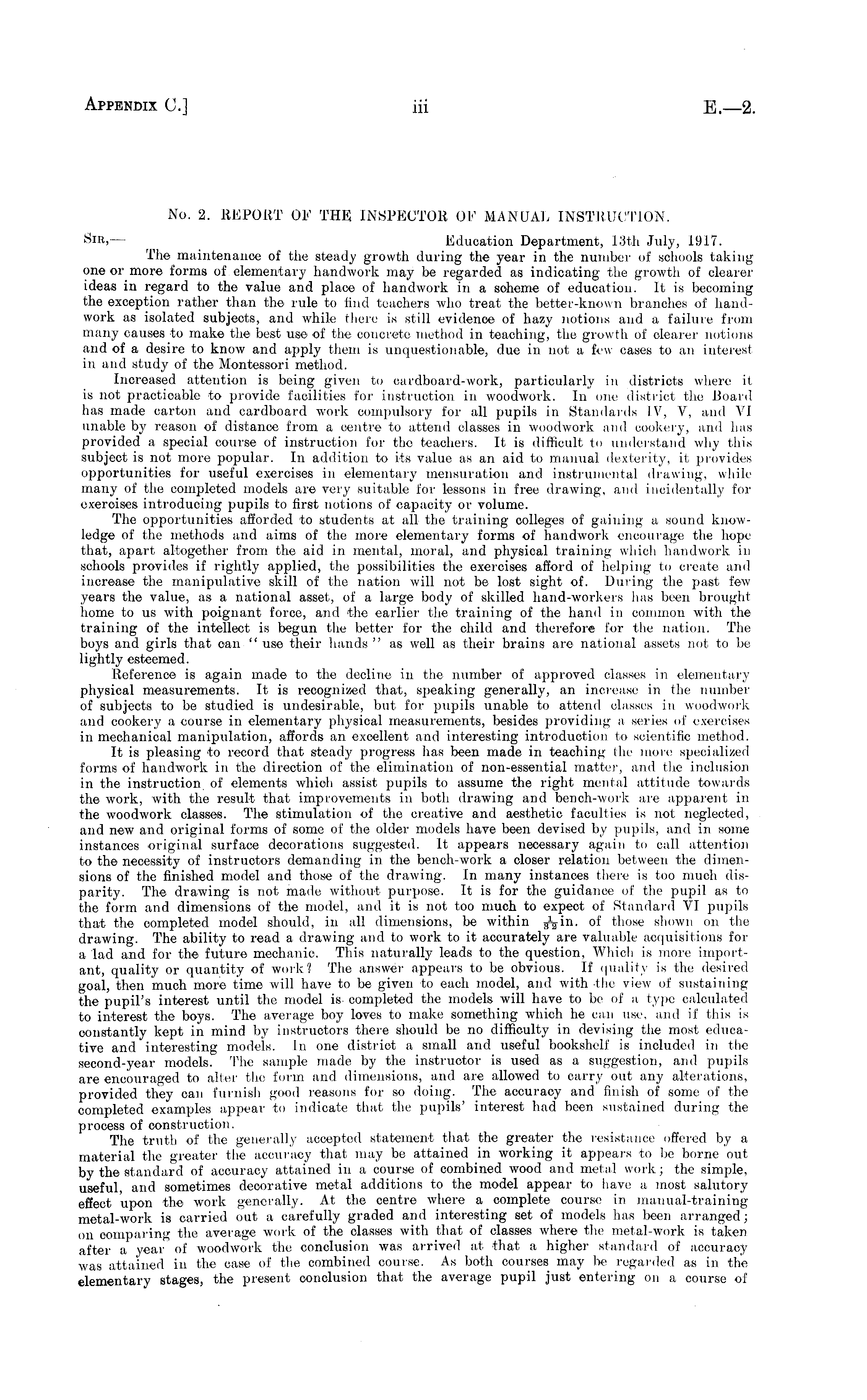 No. 2. REPORT OE THE INSPECTOK OF MANUAL INSTRUCTION. Sir, — Education Department, 13th July, 1917. The maintenance of the steady growth during the year in the number of schools taking one or more forms of elementary handwork may be regarded as indicating the growth of clearer ideas in regard to the value and place of handwork in a scheme of education. It is becoming the exception rather than the rule to find teachers who treat the better-known brandies of handwork as isolated subjects, and while there is still evidence of hazy notions and a failure from many causes to make the best use of the concrete method in teaching, the growth of clearer notions and of a desire to know and apply them is unquestionable, due in not a few cases to an interest in and study of the Montessori method. Increased attention is being given to cardboard-work, particularly in districts where it is not practicable to provide facilities for instruction in woodwork. In one district the Board has made carton and cardboard work compulsory for all pupils in Standards tV, V, and VI unable by reason of distance from a centre to attend classes in woodwork and oookery, and has provided a special course of instruction for the teachers. It is difficult tn understand why this subject is not more popular. In addition to its value as an aid to manual dexterity, it provides opportunities for useful exercises in elementary mensuration and instrumental drawing, while many of the completed models are very suitable for lessons in free drawing, and incidentally for exercises introducing pupils to first notions of capacity or volume. The opportunities afforded to students at, all the training colleges of gaining a sound knowledge of the methods and aims of the more elementary forms of handwork encourage the hope that, apart altogether from the aid in mental, moral, and physical training which handwork in schools provides if rightly applied, the possibilities the exercises afford of helping to create anil increase the manipulative skill of the nation will not be lost sight of. During the past few years the value, as a national asset, of a large body of skilled hand-workers has been brought home to us with poignant force, and the earlier the training of the hand in common with the training of the intellect is begun the better for the child and therefore for the nation. The boys and girls that can " use their hands " as well as their brains are national assets not, to be lightly esteemed. Reference is again made to the decline in. the number of approved classes in elementary physical measurements. It is recognized that, speaking generally, an increase in the number of subjects to be studied is undesirable, but for pupils unable to attend classes in woodwork and cookery a course in elementary physical measurements, besides providing a series of exercises in mechanical manipulation, affords an excellent and interesting introduction to scientific method. It is pleasing to record that steady progress has been made in teaching the more specialized forms of handwork in the direction of the elimination of non-essential matter, and the inclusion in the instruction of elements which assist pupils to assume the right mental attitude towards the work, with the result that improvements in both drawing and benoh-work are apparent in the woodwork classes. The stimulation of the creative and aesthetic faculties is not neglected, and new and original forms of some of the older models have been devised by pupils, and in some instances original surface decorations suggested. It appears necessary again to call attention to the necessity of instructors demanding in the bench-work a closer relation between the dimensions of the finished model and those of the drawing. In many instances there is too much disparity. The drawing is not made without purpose. It is for the guidance of the pupil as to the form and dimensions of the model, and it is not too much to expect of Standard VI pupils that the completed model should, in all dimensions, be within of those shown on the drawing. The ability to read a drawing and to work, to it accurately are valuable acquisitions for a lad and for the future mechanic. This naturally leads to the question, Which is more important, quality or quantity of work? The answer appears to be obvious. If quality is the desired goal, then much more time will have to be given to each model, and with the view of sustaining the pupil's interest until the model is completed the models will have to be of a type calculated to interest the boys. The average boy loves to make something which he can use, and if this is constantly kept in mind by instructors there should be no difficulty in devising the most educative and interesting models. In one district a small and useful bookshelf is included in the second-year models. The sample made by the instructor is used as a suggestion, and pupils are encouraged to alter the form and dimensions, and are allowed to carry out any alterations, provided they can furnish good reasons for so doing. The accuracy and finish of some of the completed examples appear to indicate that the pupils' interest had been sustained during the process of construction. The truth of the generally accepted statement that the greater the resistance offered by a material the greater the accuracy that may be attained in working it appears to be borne out by the standard of accuracy attained in a course of combined wood and metal work; the simple, useful, and sometimes decorative metal additions to the model appear to have a most salutory effect upon the work generally. At the centre where a complete course in manual-training metal-work is carried out a carefully graded and interesting set of models has been arranged; on comparing the average work of the classes with that of classes where the metal-work is taken after a year of woodwork the conclusion was arrived at that a higher standard of accuracy was attained in the case