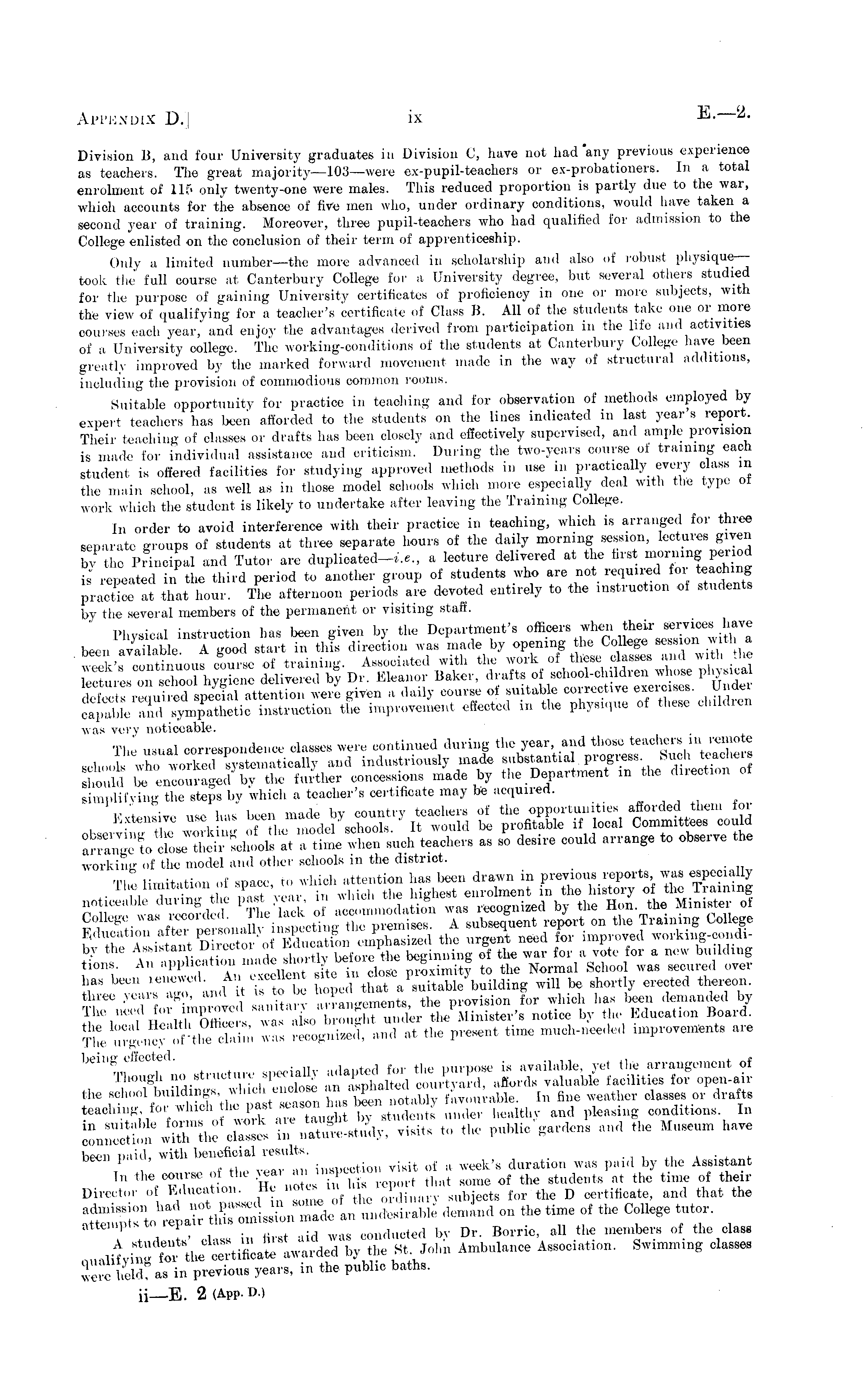 Division B, and four University graduates in Division C, have not had'any previous experience as teachers. The great majority—lo3—were ex-pupil-teachers or ex-probationers. In a total enrolment of 115 only twenty-one were males. This reduced proportion is partly due to the war, which accounts for the absence of five men who, under ordinary conditions, would have taken a second year of training. Moreover, three pupil-teachers who had qualified for admission to the College enlisted on the conclusion of their term of apprenticeship. Only a limited number—the more advanced in scholarship and also of robust physique— took the full course at Canterbury College for a University degree, but several others studied for the purpose of gaining University certificates of proficiency in one or more subjects, with the view of qualifying for a teacher's certificate of Class B. All of the students take one or more courses each year, and enjoy the advantages derived from participation, in the life and activities of a University college. The working-conditions of the students at Canterbury College have been greatly improved by the marked forward movement made in the way of structural additions, including the provision of commodious common rooms. Suitable opportunity for practice in teaching and for observation of methods employed by expert teachers has been afforded to the students on the lines indicated m last year s report. Their teaching of classes or drafts has been closely and effectively supervised, and ample provision is made for individual assistance and criticism. During the two-years course oi training each student is offered facilities for studying approved methods in use in practically every class in the main school, as well as in those model schools which more especially deal with the type ot work which the student is likely to undertake alter leaving the Training College. In order to avoid interference with their practice in teaching, which is arranged for three separate groups of students at three separate hours of the daily morning session, lectures given by the Principal and Tutor are duplicated-.,., a lecture delivered at the tirs is" repeated in the third period to another group of students who are not required for teaching practice at that hour. The afternoon periods are devoted entirely to the instruction ot students by the several members of the permanent or visiting staff. was very noticeable. The usual correspondence classes were continued during the year, and those teachers in remote «,.I.J who worked systematically and industriously made substantial progress Such teachers sl.ould be Imlouragecfbv tlie further concessions niade by the. Department in the direction of simplifying the steps by which a teacher's certificate may be acquired. a. .o <l„i™ ccld .„.,«. to ob„. TO the working of the model and other schools in the district. Tkt limitation of space to which attention has been drawn in previous reports was especially rhe limitation o > * cc > l \ ~ , t , ~ . h t enrolment in the history of the Training oT ''a recorded 'ftffi. S accommodatiol was recognized by the Hon. the Minister of College was nx-oided me uw < miscs . A subsequent report on the Training College the urgent need for improved working-Condi-by the Assistant Dim to, o I ication p bt , ( ,. in]|ill<) . o fe f tLe war f or a vote for a new building tions. An application^ made £ JjgJ"* J £ Normal Sohool was over has been ,cnc«o«l. Ai exoeUe t c a P suitab le building will be shortly erected thereon, three years ago, and it sto be bopeo. max , )visi()ll for whi ch has been demanded by The need or S1 nary a ■ V »»; tI J Minister's notice by the Education Board. Set Sim tSim Z togged* and at the present time much-needed improvements are being c cote . ~.„.;.I IK. adar/ted for the purpose is available, yet the arrangement of "V '"wldeli'en ke an asphalted courtyard, affords valuable facilities for open-air the sohool buildings, which enolose an atpnum £ayourab l e In fine weather classes or drafts -c! healthy and pleasing conditions. In ZZeTl*£™te close's ZSStA, visit, to the public gardens and the Museum have been paid, with beneficial results In the course of the >ea, . " ' ~,, lhat some of the students at the time of their Director of Education He notes in n» D oertifioatej ,„„, that , the demand on the time of the College tutor. attempts to repair tnis conducte d by Dr. Borrie, all the members of the class n J t. John Ambulance Association. Swimming classes wereheld as in previous years, in the public baths.