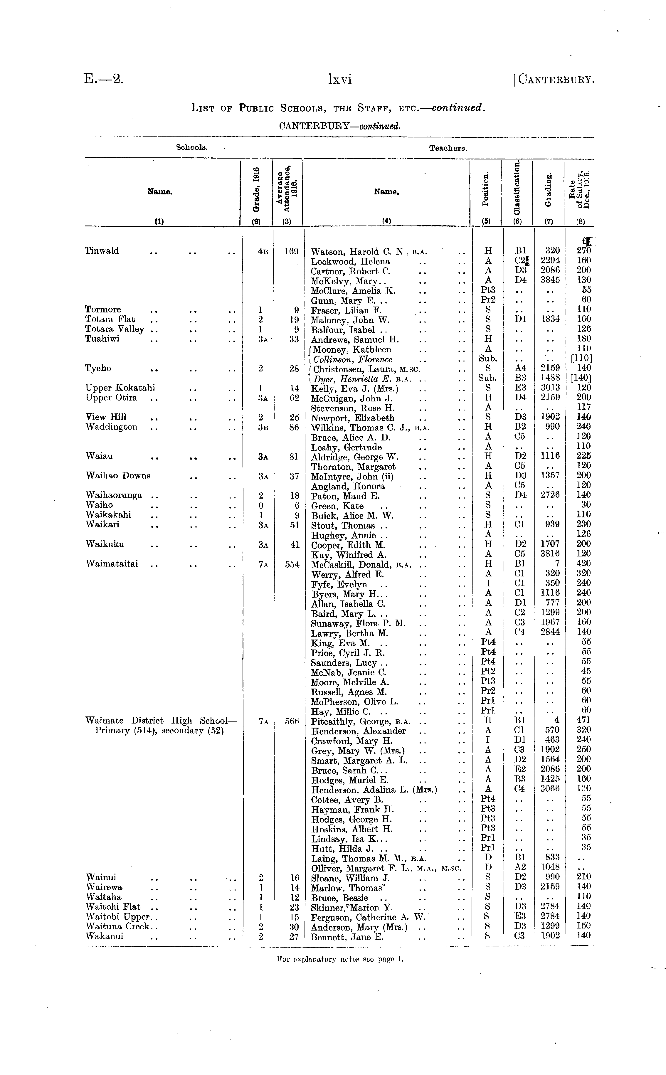 Schools. Teachers. Name. CO Ol £ - cd u a _J2) CD* Ol - M fl . *-crjS to _ at <s «i Name, a c r. 'co O Ph 1 o 1 cj 5 XI A 5 (6) fl - A a (7) I ______ _i op (8) (1) («> (5) (3) Tinwald Tormore Totara Flat Totara Valley .. Tuahiwi Tycho Upper Kokatahi Upper Otira View Hill Waddington Waiau Waihao Downs Waihaorunga .. Waiho Waikakahi Waikari Waikuku In I 2 1 3a2 I 3a 2 3b 3a 3a 2 0 1 3a 3a 169 9 19 9 33 28 14 62 25 86 81 37 18 6 9 51 41 Watson, Harold 0. N , B.A. Lockwood, Helena Gartner, Robert C. McKelvy, Mary.. McCIure, Amelia K. Gunn, Mary E. .. Fraser, Lilian F. Maloney, John W. Balfour, Isabel Andrews, Samuel H. f Mooney, Kathleen ( Oollinson, Florence ] Christensen, Laura, M. sc. [Dyer, Henrietta M. B.A. .. Kelly, Eva J. (Mrs.) McGuigan, John J. Stevenson, Rose H. '. Newport, Elizabeth Wilkins, Thomas C. J., b.a. Bruce, Alice A. D. Leahy, Gertrude Aldridge, George W. Thornton, Margaret Mclntyre, John (ii) Angland, Honora Paton, Maud E. Green, Kate Buick, Alice M. W. Stout, Thomas Hughey, Annie Cooper, Edith M. Kay, Winifred A. MeCaskill, Donald, b.a. Werry, Alfred E. Fyfe, Evelyn .. Byers, Mary H... Allan, Isabella 0. Baird, Mary L. .. Sunaway, Flora P. M. Lawry, Bertha M. King, Eva M. .. Price, Cyril J. R. Saunders, Lucy MeNab, Jeanie C. Moore, Melville A. Russell, Agnes M. McPherson, Olive L. Hay, Millie C. .. Pitcaithly, George, b.a. . . Henderson, Alexander Crawford, Mary H. Grey, Mary W. (Mrs.) Smart, Margaret A. L. . . Bruee, Sarah C... Hodges, Muriel E. Henderson, Adalina L. (Mrs.) Cottee, Avery B. Hayman, Frank H. Hodges, George H. Hoskins, Albert H. Lindsav, Isa K... Hutt, Hilda J. .. Laing, Thomas M. M., b.a. Olliver, Margaret F. L., m.a., M.SC. Sloane, William J. Marlow, Thomas'' Bruee, Bessie Skinner, 7 Marion V. Ferguson, Catherine A. W. Anderson, Mary (Mrs.) Bennett, Jane E. H BI A C2| A D3 A D4 Pt3 Pr2 S S Dl s H A Sub. S A4 Sub. B3 S E3 H D4 A S D3 H B2 A 05 A H D2 A 05 H D3 A 05 S 1)4 S S H I 01 A .. H D2 A 05 H ] Bl A 01 I 01 A i Cl A I Dl A 02 A ; 03 A : 04 Pt4 .. Pt4 Pt4 Pt2 Pt3 j .. Pr2 .. Prl Prl .. H Bl A 01 I Dl A C3 A D2 A E2 A B3 A 04 Pt4 Pt3 Pt3 Pt3 Prl Prl i .. D Bl D i A2 S | D2 S D3 S S D3 S E3 S D3 S 03 320 2294 2086 3845 1.834 2159 1488 3013 2159 1902 990 lil6 1357 2726 939 1707 3816 7 320 350 1116 777 1299 1967 2844 it 270 160 200 130 55 60 110 160 126 180 111) [110] 140 [1401 120 200 117 140 240 120 110 225 120 200 120 140 30 110 230 126 200 120 420 320 240 240 200 200 160 140 55 55 55 45 55 60 60 60 471 320 240 250 200 200 160 130 55 55 55 55 35 35 Waimataitai 7a 564 Waimate District Higli School— Primary (514), secondary (52) 7a 566 4 570 463 1902 1564 2086 1425 3066 833 1048 990 2,159 210 140 110 140 140 150 140 Wainui Wairewa Waitaha Waitohi Flat .. Waitohi Upper. . Waituna Creek.. Wakanui 2 1 1 1 16 14 12 23 15 30 27 2784 2784 1299 1902 I 2 2 For ex] ilanatory notes see page i.