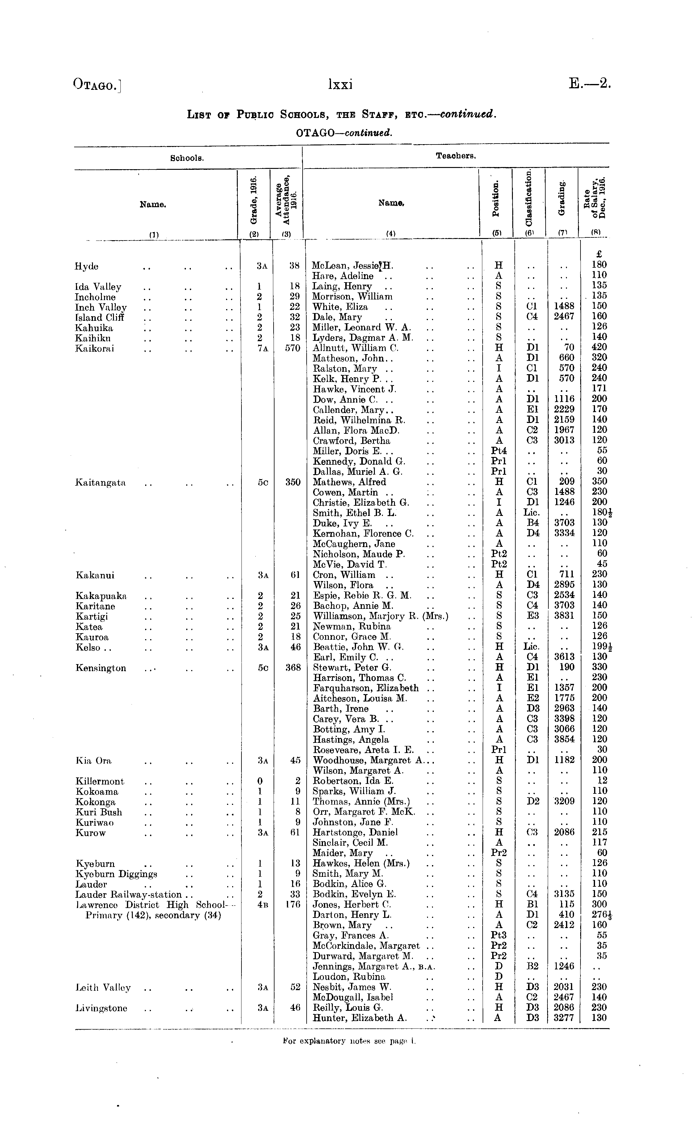 Schools. Teachers. Name. (1) T to _> I il ■ ■8 IIS a i (21 (3) Name, I i a o F* '_ o (51 n g A CJ i ca on A S 16' .9 a>53 _ _£ - A A a - 2 (SCO cj « OP (71 (B) (4) Hyde Ida Valley Inoholme Inch Valley Island Cliff Kahuika Kaihiku Kaikorai Kaitangata Kakanui Kakapuaka Karitane Kartigi Katea Kauroa Kelso 3a 38 1 18 2 29 1 22 2 32 2 23 2 18 7 a 570 3a 1 2 1 2 2 2 7a 50 3a 2 2 2 2 2 3a 350 61 21 26 25 21 18 46 McLean, JessieJH. Hare, Adeline Laing, Henry Morrison, William White, Eliza Dale, Mary Miller, Leonard W. A. Lyders, Dagmar A.M. Allnutt, William C. Matheson, John.. Ralston, Mary .. Kelk, Henry P. .. Hawke, Vincent J. Dow, Annie C. .. Callender, Mary.. Roid, Wilholmina R. Allan, Flora MacD. Crawford, Bertha Millor, Doris E. .. Kennody, Donald G. Dallas, Muriol A. G. Mathows, Alfred Cowen, Martin . . :. Christie, Elizaboth G. Smith, Ethol B. L. Duke, Ivy E. .. Kornohan, Florence 0. McOaughcrn, Jane Nicholson, Maude P. McVie, David T. Cron, William Wilson, Flora Espie, Rebie R. G. M. Bachop, Annie M. Williamson, Marjory B.. (Mrs.) Newman, Rubina Connor, Grace M. Beattie, John W. G. Earl, Emily C. .. Stewart, Peter G. Harrison, Thomas C. Farquharson, Elizaboth .. Aitcheson, Louisa M.. Barth, Irene Carey, Vera B. .. Botting, Amy I. Hastings, Angela Rosevoare, Areta I. E. Woodhouse, Margaret A... Wilson, Margaret A. Robertson, Ida E. Sparks, William J. Thomas, Annio (Mrs.) Orr, Margaret F. McK. .. Johnston, Jane F. Hartstongo, Daniel Sinclair, Cecil M. Maider, Mary Hawkes, Helen (Mrs.) Smith, Mary M. Bodkin, Alice G. Bodkin, Evelyn E. Jones, Horbert 0. Darton, Henry L. Brown, Mary Gray, Frances A. McCorkindale, Margaret .. Durward, Margaret M. Jennings, Margaret A., b.a. Loudon, Rubina Nesbit, James W. McDougall, Isabel Reilly, Louis G. Huntor, Elizabeth A. . * H A S S s s s s H A I A A A A A A A Pt4 Prl Prl H A I A A A A Pt2 Pt2 H A S S s s s H A H A I A A A A A Prl H A S S s s s H A Pr2 S s s s H A A Pt3 Pr2 Pr2 D D H A H A Cl 04 Dl Dl Cl Dl Dl El Dl C2 03 Cl C3 Dl Lie. B4 D4 Cl D4 C3 04 E3 1488 2467 70 660 570 570 1116 2229 2159 1967 3013 209 1488 1246 3703 3334 711 2895 2534 3703 3831 £ 180 110 135 . 135 150 160 126 140 420 320 240 240 171 200 170 140 120 120 55 60 30 350 230 200 1801 130 120 110 60 45 230 130 140 140 150 126 126 199! 130 330 230 200 200 140 120 120 120 30 200 110 12 110 120 110 110 215 117 60 126 110 110 150 300 160 55 35 35 Kensington 5o 368 Lie. 04 Dl El El E2 D3 03 03 C3 3613 190 1357 1775 2903 3398 3066 3854 Kia Ora 3a 45 bi 1182 Killermont Kokoama Kokonga Kuri Bush Kuriwao Kurow 0 1 1 1 1 3a 2 9 II 8 9 61 D2 3209 03 2086 Kyeburn Kyoburn Diggings Lauder Lauder Railway-station Lawrence District High SchoolPrimary (142), secondary (34) i 1 1 2 4b 13 9 16 33 176 04 Bl Dl 02 3135 115 410 2412 Leith Valley .. B2 1246 3a 3a 52 46 1)3 02 D3 1)3 2031 2467 2086 3277 230 140 230 130 Livingstone For e: xplanatory notes see page i.
