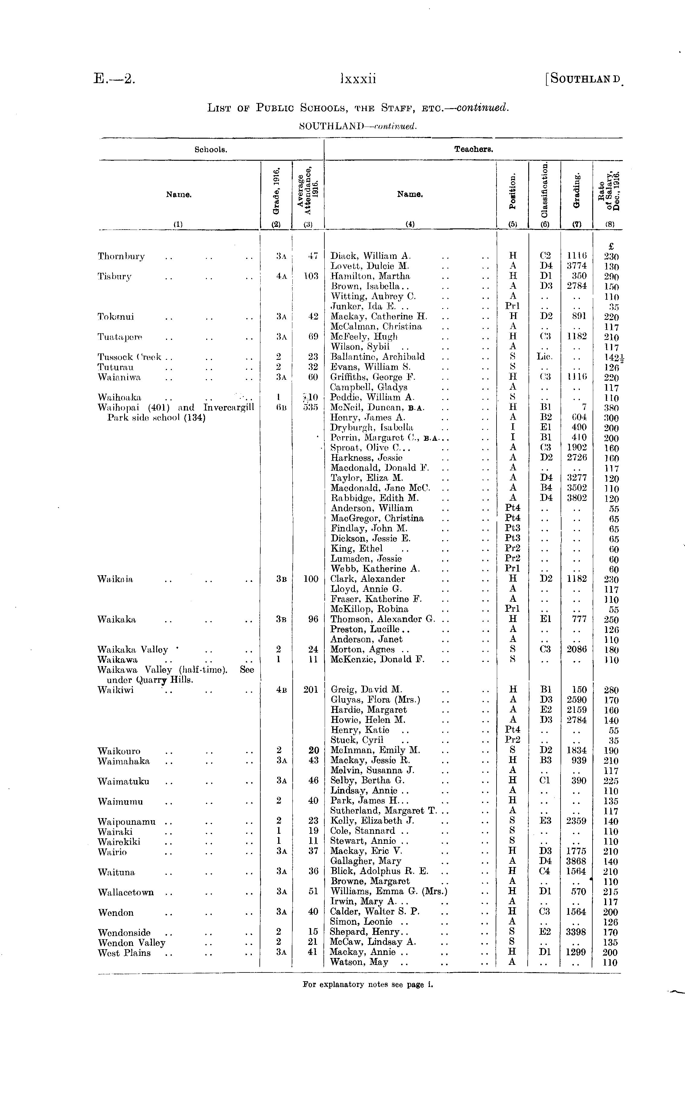 Schools. Teachers. Name. 5! ® ■D 2 E s CD c. *<3<£ _t "•J Name. -i o FH '- o Ph □ o _ A CJ •e '_ _ _ o (6) 3 'i i >■-© 03 CO « (1) (2) (3) (4) (») (7) (8) Thornbury Tisbury Tokanui Tuatapere Tussock Creek .. Tuturau Waianiwa Waihoaka .. .. Waihopai (401) and Invercargill Park side school (134) 3a 4a 3a 3a 2 2 3a 1 6b 47 103 42 69 23 32 60 _»_10 535 Diack, William A. Lovett, Dulcie M. Hamilton, Martha Brown, Isabella.. Witting, Aubrey 0. Junker, Ida E. Mackay, Catherine H. MoCalman, Christina McFeely, Hugh Wilson, Sybil Ballantine, Archibald Evans, William S. Griffiths, George F. Campbell, Gladys Pcddie, William A. McNeil, Duncan, B.A. Henry, James A. Dryburgh, Isabella Perrin, Margaret (!., B.A.. . Sproat, Olive 0... Harkness, Jossio Macdonald, Donald F. Taylor, Eliza M. Macdonald, Jane McO. .. Rabbidge, Edith M. Anderson, William MacGregor, Christina Findlay, John M. Dickson, Jessie E. King, Ethel Lumsdon, Jossie Webb, Kathorine A. Clark, Aloxandor Lloyd, Annie G. Fraser, Kathorino F. McKillop, Robina Thomson, Alexandor G. .. Preston, Lucille Anderson, Janet Morton, Agnes McKenzie, Donald F. H A H A A Prl II A II A S S H A S H A I I A A A A A A Pt4 Pt4 Pt3 Pt3 Pr2 Pr2 Prl H A A Prl H A A S S 02 D4 Dl D3 D2 03 Lie. 03 Bl B2 El Bl 03 D2 1116 3774 350 2784 891 1182 1116 7 604 490 410 1902 2726 £ 230 130 290 150 110 35 220 117 210 117 142 .V 126" 220 117 110 380 300 200 200 160 160 117 120 110 120 55 65 65 65 60 CO 60 230 117 110 55 250 126 110 180 110 D4 B4 D4 3277 3502 3802 Waikaia 3b 100 i)2 1182 Waikaka 3b 96 El 777 Waikaka Valley ■ Waikawa Waikawa Valley (half-time). under Quarry Hills. Waikiwi See 2 1 24 11 03 2086 4b 201 Greig, David M. Gluyas, Flora (Mrs.) Hardic, Margaret Howie, Helen M. Henry, Katie Stuck, Cyril Mclnman, Emily M. Mackay, Jessio R. Melvin, Susanna J. Selby, Bertha G. Lindsay, Annie Park, James H... Sutherland, Margaret T. .. Kelly, Elizabeth J. Cole, Stannard Stewart, Annio Mackay, Eric V. Gallagher, Mary Blick, Adolphus R. E. .. Browne, Margaret Williams, Emma G. (Mrs.) Irwin, Mary A. .. Calder, Walter S. P. Simon, Loonio Shepard, Henry McCaw, Lindsay A. Mackay, Annio Watson, May H A A A Pt4 Pr2 S H A H A H A S S s H A H A H A H A S S H A Bl D3 E2 D3 150 2590 2159 2784 280 170 160 140 55 35 190 210 117 225 110 135 117 140 110 110 210 140 210 110 215 117 200 126 170 135 200 110 Waikouro Waimahaka D2 B3 1834 939 2 3a 20 43 Waimatuku 3a 46 01 390 Waimumu 2 40 Waipounamu Wairaki Wairekiki Wairio 2 1 1 3a 23 19 11 37 E3 2359 D3 D4 04 1775 3868 1564 Waituna 3a 36 Wallacetown 3a 51 Dl 570 Wendon 3a 40 03 1564 Wcndonside Wendon Valley West Plains 2 2 3a 15 21 41 E2 3398 bi 1299 For e: .planatory notes see page i.