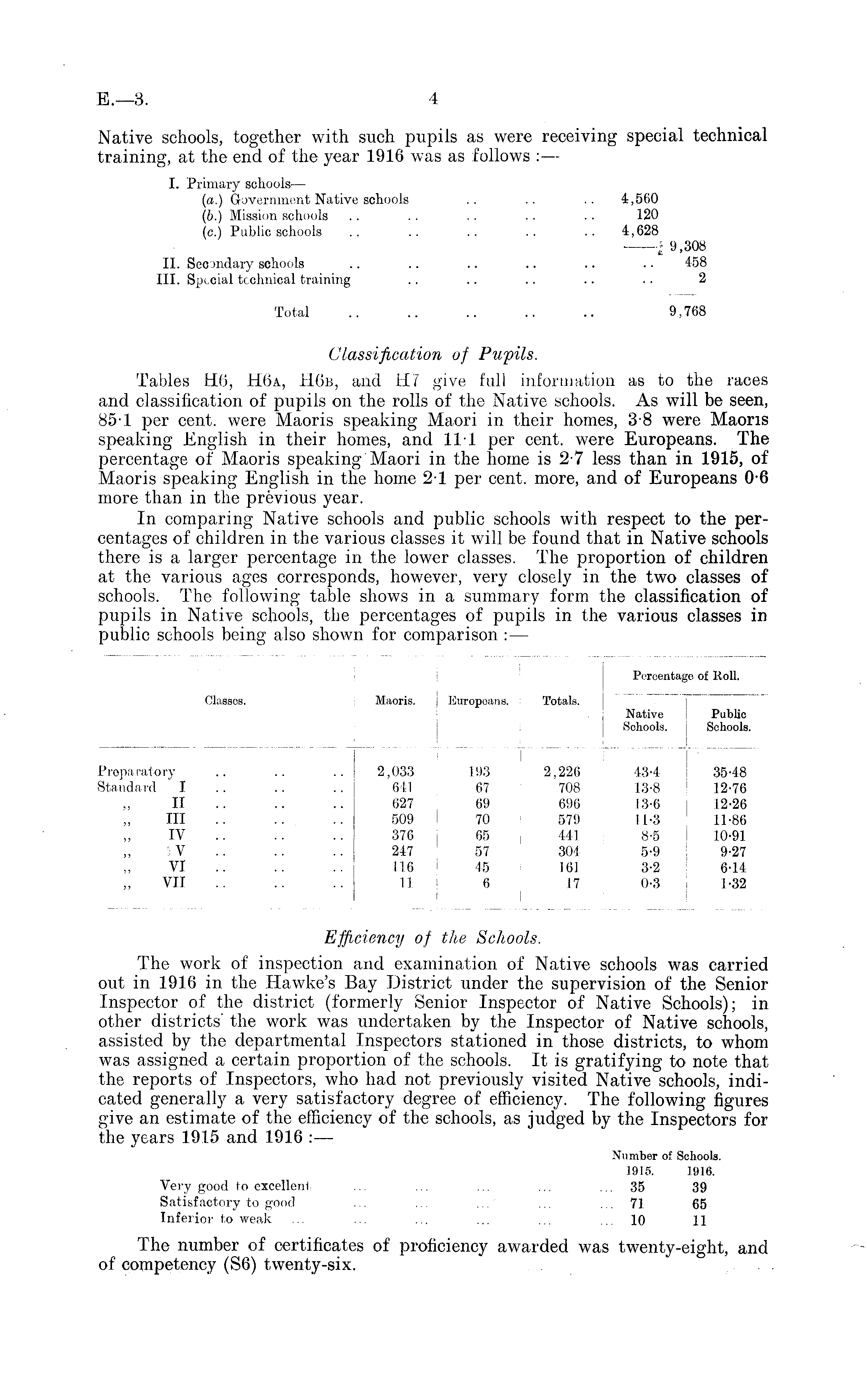 Efficiency of the Schools. The work of inspection and examination of Native schools was carried out in 1916 in the Hawke's Bay District under the supervision of the Senior Inspector of the district (formerly Senior Inspector of Native Schools); in other districts' the work was undertaken by the Inspector of Native schools, assisted by the departmental Inspectors stationed in those districts, to whom was assigned a certain proportion of the schools. It is gratifying to note that the reports of Inspectors, who had not previously visited Native schools, indicated generally a very satisfactory degree of efficiency. The following figures give an estimate of the efficiency of the schools, as judged by the Inspectors for the years 1915 and 1916 :— Number of Schools. 1915. 1916. Very good to excellent ... ... ... ... ... 35 39 Satisfactory to good ... ... ..." ... ... 71 65 Inferior to weak ... ... ... ... ... ... 10 11 The number of certificates of proficiency awarded was twenty-eight, and of competency (S6) twenty-six.