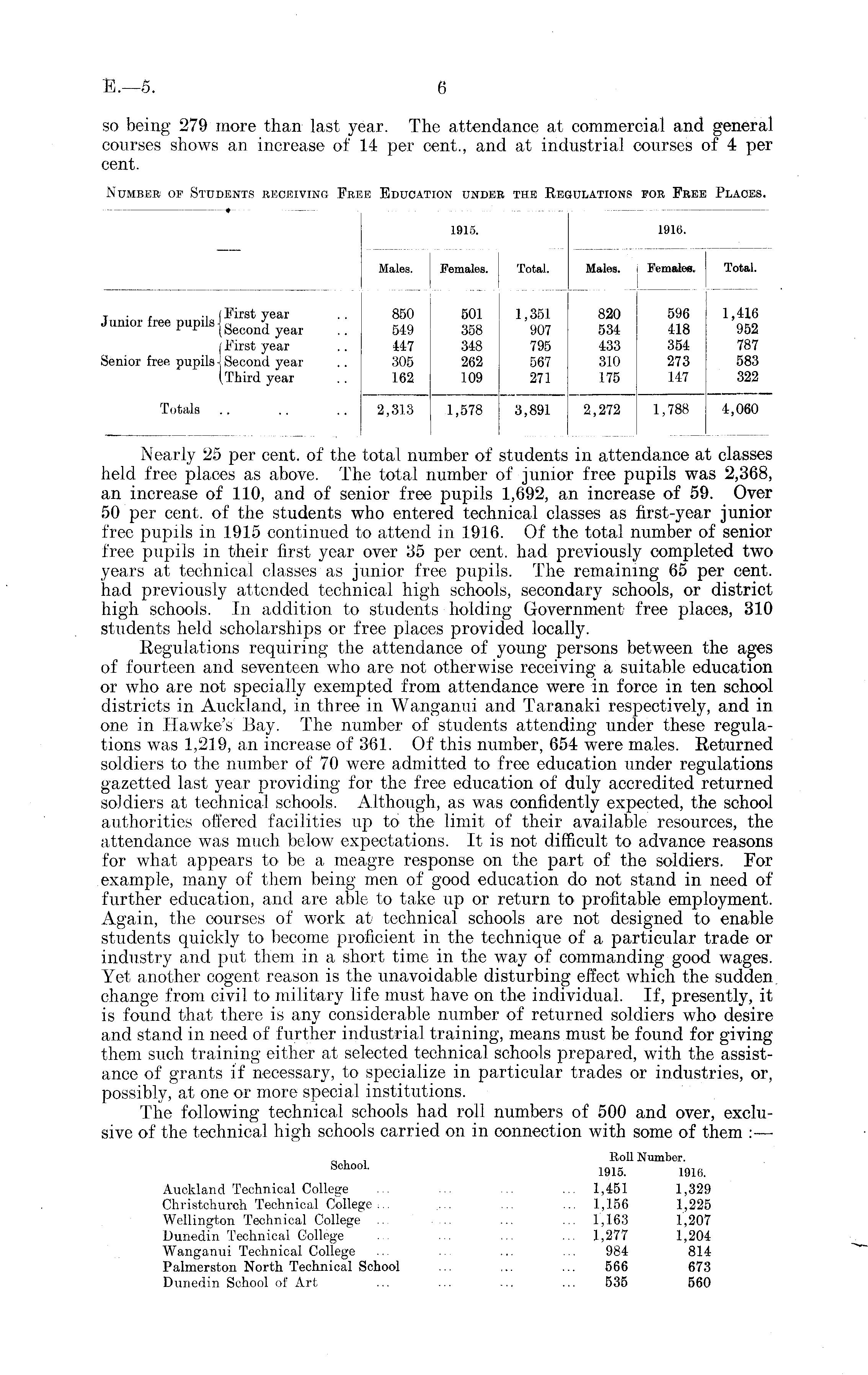 Nearly 25 per cent, of the total number of students in attendance at classes held free places as above. The total number of junior free pupils was 2,368, an increase of 110, and of senior free pupils 1,692, an increase of 59. Over 50 per cent, of the students who entered technical classes as first-year junior free pupils in 1915 continued to attend in 1916. Of the total number of senior free pupils in their first year over 35 per cent, had previously completed two years at technical classes as junior free pupils. The remaining 65 per cent, had previously attended technical high schools, secondary schools, or district high schools. In addition to students holding Government free places, 310 students held scholarships or free places provided locally. Regulations requiring the attendance of young persons between the ages of fourteen and seventeen who are not otherwise receiving a suitable education or who are not specially exempted from attendance were in force in ten school districts in Auckland, in three in Wanganui and Taranaki respectively, and in one in Hawke's Bay. The number of students attending under these regulations was 1,219, an increase of 361. Of this number, 654 were males. Returned soldiers to the number of 70 were admitted to free education under regulations gazetted last year providing for the free education of duly accredited returned soldiers at technical schools. Although, as was confidently expected, the school authorities offered facilities up to the limit of their available resources, the attendance was much below expectations. It is not difficult to advance reasons for what appears to be a meagre response on the part of the soldiers. For example, many of them being men of good education do not stand in need of further education, and are able to take up or return to profitable employment. Again, the courses of work at technical schools are not designed to enable students quickly to become proficient in the technique of a particular trade or industry and put them in a short time in the way of commanding good wages. Yet another cogent reason is the unavoidable disturbing effect which the sudden change from civil to military life must have on the individual. If, presently, it is found that there is any considerable number of returned soldiers who desire and stand in need of further industrial training, means must be found for giving them such training either at selected technical schools prepared, with the assistance of grants if necessary, to specialize in particular trades or industries, or, possibly, at one or more special institutions. The following technical schools had roil numbers of 500 and over, exclusive of the technical high schools carried on in connection with some of them : — _ , , Roll Number. boho ° l 1915. 1916. Auckland Technical College ... ... .... ... 1,451 1,329 Christchurch Technical College :.. ... ... ... 1,156 1,225 Wellington Technical College ... ... 1,163 1,207 Dunedin Technical College ... ... ... 1,277 1,204 Wanganui Technical College ... ... ... ... 984 814 Palmerston North Technical School ... ... ... 566 673 Dunedin School of Art ... ... ... ... 535 560