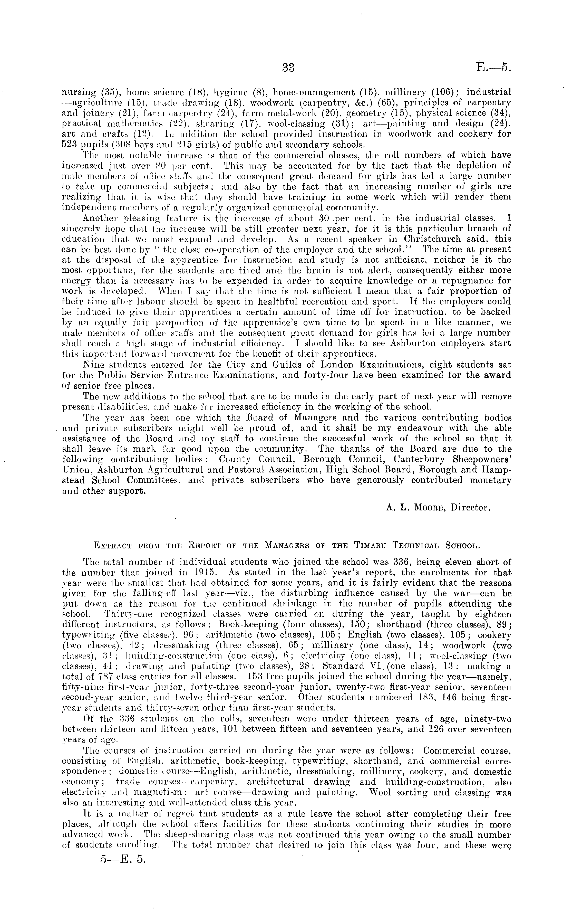 nursing (35), home science (18), hygiene (8), home-management (15), millinery (106); industrial —agriculture (15), trade drawing (18), woodwork, (carpentry, &c.) (65), principles of carpentry and joinery (21), farm carpentry (24), farm metal-work (20), geometry (15), physical science (34), practical mathematics (22), shearing (17), wool-classing (31); art—painting and design (24), art and crafts (12). In addition the school provided instruction in woodwork and cookery for 523 pupils (308 boys and 215 girls) of public and secondary schools. The most notable increase is that of the commercial classes, the roll numbers of which have increased just over 80 per cent. This may be accounted for by the fact that the depletion of male members of office si all's and the consequent great demand for girls has led a large number to take up commercial subjects; and also by the fact that an increasing number of girls are realizing that it is wise that they should have training in some work which will render them independent members of a regularly organized commercial community. Another pleasing feature is the increase of about 30 per cent, in the industrial classes. I sincerely hope that the increase will be still greater next year, for it is this particular branch of education that we must expand and develop. As a recent speaker in Christchurch said, this can be best done by " the close co-operation of the employer and the school." The time at present at the disposal of the apprentice for instruction and study is not sufficient, neither is it the most opportune, for the students are tired and the brain is not alert, consequently either more energy than is necessary has to be expended in order to acquire knowledge or a repugnance for work is developed. When I say that the time is not sufficient I mean that a fair proportion of their time after labour should be spent in healthful recreation and sport. If the employers could be induced to give their apprentices a certain amount of time off for instruction, to be backed by an equally fair proportion of the apprentice's own time to be spent in a like manner, we male members of office staffs and the consequent great demand for girls has led a large number shall reach a high stage of industrial efficiency. I should like to see Ashburton employers start this important forward movement for the benefit of their apprentices. Nine students entered for the City and Guilds of London Examinations, eight students sat for the Public Service Entrance Examinations, and forty-four have been examined for the award of senior free places. The new additions to the school that are to be made in the early part of next year will remove present disabilities, and make for increased efficiency in the working of the school. The year has been one which the Board of Managers and the various contributing bodies and private subscribers might well be proud of, and it shall be my endeavour with the able assistance of the Board and my staff to continue the successful work of the school so that it shall leave its mark for good upon the community. The thanks of the Board are due to the following contributing bodies : County Council, Borough Council, Canterbury Sheepowners' Union, Ashburton Agricultural and Pastoral Association, High School Board, Borough and Hampstead School Committees, and private subscribers who have generously contributed monetary and other support. A. L. Moore, Director. Extract from the Report of the Managers of the Timaru Technical School. The total number of individual students who joined the school was 336, being eleven short of the number that joined in 1915. As stated in the last year's report, the enrolments for that year were the smallest that had obtained for some years, and it is fairly evident that the reasons given for the falling-off last year —viz., the disturbing influence caused by the war—can be put down as the reason for the continued shrinkage in the number of pupils attending the school. Thirty-one recognized classes were carried on during the year, taught by eighteen different instructors, as follows: Book-keeping (four classes), 150; shorthand (three classes), 89; typewriting (five classes), 96; arithmetic (two classes), 105; English (two classes), 105; cookery (two classes), 42; dressmaking (three classes), 65; millinery (one class), 14; woodwork (two classes), 31 ; building-construction (one class), 6; electricity (one class), II ; Wool-classing (two classes), 41; drawing and painting (two classes), 28; Standard VI. (one class), 13: making a total of 787 class entries for all classes. 153 free pupils joined the school during the year —namely, fifty-nine first-year junior, forty-three second-year junior, twenty-two first-year senior, seventeen second-year senior, and twelve third-year senior. Other students numbered 183, 146 being firstyear students and thirty-seven other than first-year students. Of the 336 students on the rolls, seventeen were under thirteen years of age, ninety-two between thirteen and fifteen years, 101. between fifteen and seventeen years, and 126 over seventeen years of age. The courses of instruction carried on during the year were as follows: Commercial course, consisting of English, arithmetic, book-keeping, typewriting, shorthand, and commercial correspondence; domestic course —English, arithmetic, dressmaking, millinery, cookery, and domestic economy; trade courses—carpentry, architectural drawing and building-construction, also electricity and magnetism; art course —drawing and painting. Wool sorting and classing was also an interesting and well-attended class this year. It is a matter of regret that students as a rule leave the school after completing their free places, although the school offers facilities for these students continuing their studies in more advanced work. The sheep-shearing class was not continued this year owing to the small number of students enrolling, The total number that desired