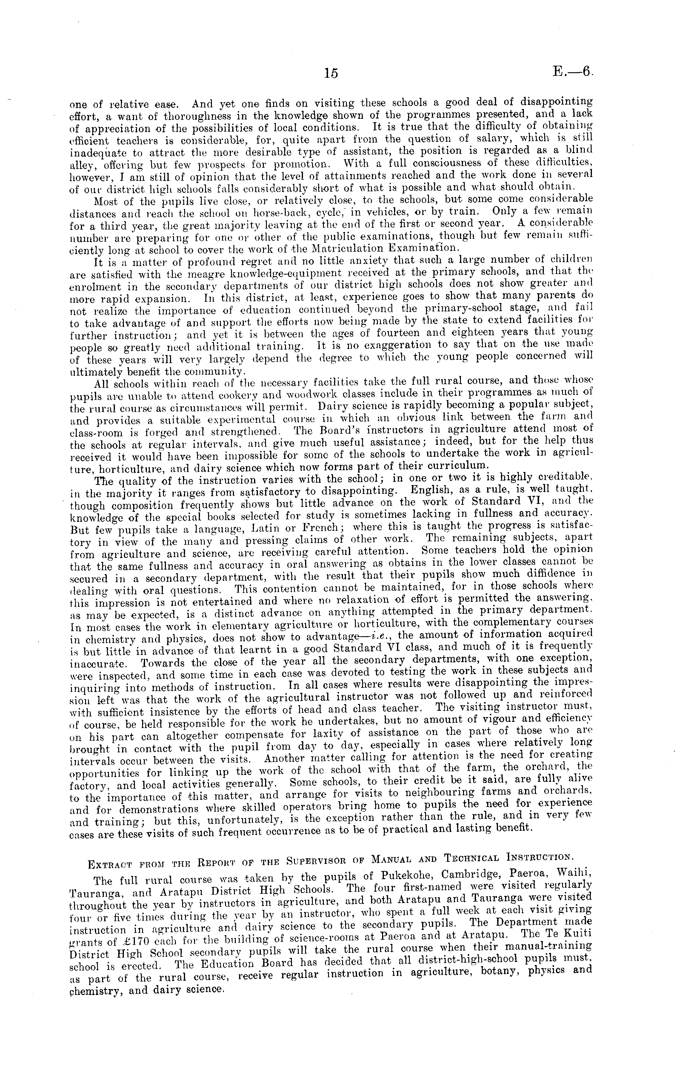 one of relative ease. And yet one finds on visiting these schools a good deal of disappointing effort, a want of thoroughness in the knowledge shown of the programmes presented, and a lack of appreciation of the possibilities of local conditions. It is true that the difficulty of obtaining efficient teachers is considerable, for, quite apart from the question of salary, which is still inadequate to attract the more desirable type of assistant, the position is regarded as a blind alley, offering but few prospects for promotion. With a full consciousness of these difficulties, however, I am still of opinion that the level of attainments reached and the work done in several of our district high schools falls considerably short of what is possible and what should obtain. Most of the pupils live close, or relatively close, to the schools, but some come considerable distances and reach the school on horse-back, cycle, in vehicles, or by train. Only a few remain for a third year, the great majority leaving at the end of the first or second year. A considerable number are preparing for one or other of the public examinations, though but few remain sufficiently long at school to cover the work of the Matriculation Examination. It is a matter of profound regret and no little anxiety that such a large number of children are satisfied with the meagre knowledge-equipment received at the primary schools, and that the enrolment in the secondary departments of our district high schools does not show greater and more rapid expansion. In this district, at least, experience goes to show that many parents do not realize the importance of education continued beyond the primary-school stage, and fail to take advantage of and support the efforts now being made by the state to extend facilities for further instruction; and yet it is between the ages of fourteen and eighteen years that young people so greatly need additional training. It is no exaggeration to say that on the use made of these years will very largely depend the degree to which the young people concerned will ultimately benefit the community. All schools within reach of the necessary facilities take the full rural course, and those whose pupils are unable to attend cookery and woodwork classes include in their programmes as much of the rural course as circumstances will permit. Dairy science is rapidly becoming a popular subject and provides a suitable experimental course in which an obvious link between the farm and class-room is forged and strengthened. The Board's instructors in agriculture attend most of the schools at regular intervals, and give much useful assistance; indeed, but for the help thus received it would have been impossible for some of the schools to undertake the work in agriculture horticulture, and dairy science which now forms part of their curriculum. The quality of the instruction varies with the school; in one or two it is highly creditable, in the majority it ranges from satisfactory to disappointing. English, as a rule, is well taught, though composition frequently shows but little advance on the work of Standard VI, and the knowledge of the special books selected for study is sometimes lacking in fullness and accuracy. Hut few pupils take a language, Latin or French; where this is taught the progresses satisfactory in view of the many and pressing claims of other work. The remaining subjects, apart from agriculture and science, are receiving careful attention. Some teachers hold the opinion that the same fullness and accuracy in oral answering as obtains m the lower classes cannot be secured in a secondary department, with the result that their pupils show much diffidence in dealin--- with oral questions, This contention cannot be maintained, for in those schools where this impression is not entertained and where no relaxation of effort is permitted the answering. as may be expected, is a distinct advance: on anything attempted in the primary department. In most cases the work in elementary agriculture or horticulture, with the complementary courses in chemistry and physics, does not show to advantage— i.e., the amount of information acquired is but little in advance of that learnt in a good Standard VI class, and much of it is frequently inaccurate. Towards the close of the year all the secondary departments, with one exception were inspected, and some time in each case was devoted to testing the work in these subjects and inquiring into methods of instruction. In all cases where results were disappointing the impression left was that the work of the agricultural instructor was not followed up and reinforced with sufficient insistence by the efforts of head and class teacher. The visiting instructor must, of course be held responsible for the work he undertakes, but no amount of vigour and efficiency on his part can altogether compensate for laxity of assistance on the part of those who are brought in contact with the pupil from day to day, especially in cases where relatively long intervals occur between the visits. Another matter calling for attention is the need tor creating opportunities for linking up the work of the school with that of the arm the orchard the airy, and local generally. Some schools, to their credit be it said, are fvdly &h ve to ib/importance of this matter, and arrange for visits to neighbouring farms and orohardi, and for demonstrations where skilled operators bring home to pupils the need for experience and training; but this, unfortunately, is the exception rather than the rule andl in very to, cases are these visits of such frequent occurrence as to be of practical and lasting benefit. Extract from the Report of the Supervisor of Manual and Technical Instruction. The full rural course was taken by the pupils of Pukekohe, Cambridge, Paeroa, Waihi, Taurnn K a andAratapu District High Schools. The four first-named were visited regularly throuSt theyear by instructors in agriculture, and both 