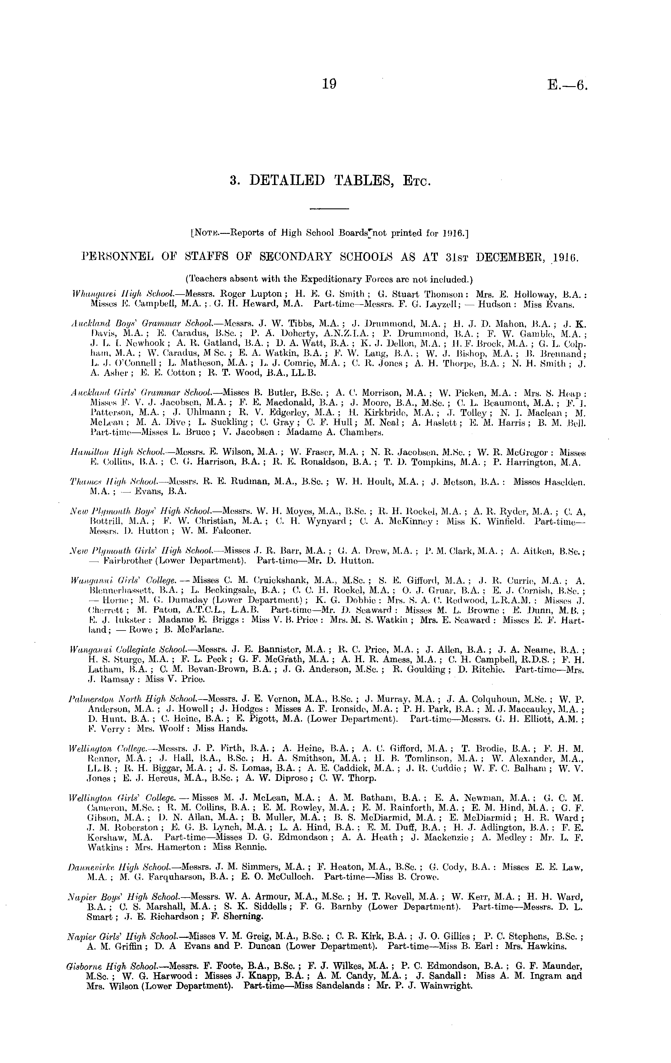 3. DETAILED TABLES, Etc. [Note. —Reports of High School Boards'not printed for J 916.] PERSONNEL OF STAFFS OF SECONDARY SCHOOLS AS AT 31st DECEMBER, .1916. (Teachers absent with the Expeditionary Forces arc not included.) Whatigarei High School. —Messrs. Roger Lupton ; H. E. G. Smith ; G. Stuart Thomson : Mrs. E. Holloway, B.A. : Misses E. Campbell, M.A. ;. O. H. Howard, M.A. Part-time —Messrs. F. G. Layzell; — Hudson : Miss Evans. Auckland Boys' Grammar School. —Messrs. J. W. Tibbs, M.A. ; J. Drummond, M.A. ; H. J. D. Mahon, B.A. ; J. K. Davis, M.A. ; E. Caradus, B.Se. ; I. A. Doherty, A.N.Z.I.A. ; P. Drummond, B.A. ; F. W. Gamble, M.A. j ,J. L. 1. Ncwhook ; A. R. Gatland, B.A. ; D. A. Watt, B.A. ; K. J. Dellon, MA. ; 11. F. Brock, M.A. ; G. L. Colpham, M.A. j W. Caradus, M Sc. ; E. A. Watkin, B.A. ; F. W. Lang, B.A. ; W. J. Bishop, M.A. ; B. Brennand; L ,1. O'Comiell; L. Matheson, M.A. ; L. J. Comrio, M.A. ; C. R. Jones ; A. H. Thorpe, B.A. ; N. H. Smith ; J. A. Asher ; E. E. Cotton ; R. T. Wood, 8.A., LL.B. Auckland airh' Grammar School. —Misses B. Butler, B.Sc. ; A. ('. Morrison, M.A. ; W. Picken, M.A. : Mrs. S. Heap : Misses F. V. J. Jacobsen, M.A. ; F. E. Macdonald, B.A. ; J. Moore, 8.A., M.Sc. ; 0. L. Beaumont, M.A. ; F. 1. Patterson, M.A. ; J. Uhhnann; R. V. Edgorley, M.A. ; H. Kirkbride, M.A. ;J. Tolley; N. I. Maclean; M. McLean; M. A. Dive; L. Suckling; 0. Gray; C. F. Hull; M. Ncal; A. Haslett; E. M. Harris; B. M. Bell. Part-time—Misses L. Bruce ; V. Jacobsen : Madame A. Chambers. Hamilton High Scliool. —Messrs. E. Wilson, M.A. ; W. Frasor, M.A. ; N. R. Jacobsen, M.Sc. ; W. R. McGregor : Misses I-:. Collins, B.A. ; C. C. Harrison, B.A. ; R. E. Ronaldson, B.A. ; T. D. Tompkins, M.A. ; P. Harrington, M.A. Thames High Scliool —Messrs. R. E. Rudman, M.A., B.Se. ; W. H. Hoult, M.A. ; J. Metson, B.A. : Missos Haselden. M.A. ;'— Evans, B.A. New Plymouth Boys' High School.— Messrs. W. 11. Moyos, M.A., B.Se. ; R. H, Rockel, M.A. ; A. R. Ryder, M.A. ; C. A, Bottrill, M..A. ; V. W. Christian, M.A. ; (J. H. Wynyard; C. A. McKinney : Miss K. Wintield. Part-time-Messrs. I). Hutton ; W. M. Falconer. New Plymouth GirW High School.— Misses J. R. Barr, M.A. ; G. A. Drew, M.A. ; P. M. Clark, M.A. ; A. Aitkon, B.Se.; — Fairbrother (Lower Department). Part-time —Mr. D. Hutton. Wanganui Girls' College. —Misses C. M. Cruickshank, M.A., M.Se. ; S. E. Gilford, M.A. ; J. R. Currie, M.A. ; A. Bleiinorhassett, B.A. ; L. Beckingsale, B.A. ; 0. C. H. Rockel, M.A. ; 0. J. Gruar, B.A. ; E. J. Cornish, B.Sc. ; — Home; M. G. Dumsday (Lower Department) ; K. G. Dobbie : Mrs. S. A. C. Redwood, L.R.A.M. : Misses J. Cherrett; M. Paton, A.T.C.L., L.A.B. Part-time—Mr. D. Seaward: Misses M. L. Browne; E. Dunn, .MB.; E. J. Inkster : Madame E. Briggs : Miss V. B. Price : Mrs. M. S. Watkin ; Mrs. E. Seaward : Misses E. F. Earlland ; — Rowe ; B. McFarlane. Wanganui Collegiate School. —Messrs. J. E. Bannister, M.A. ; R. C. Price, M.A. ; J. Allen, B.A. ; J. A. Neame, B.A. ; H. S. Sturgo, M.A. ; F. L. Pock ; G. F. McGrath, M.A. ; A. H. R. Amess, M.A. ; 0. H. Campbell, R.D.S. ; F. H. Latham, B.A. ;C. M. Bevan-Brown, B.A. ; J. G. Anderson, M.Se. ; R. Goulding ;D. Ritchie. Part-time—Mrs. J. Ramsay : Miss V. Price. Palmerston North High School. —Mossrs. J. E. Vernon, M.A., B.Sc. ; J. Murray, M.A. ; J. A. Colquhoun, M.Se. ; W. P. Anderson, M.A. ; J. Howell; J. Hodges : Misses A. F. Ironside, M.A. ;P. H. Park, B.A. ;M. J. Maceauley, M.A. ; D. Hunt, B.A. ; C. Heine, B.A. ; E. Pigott, M.A. (Lower Department). Part-time—Messrs. C. H. Elliott, A.M. ; F. Verry : Mrs. Woolf : Miss Hands. Wellington College.— Messrs. J. P. Firth, B.A. ; A. Heine, B.A. ; A. C. Gifford, M.A. ; T. Brodie, B.A. ; F. H. M. Renner, M.A. ; J. Hall, 8.A., B.Sc. ; H. A. Smithson, M.A. ; 11. B. Tomlinson, M.A. ; W. Alexander, M.A., LL.B. ; R. H. Biggar, M.A. ; J. S. Lomas, B.A. ; A. E. Caddick, M.A. ; J. R. Cuddie ; W. F. C. Balham ; W. V. Jones ; E. J. Herous, M.A., B.Sc. ; A. W. Diproso ; C. W. Thorp. Wellington Girls' College. — Misses M. J. McLean, M.A. ; A. M. Batham, B.A. ; E. A. Newman, M.A. ; G. C. M. Cameron, M.Sc. ; R. M. Collins, B.A. ; E. M. Rowley, M.A. ; E. M. Rainforth, M.A. ; E. M. Hind, M.A. ; G. F. Gibson, M.A. ; D. N. Allan, M.A. ; B. Muller, M.A". ; B. S. McDiarmid, M.A. ;E. McDiarmid ; H. R. Ward; J. M. Robcrston; E. G. B. Lynch, M.A. ; L. A. Hind, B.A. ;E. M:. Duff, B.A. ;H. J. Adlington, B.A. ;F. E. Kershaw, M.A. Part-time—Misses D. G. Edmondson ; A. A. Heath; J. Maokenzie; A. Medley: Mr. L. F. Watkins : Mrs. llamerton : Miss Rennie. Danneoirke, High, School. —Messrs. J. M. Simmers, M.A. ; F. Heaton, M.A., B.Se. ; G. Cody, B.A. : Misses E. E. Law, M.A. ;M. G. Farquharson, B.A. ; E. O. McCulloch. Part-time—Miss B. Crowe. Napier Boys' High School— Messrs. W. A. Armour, M.A., M.Sc. ; H. T. Revell, M.A. ; W. Kerr, M.A. ; H. H. Ward, B.A. ; C. S. Marshall, M.A. ; S. K. Siddells ;F. G. Barnby (Lower Department). Part-time—Messrs. D. L. Smart; J. E. Richardson ;F. Sherning. Napier Girls' High School —Misses V. M. Greig, M.A., B.Se. ; C. R. Kirk, B.A. ; J. 0. Gillies ; P. C. Stephens, B.Se. ; A. M. Griffin; D. A Evans and P. Duncan (Lower Department). Part-time—Miss B. Earl: Mrs. Hawkins. Gisborne High School —Messrs. F. Foote, 8.A., B.Sc. ; F. J. Wilkes, M.A. ; P. C. Edmondson, B.A. ; G. F. Maunder, M.Sc. ; W. G. Harwood: Misses J. Knapp, B.A. ;A. M. Candy, M.A. ; J. Sandall: Miss A. M. Ingram and Mrs. Wilson (Lower Department). Part-time—Miss Sandelands : Mr. P. J. Wainwright.
