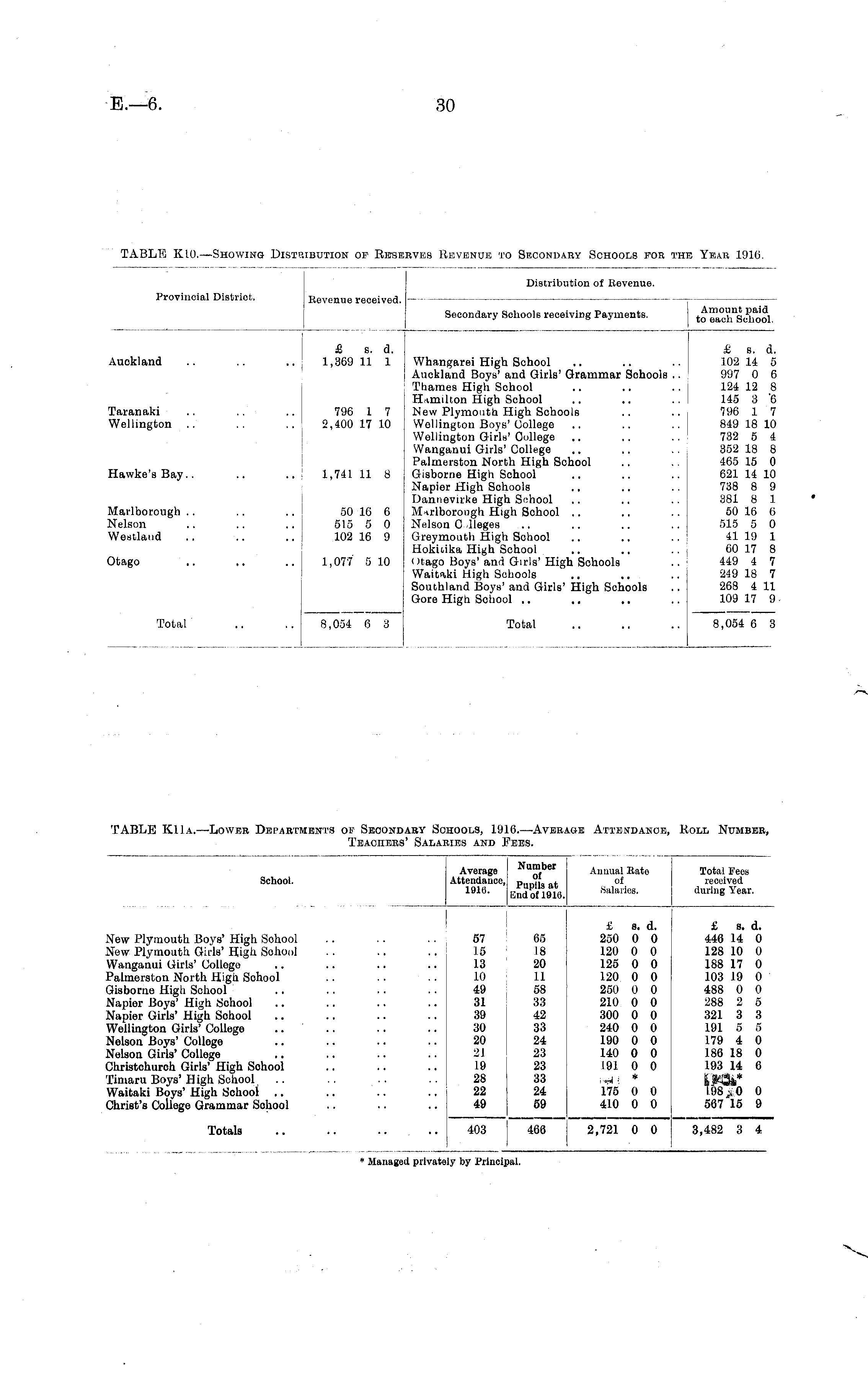 TABLE K10.—Showing Distribution of Reserves Revenue to Secondary Schools for the Year 1916.