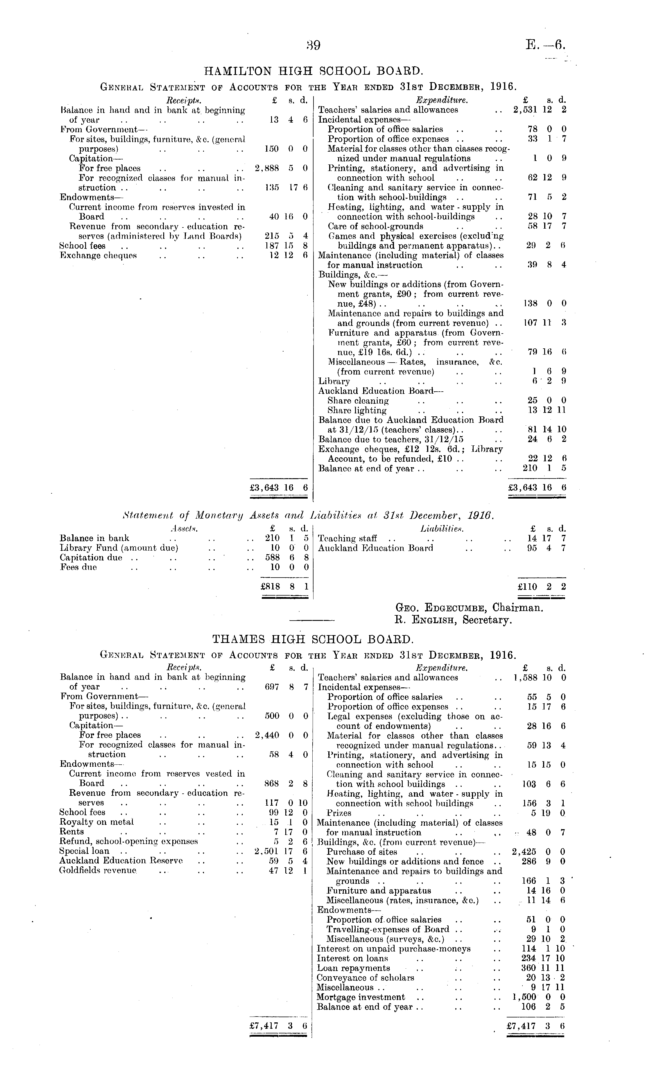 HAMILTON HIGH SCHOOL BOARD. Genehal Statement of Accounts for the Yeab ended 31st December, 1916. Receipts. £ s. d. Expenditure. £ s. d. Balanoe in hand and in bank at. beginning Teachers' salaries and allowances .. 2,531 12 2 of year .. . . .. . . 13 4 6 Incidental expenses— From Government — Proportion of office salaries .. .. 78 0 0 For sites, buildings, furniture, &o. (general Proportion of office expenses .. .. 33 1 7 purposes) . . . . . . 150 0 0 Material for classes other than classes recogCapitation— nizod under manual regulations .. 10 9 For free places .. .. . . 2,888 5 0 Printing, stationery, and advertising in For recognized classes for manual, in- connection with school .. .. 62 12 9 struction .. . . . . . . 135 17 6 Cleaning and sanitary service in conneeEndowments — tion with school-buildings . . . . 71 5 2 Current income from reserves invested in I ieating, lighting, and. water - supply in Board . . . . . . . . 40 16 0 connection with school-buildings .. 28 10 7 Revenue from secondary - education re- Care of school-grounds .. . . 58 17 7 sorves (administered by Land Boards) 215 5 4 Games and physical exercises (exolud'ng School fees .. .. .. .. 187 15 8 buildings and permanent apparatus). . 29 2 8 Exchange cheques .. .. .. 12 12 6 Maintenance (including material) of classes for manual instruction . . . . 39 8 4 Buildings, &o,— New buildings or additions (from Government grants, £90 ; from current revenue, £48) . . . . . . .. 1 38 0 0 Maintenance and repairs to buildings and and grounds (from ourrent revenue) .. 107 ll 8 Furniture and apparatus (from Government grants, £60 ; from current revenue, £19 16s. (id.) .. .. .. 79 16 6 Miscellaneous — Rates, insurance, itc. (from current revenue) .. . . 16 9 Library .. .. . . . . 6 2 9 Auckland Education Board—Share cleaning .. .. .. 25 0 0 Share lighting .. . . .. 13 12 1.1 Balance duo to Auckland Education Board at 31/12/15 (teachers'classes).. .. 81 14 10 Balanoe due to teachers, 31/12/15 . . 24 6 2 Exchange cheques, £12 12s. (id.; Library Account, to be refunded, £10 . . .. 22 12 6 Balance at end of year . . . . . . 210 1 5 £3,643 16 6 £3,643 16 6 Statement of Monetary Assets and Liabilities at 31st December, 1916. Assets. £ s. d. Liabilities. £ s. d. Balance in bank .. .. .. 210 I. 5 Teaching staff .. .. .. .. 14 17 7 Library Fund (amount due) . . .. 10 0 0 Auckland Education Board .. . . 95 4 7 Capitation due . . .. .. .. 588 6 8 Fees due .. .. .. 10 0 0 £818 8 1 £110 2 2 Geo. Edgecumbe, Chairman. R. English, Secretary.