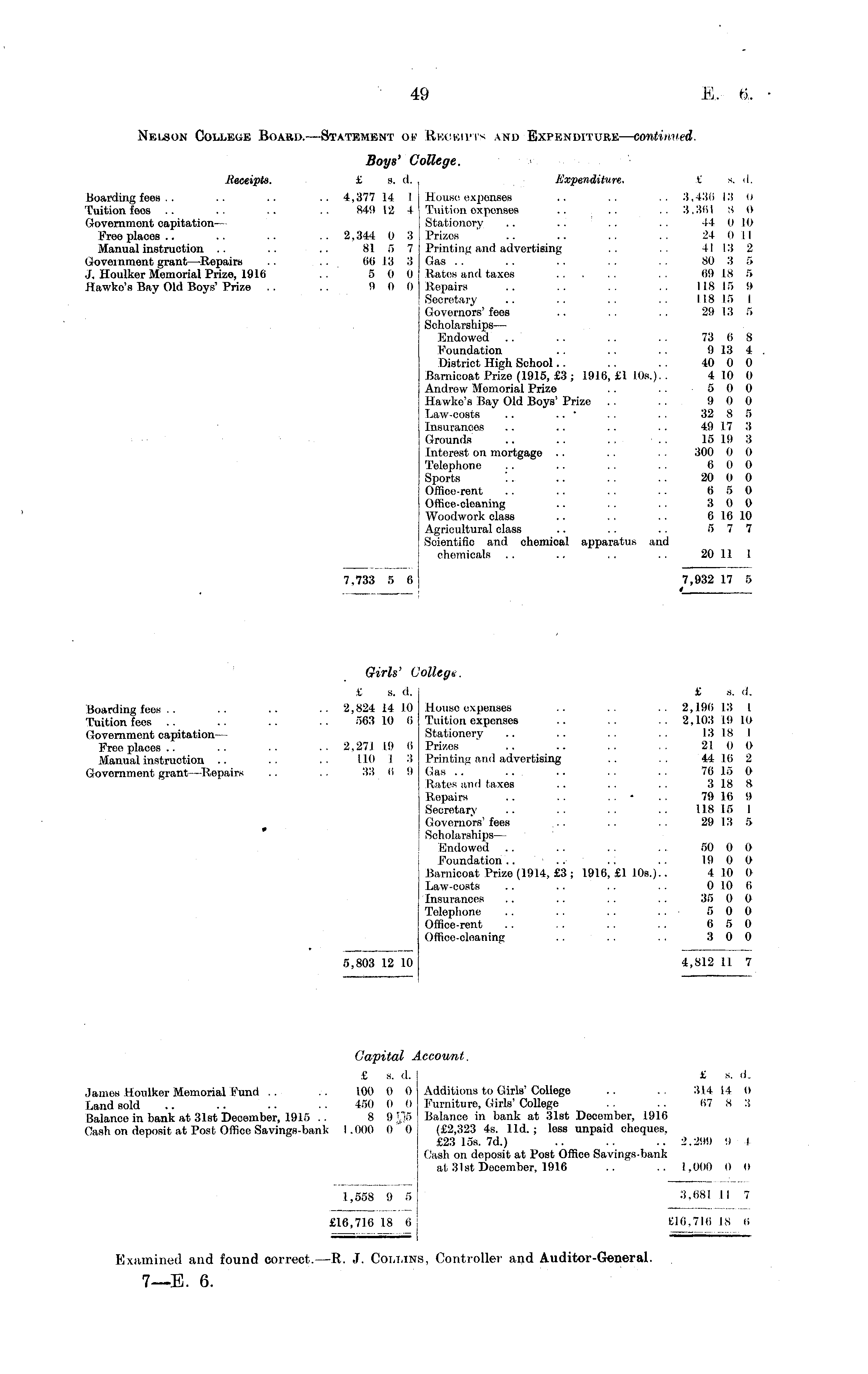 Nelson College Board. —Statement of Receipts and Expenditure— continued. Boys' College. Receipts. £ s. d. Expenditure. £ s. d. Boarding fees .. .. .. .. 4,377 14 I House expenses .. .. 3,436 13 0 Tuition fees .. .. .. .. 849 12 4 Tuition oxpenses . . .. .. 3.361 8 0 Govemmont capitation— Stationery .. .. .. .. 44 010 Free places.. .. .. .. 2,344 0 3 Prizes .. .. .. 24 011 Manual instruction .. .. .. 81 5 7 Printing and advertising .. +1 13 2 Government grant—Repairs .. .. 66 13 3 Gas .. .. .. . . .. SO 3 5 J. Houlker Memorial Prize, 1916 .. 5 0 0 Rates and taxes . . 69 18 5 Hawke's Bay Old Boys' Prize .. .. 9 0 0 Repairs .. 118 15 9 Secretary .. .. .. .. 118 15 I Governors'fees .. .. .. 29 13 5 Scholarships— Endowed .. .. .. .. 73 6 8 Foundation .. .. 9 13 4 District High School.. .. .. 40 0 0 Bamicoat Prize (1915, £3 ; 1916, £1 10s.). . 4 10 0 Andrew Memorial Prize .. .. 5 0 0 Hawke's Bay Old Boys' Prize . . . . 9 0 0 Law-costs .. .. ■ . . . . 32 8 5 Insurances .. .. . . 49 17 3 Grounds .. .. .. .. 15 19 3 Interest on mortgage .. .. . . 300 0 0 Telephone .. .. . . . . 6 0 0 Sports "... .. . . 20 0 0 Office-rent .. .. . . . . 6 5 0 Office-cleaning .. . . . . 3 0 0 Woodwork class .. .. .. 6 16 10 Agricultural class .. .. .. 5 7 7 Scientific and chemical apparatus and chemicals .. .. . . . . 20 11 I 7,733 5 6 7,932 17 5 Girls' Collegt. £ s. d. £ s. d. Boarding fees . . .. .. .. 2,824 14 10 House expenses .. .. .. 2,196 13 I Tuition fees .. .. .. .. 563 10 6 Tuition expenses .. .. 2,103 19 10 Government capitation— Stationery .. .. .. .. 13 18 1 Freo places.. .. .. .. 2,271 19 6 Prizes .. .. .. 21 0 0 Manual instruction .. .. HO I ■> Printing and advertising .. 44 16 2 Government grant —Repairs .. . . 33 6 9 Gas .. .. .. . . . . 76 15 0 Rates and taxes .. . . . . 3 18 8 Repairs .. .. . . • .. 79 16 9 Secretary .. .. .. .. 118 15 1 Governors' fees . . . . 29 13 5 Scholarships— Endowed .. . . . . 50 0 0 Foundation.. .. .. .. 19 0 0 Bamicoat Prize (1914, £3; 1916, £1 105.).. 4 10 0 Law-costs .. .. .. .. 010 6 Insurances .. .. . . .. 35 0 0 Telephone . . . . . . ■ 5 0 0 Office-rent .. .. .. 6 5 0 Office-cleaning . . . . .. 3 0 0 5,803 12 10 4,812 11 7 Capital Account. £ s. d. £ s. d. James Houlker Memorial Fund .. .. 100 0 0 Additions to Girls' College .. .. 314 14 0 Land sold .. .. .. .. 450 0 0 Furniture, Girls' College . . .. 67 8 3 Balance in bank at 31st December, 1915 .. 8 9 ','"5 Balance in bank at 31st December, 1916 Cash on deposit at Post Office Savings-bank 1.000 0 0 (£2,323 4s. lid.; less unpaid cheques, £23 15s. 7d.) .. .. .. 2.299 '.) I Cash on deposit at Post Office Savings-bank at 31st December, 1916 .. .. 1,000 0 0 5 3,681 11 7 £16,716 18 6 £16.716 IS ti Examined and found correct. —R. J. Collins, Controller and Auditor-General.