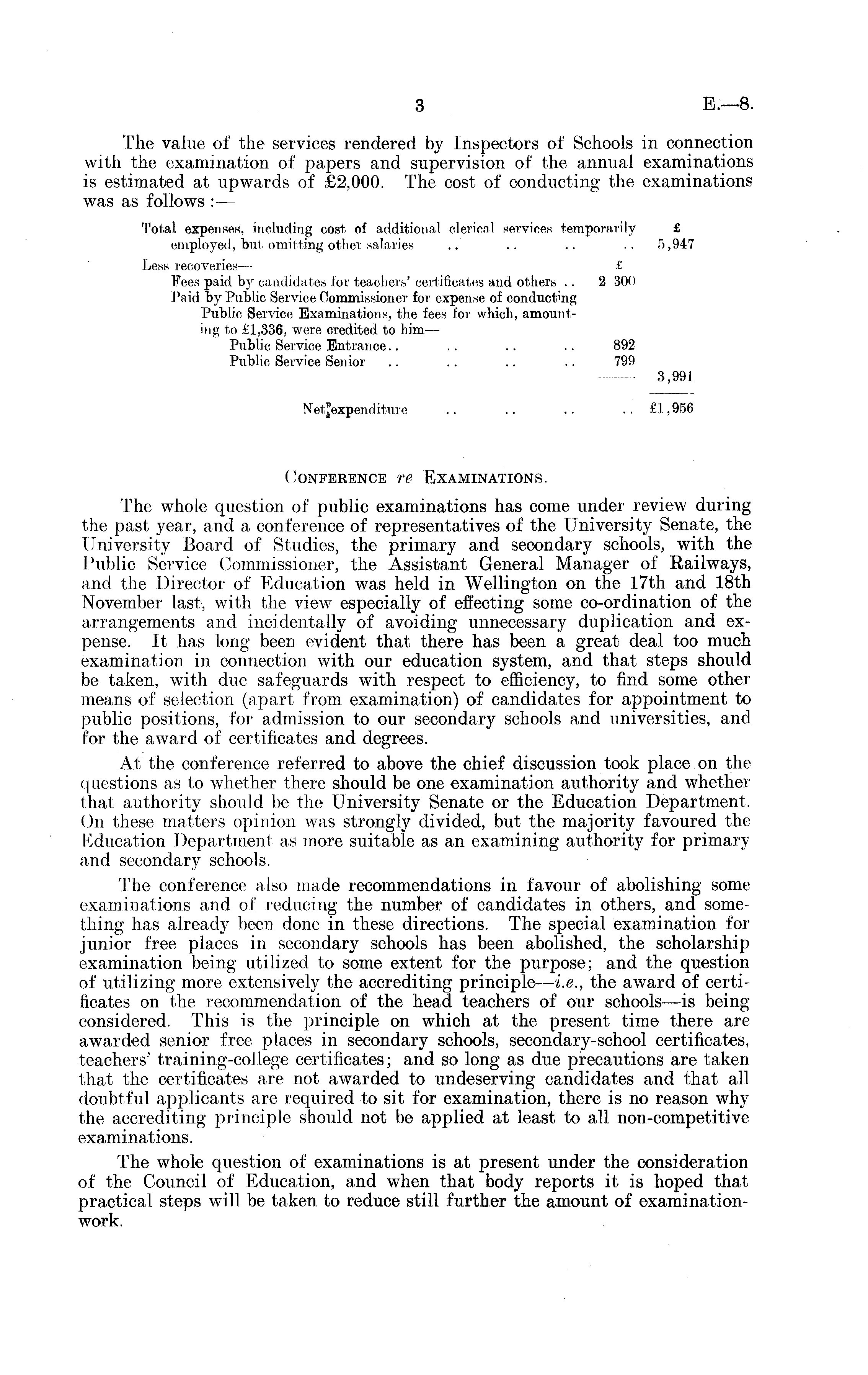 The value of the services rendered by Inspectors of Schools in connection with the examination of papers and supervision of the annual examinations is estimated at upwards of £2,000. The cost of conducting the examinations was as follows : — Total expenses, including cost of additional clerical services temporarily £ employed, but omitting other salaries .. .. .. .. 5,947 Less recoveries— £ Fees paid by candidates for teachers' certificates and others .. 2 300 Paid by Public Service Commissioner for expense of conducting Public Service Examinations, the fees for which, amounting to £1,336, were credited to him— Public Service Entrance.. .. .. .. 892 Public Service Sen ior .. .. .. .. 799 3,991 Netjexpenditure .. .. .. .. £1,956 Conference re Examinations. The whole question of public examinations has come under review during the past year, and a conference of representatives of the University Senate, the University Board of Studies, the primary and secondary schools, with the Public Service Commissioner, the Assistant General Manager of Railways, and the Director of Education was held in Wellington on the 17th and 18th November last, with the view especially of effecting some co-ordination of the arrangements and incidentally of avoiding unnecessary duplication and expense. It has long been evident that there has been a great deal too much examination in connection with our education system, and that steps should be taken, with due safeguards with respect to efficiency, to find some other means of selection (apart from examination) of candidates for appointment to public positions, for admission to our secondary schools and universities, and for the award of certificates and degrees. At the conference referred to above the chief discussion took place on the questions as to whether there should be one examination authority and whether that authority should be the University Senate or the Education Department. On these matters opinion was strongly divided, but the majority favoured the Education Department as more suitable as an examining authority for primary and secondary schools. The conference also made recommendations in favour of abolishing some examinations and of reducing the number of candidates in others, and something has already been done in these directions. The special examination for junior free places in secondary schools has been abolished, the scholarship examination being utilized to some extent for the purpose; and the question of utilizing more extensively the accrediting principle— i.e., the award of certificates on the recommendation of the head teachers of our schools—is beingconsidered. This is the principle on which at the present time there are awarded senior free places in secondary schools, secondary-school certificates, teachers' training-college certificates; and so long as due precautions are taken that the certificates are not awarded to undeserving candidates and that all doubtful applicants are required to sit for examination, there is no reason why the accrediting principle should not be applied at least to all non-competitive examinations. The whole question of examinations is at present under the consideration of the Council of Education, and when that body reports it is hoped that practical steps will be taken to reduce still further the amount of examinationwork.