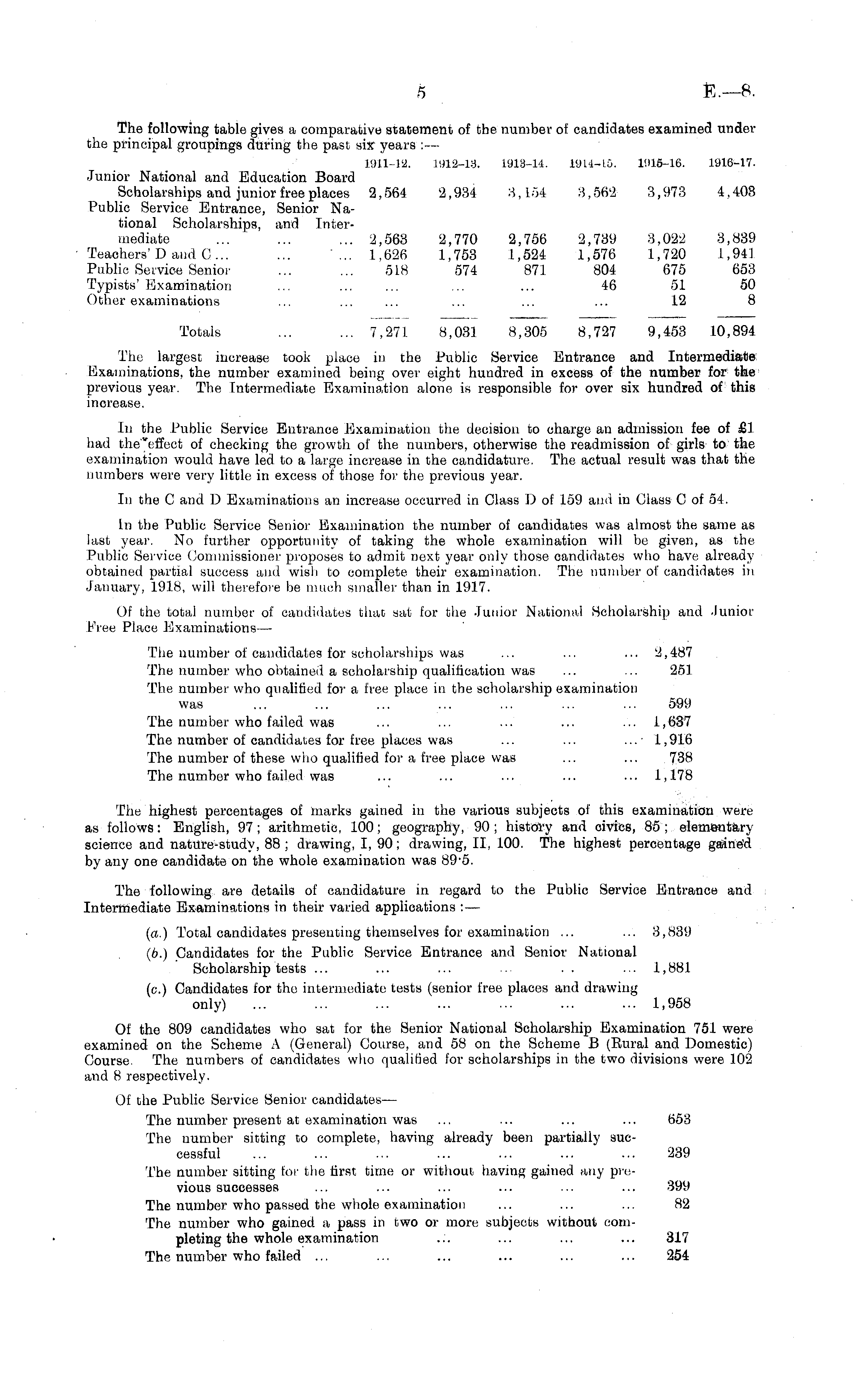 The following table gives a comparative statement of the number of candidates examined under the principal groupings during the past six years : — 1911-IU. 1912-18. 1918-14. 1914-18. 1015-16. 1916-17. Junior National and Education Board Scholarships and junior free places 2,564 2,934 3,154 3,562 3,973 4,408 Public Service Entrance, Senior National Scholarships, and Intermediate ... ' ... ... 2,563 2,770 2,756 2,739 3,022 3,839 Teachers' D and C... ... "... 1,626 1,753 1,524 1,576 1,720 .1,941 Public Service Senior ... ... 518 574 871 804 675 653 Typists'Examination ... ... ... ... ... 46 51 50 Other examinations ... ... ... ... ... ... 12 8 Totals ... ... 7,271 8,031 8,305 8,727 9,453 10,894 The largest increase took place in the Public Service Entrance and Intermediate Examinations, the number examined being over eight hundred in excess of the number for the previous year. The Intermediate Examination alone is responsible for over six hundred of this increase. In the Public Service Entrance Examination the decision to charge an admission fee of £1 had the'effect of checking the growth of the numbers, otherwise the readmission of girls to the examination would have led to a large increase in the candidature. The actual result was that the 11umbers were very little in excess of those for the previous year. In the C and D Examinations an increase occurred in Class D of 159 and in Class C of 54. In the Public Service Senior Examination the number of candidates was almost the same as last year. No further opportunity of taking the whole examination will be given, as the Public Service Commissioner proposes to admit next year only those candidates who have already obtained partial success and wish to complete their examination. The number of candidates in January, 1918, will therefore be much smaller than in 1917. Of the total number of candidates that sat for the Junior National Scholarship and Junior Eree Place Examinations— The number of candidates for scholarships was ... ... ... 2,487 The number who obtained a scholarship qualification was ... ... 251 The number who qualified for a free place in the scholarship examination was ... ... ... ... ... ... ... 599 The number who failed was ... ... ... ... ... 1,637 The number of candidates for free places was ... ... ...• 1,916 The number of these who qualified for a free place was ... ... 738 The number who failed was ... ... ... ... ... 1,178 The highest percentages of marks gained in the various subjects of this examination were as follows: English, 97; arithmetic, 100; geography, 90; history and civics, 85; elementary science and nature-study, 88 ; drawing, I, 90; drawing, 11, 100. The highest percentage gained by any one candidate on the whole examination was 89'5. The following are details of candidature in regard to the Public Service Entrance and Intermediate Examinations in their varied applications : — (a.) Total candidates presenting themselves for examination ... ... 3,839 (6.) Candidates for the Public Service Entrance and Senior National Scholarship tests ... ... ... ... . . ... 1,881 (c.) Candidates for the intermediate tests (senior free places and drawing only) ... ... ... ... ... ... ... 1,958 Of the 809 candidates who sat for the Senior National Scholarship Examination 751 were examined on the Scheme A (General) Course, and 58 on the Scheme B (Rural and Domestic) Course. The numbers of candidates who qualified for scholarships in the two divisions were 102 and 8 respectively. Of the Public Service Senior candidates-— The number present at examination was ... ... ... ... 653 The number sitting to complete, having already been partially successful ... ... ... ... ... ... ... 239 The number sitting for the first time or without having gained any previous successes ... ... ... ... ... ... 399 The number who passed the whole examination ... ... ... 82 The number who gained a pass in two or more subjects without completing the whole examination ... ... ... ... 317 The number who failed ... ... ... ... ... ... 254