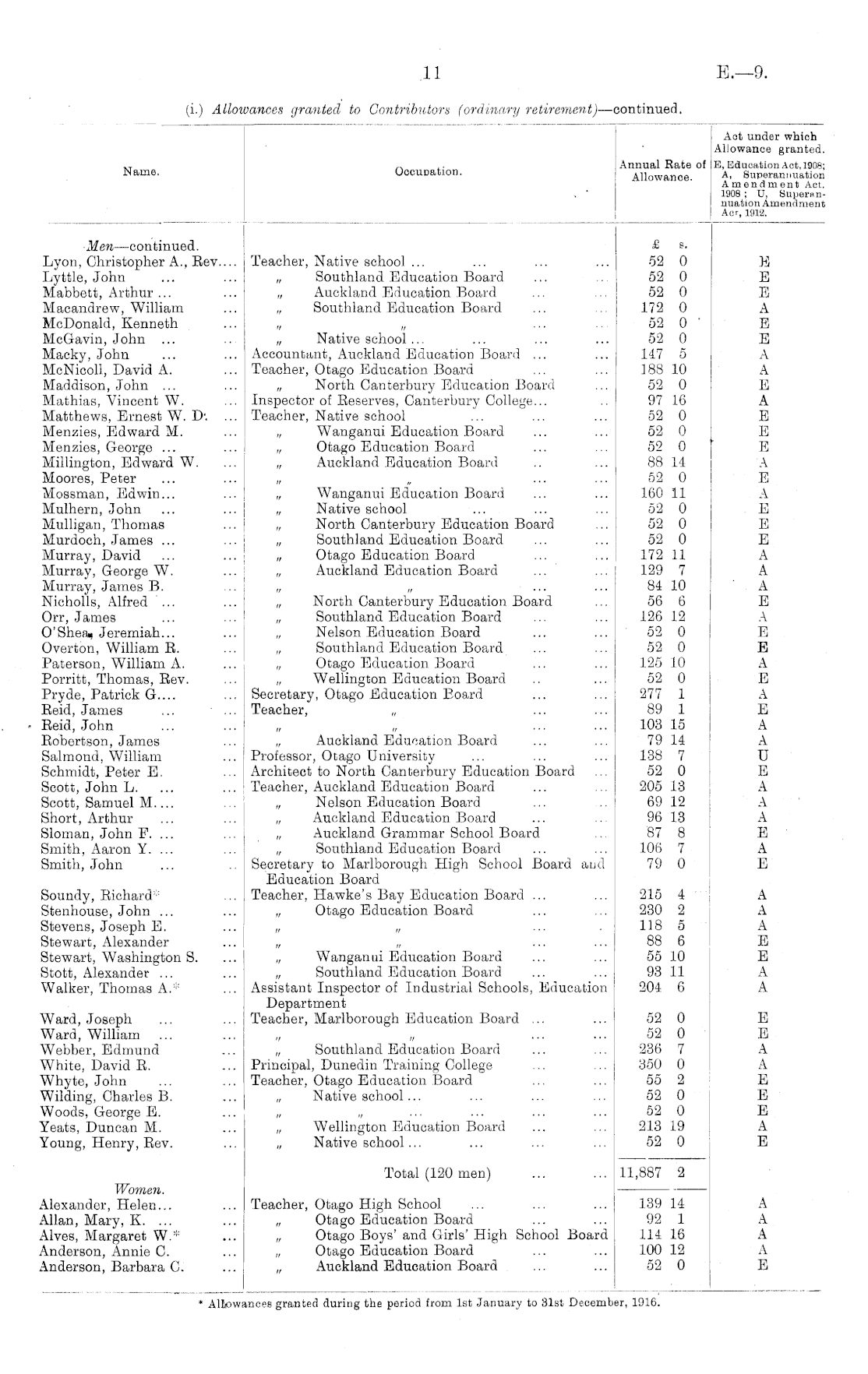 Name. Occupation. Aot under which Allowance granted. Annual Rate of E, Education Aot, 1908; Allowance A ' Superannuation Amendment Act. 1908 ; U, Superannuation Amendment Aer, 1912. Men —continued. Lyon, Christopher A., Rev.... Lyttle, John Mabbett, Arthur ... Macandrew, William McDonald, Kenneth McGavin, John ... Macky, John McNicoll, David A. Maddison, John ... Mathias, "Vincent W. Matthews, Ernest W. D'. ... Menzies, Edward M. Menzies, George ... Millington, Edward W. Moores, Peter Mossman, Edwin... Mulhern, John Mulligan, Thomas Murdoch, James ... Murray, David Murray, George W. Murray, James B. Nicholls, Alfred ... Orr, James Jeremiah... Overton, William R. Paterson, William A. Porritt, Thomas, Rev. Pryde, Patrick G.... Reid, James ... ... Reid, John Robertson, James Salmond, William Schmidt, Peter E. Scott, John L. Scott, Samuel M.... Short, Arthur Sloman, John F. ... Smith, Aaron Y. ... Smith, John Teacher, Native school ... „ Southland Education Board „ Auckland Education Board „ Southland Education Board „ Native school... Accountant, Auckland Education Board ... Teacher, Otago Education Board „ North Canterbury Education Board Inspector of Reserves, Canterbury College... Teacher, Native school „ Wanganui Education Board „ Otago Education Board „ Auckland Education Board „ Wanganui Education Board „ Native school „ North Canterbury Education Board „ Southland Education Board „ Otago Education Board „ Auckland Education Board £ s. 52 0 52 0 52 0 172 0 52 0 52 0 147 5 188 10 52 0 97 16 52 0 52 0 52 0 88 14 52 0 160 11 52 0 52 0 52 0 172 11 129 7 84 10 56 6 126 12 52 0 52 0 125 10 52 0 277 1 89 1 103 15 79 14 138 7 52 0 205 13 69 12 96 13 87 8 106 7 79 0 E E E A E E A A E A E E E A E A E E E A A A E A E E A E A E A A U E A A A E A E a n ... ... „ North Canterbury Education Board „ Southland Education Board „ Nelson Education Board „ Southland Education Board „ Otago Education Board „ Wellington Education Board Secretary, Otago Education Board Teacher, „ „ Auckland Education Board Professor, Otago University Architect to North Canterbury Education Board Teacher, Auckland Education Board „ Nelson Education Board „ Auckland Education Board „ Auckland Grammar School Board „ Southland Education Board Secretary to Marlborough High School Board and Education Board Teacher, Hawke's Bay Education Board ... „ Otago Education Board Soundy, Richard* Stenhouse, John ... Stevens, Joseph E. Stewart, Alexander Stewart, Washington S. Stott, Alexander ... Walker, Thomas A.* a a .... „ Wanganui Education Board „ Southland Education Board Assistant Inspector of Industrial Schools, Education Department Teacher, Marlborough Education Board ... 215 4 230 2 118 5 88 6 55 10 93 11 204 6 A A A E E A A Ward, Joseph Ward, William Webber, Edmund White, David R. Whyte, John Wilding, Charles B. Woods, George E. Yeats, Duncan M. Young, Henry, Rev. „ „ ... ... „ Southland Education Board Principal, Dunedin Training College Teacher, Otago Education Board „ Native school... 52 0 52 0 236 7 350 0 55 2 52 0 52 0 213 19 52 0 E E A A E E E A E „ Wellington Education Board „ Native school... Women. Alexander, Helen... Allan, Mary, K. ... Alves, Margaret W.* Anderson, Annie C. Anderson, Barbara C. Total (120 men) 11,887 2 Teacher, Otago High School. „ Otago Education Board „ Otago Boys' and Girls' High School Board „ Otago Education Board „ Auckland Education Board 139 14 92 1 1.14 16 100 12 52 0 A A A A E mees granted during the period from 1st January to 31st Decembi ir, 1916! * Allow;