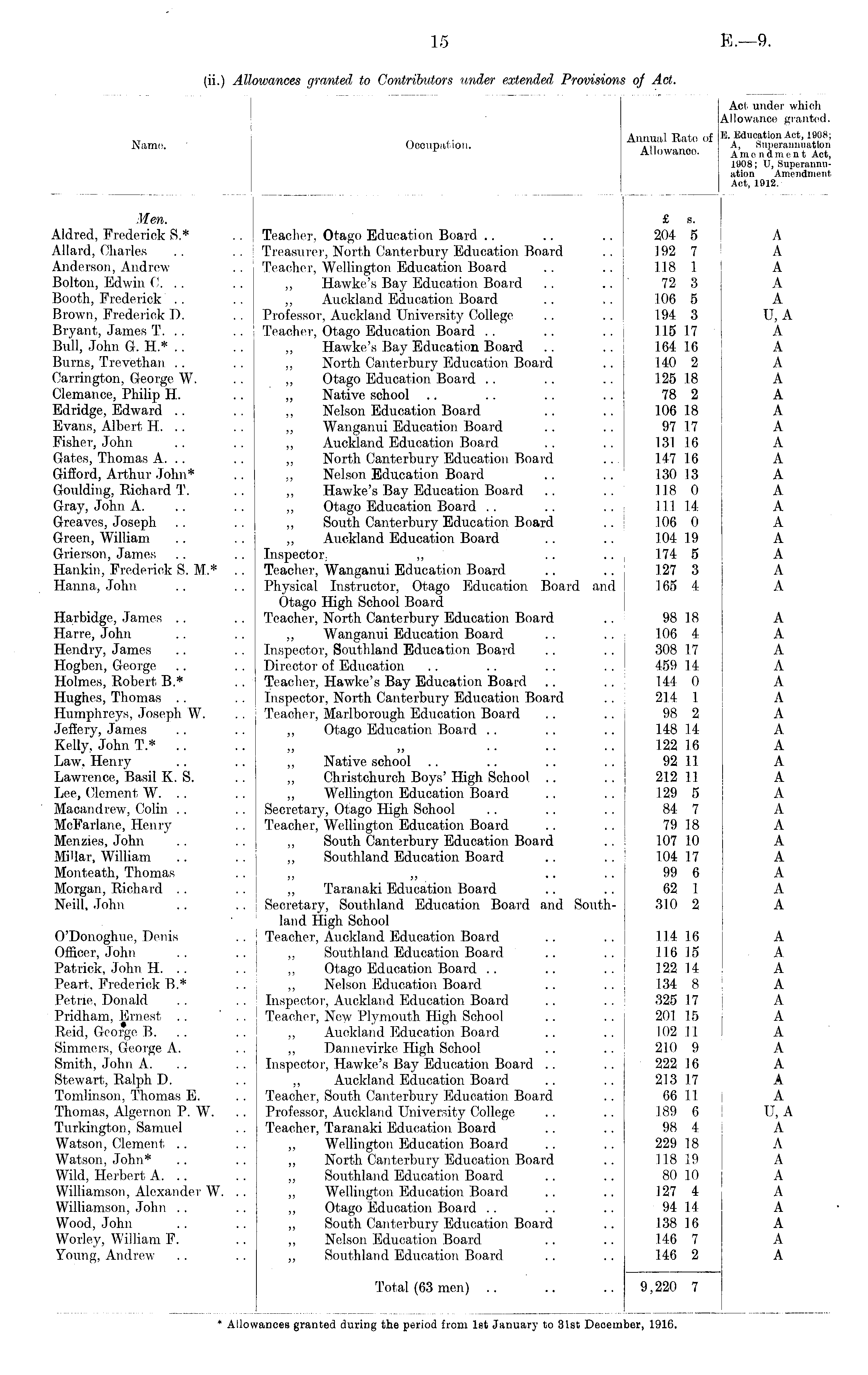 Act under which Allowance granted. Name. Occupation. Annual Rate of Allowance. E. Education Act, 1908; A, Superannuation Amendment Act, 1908; U, Superannuation Amendment Act, 1912. Men. Aldred, Frederick 8.* All a rd, Charles Anderson, Andrew Bolton, Edwin C. .. Booth, Frederick Brown, Frederick D. Bryant, James T. Bull, John G. H.* .. Burns, Trevethan Carrington, George W. Clemance, Philip H. Edridgc, Edward Evans, Albert H. .. Fisher, John Gates, Thomas A. .. Gifiord, Arthur John* Goulding, Richard T. Gray, John A. Greaves, Joseph Green, William Grierson, James Hankin, Frederick S. M.* .. Hanna, John Harbidge, James Harre, John Hendry, James Hogben, George Holmes, Robert B.* Hughes, Thomas Humphreys, Joseph W. Jefiery, James Kelly, John T.* Law, Henry Lawrence, Basil K. S. Lee, Clement W. .. Macandrew, Colin McFarlane, Henry Menzies, John Millar, William Monteath, Thomas Morgan, Richard Neill, John O'Donoghue, Denis Officer, John Patrick, John H. .. Peart. Frederick B.* Petrie, Donald Pridham, Ernest Reid, George B. . . Simmers, George A. Smith, John A. Stewart, Ralph D. Tomlinson, Thomas E. Thomas, Algernon P. W. Turkington, Samuel Watson, Clement Watson, John* Wild, Herbert A. .. Williamson, Alexander W. . . Williamson, John Wood, John Worley, William F. Young, Andrew Teacher, Otago Education Board Treasure)', North Canterbury Education Board Teacher, Wellington Education Board ,, Hawke's Bay Education Board ,, Auckland Education Board Professor, Auckland University College Teacher, Otago Education Board „ Hawke's Bay Education Board „ North Canterbury Education Board ,, Otago Education Board .. ,, Native school ,, Nelson Education Board ,, Wanganui Education Board ,, Auckland Education Board ,, North Canterbury Education Board ,, Nelson Education Board ,, Hawke's Bay Education Board ,, Otago Education Board . . ,, South Canterbury Education Board ,, Auckland Education Board Inspector : ,, .. Teacher, Wanganui Education Board Physical Instructor, Otago Education Board and Otago High School. Board Teacher, North Canterbury Education Board ,, Wanganui Education Board Inspeotor, Southland Education Board Director 1 of Education Teacher, Hawke's Bay Education Board Inspector, North Canterbury Education Board Teacher, Marlborough Education Board ,, Otago Education Board .. ,, ,, ,, Native school ,, Christchurch Boys' High School .. ,, Wellington Education Board Secretary, Otago High School Teacher, Wellington Education Board ,, South Canterbury Education Board ,, Southland Education Board ,, Taranaki Education Board Secretary, Southland Education Board and Southland High School Teacher, Auckland Education Board ,, Southland Education Board ,, Otago Education Board .. ,, Nelson Education Board Inspector, Auckland Education Board Teacher, New Plymouth High School ,, Auckland Education Board ,, Dannevirke High School Inspeotor, Hawke's Bay Education Board .. ,, Auckland Education Board Teacher, South Canterbury Education Board Professor, Auckland University College Teacher, Taranaki Education. Board ,, Wellington Education Board ,, North Canterbury Education Board ,, Southland Education Board ,, Wellington Education Board ,, Otago Education Board . . ,, South Canterbury Education Board ,, Nelson Education Board ,, Southland Education Board £ s. 204 5 192 7 118 1 72 3 1.06 5 194 3 115 17 164 16 140 2 125 18 78 2 106 18 97 17 131 16 147 16 130 13 118 0 Ml 1.4 106 0 104 19 174 5 127 3 165 4 98 18 106 4 308 17 459 14 144 0 214 1 98 2 148 14 122 16 92 11 212 11 129 5 84 7 79 18 107 10 104 17 99 6 62 I 310 2 114 16 116 15 122 14 134 8 325 17 201 15 102 11 210 9 222 16 213 17 66 11 189 6 98 4 229 18 118 19 80 10 127 4 94 1.4 138 16 146 7 146 2 A A A A A U, A A A A A A A A A A A A A A A A A A A A A A A A A A. A A A A A A A A A A A A A. A A A A A A A A A U, A A A A A A A A A A Total (63 men) . . 9,220 7 9,220 7 * Alio' iwances granted during the period from iBt January to 31st Deeernl ber, 1916. oer, 1916.