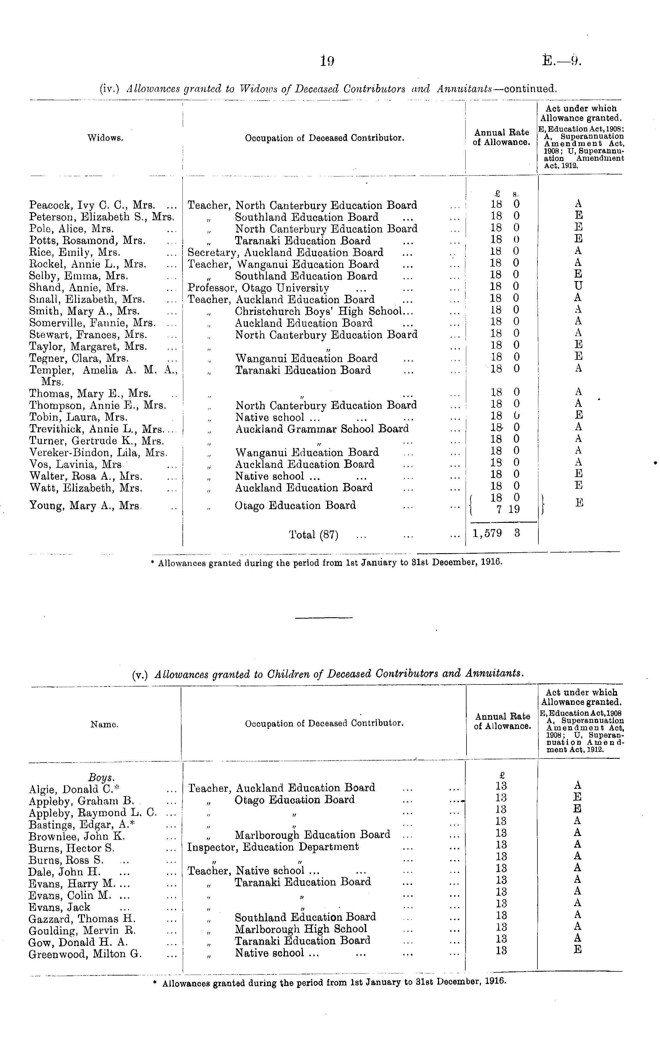Name. Occupation of Deceased Contributor. , ___ £ — Annual Rate of Allowance. Aot under which Allowance granted. E,EducationAct,1908 A, Superannuation Amendment Act, 1908; U, Superannuation Amendment Act, 1912. Boys. Algie, Donald C* ... Teacher, Auckland Education Board Appleby, Graham B. ... „ Otago Education Board Appleby, Raymond L. C. ... „ „ Bastings, Edgar, A.* Brownlee, John K. ... „ Marlborough Education Board ... Burns, Hector S. ... Inspector, Education Department Burns, Ross S. ... ... „ „ Dale, John H. ... ... Teacher, Native school ... Evans, Harry M. ... ... „ Taranaki Education Board Evans, Colin M. ... ... „ „ blvans, Jack ... ... „ « Gazzard, Thomas H. ... „ Southland Education Board Goulding, Mervin R. ... „ Marlborough High School Glow, Donald H. A. ... „ Taranaki Education Board Greenwood, Milton G. ... „ Native school ... 13 13 13 13 13 13 13 13 13 13 13 13 13 13 13 £ 13 13 13 13 13 13 13 13 13 13 13 13 13 13 13 A E E A A A A A A A A A A A E * Allowances granted during the period from 1st January to 31st Decern nber, 1916. ber, 1916.