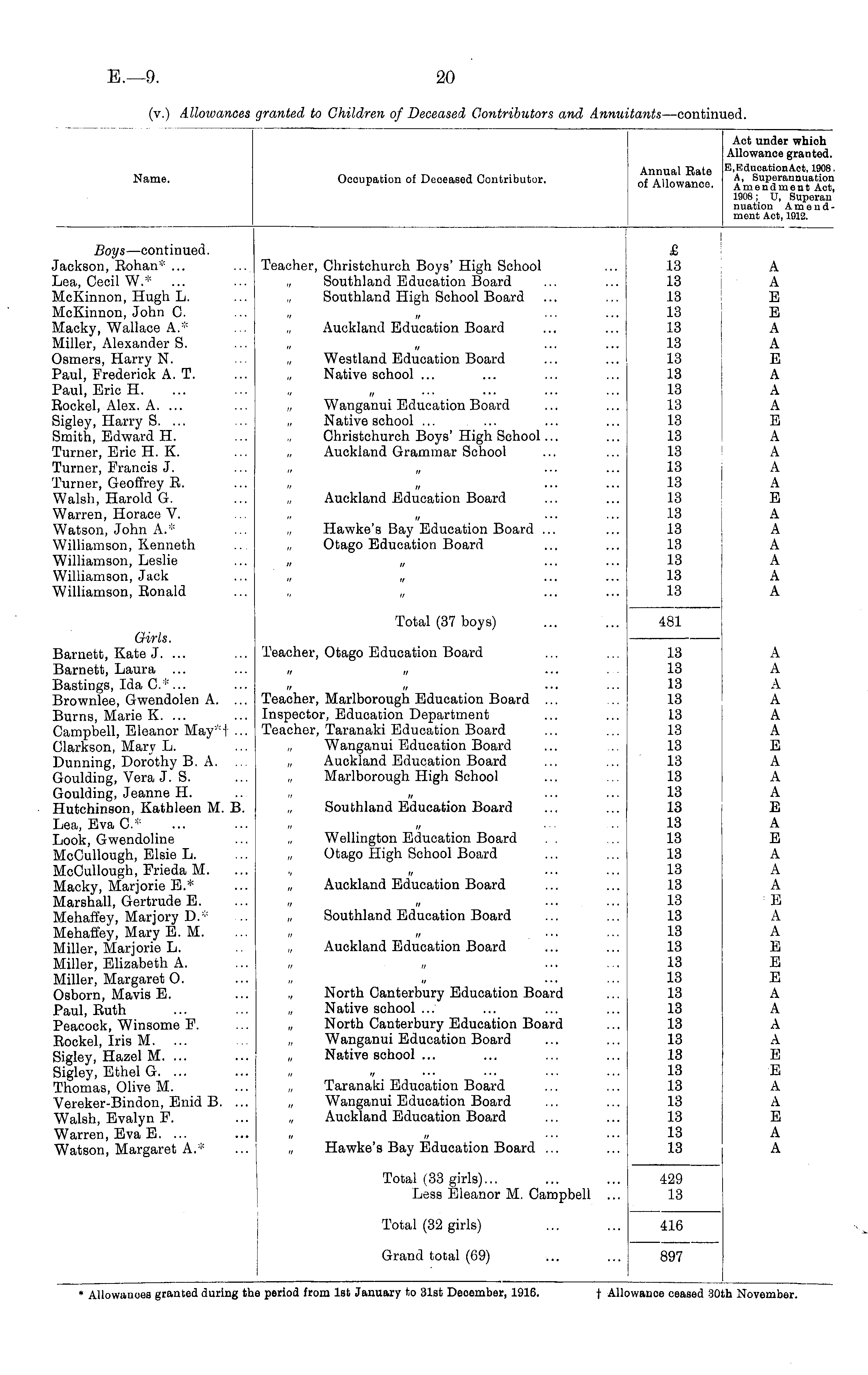 Name. Occupation of Deceased Contributor. Annual Rate of Allowance Act under whioh Allowance granted. E.RducationAct, 1908. A, Superannuation Amendment Act, 1908; U, Suporau nuation A m e n d - ment Act, 1912. Boys —continued. Jackson, Rohan* ... Lea, Cecil W.* McKinnon, Hugh L. McKinnon, John C. Macky, Wallace A.* Miller, Alexander S. Osmers, Harry N. Paul, Frederick A. T. Paul, Eric H. Rockel, Alex. A. ... Sigley, Harry S. ... Smith, Edward H. Turner, Eric H. K. Turner, Francis J. Turner, Geoffrey R. Walsh, Harold G. Warren, Horace V. Watson, John A.* Williamson, Kenneth Williamson, Leslie Williamson, Jack Williamson, Ronald Teacher, Christchurch Boys' High School „ Southland Education Board „ Southland High School Board " it Auckland Education Board a a ... „ Westland Education Board Native school ... „ Wanganui Education Board Native school ... Christchurch Boys' High School... Auckland Grammar School £ 13 13 13 13 13 13 13 13 13 13 13 13 13 13 13 13 13 13 13 13 13 13 A A E E A A E A A A E A A A A E A A A A A A Auckland Education Board „ Hawke's Bay Education Board ... „ Otago Education Board a a ... '/ n ... ,. „ ... Girls. Barnett, Kate J. ... Barnett, Laura ... Bastings, Ida 0.*.., Brownlee, Gwendolen A. ... Burns, Marie K. ... Campbell, Eleanor May*! ... Clarkson, Mary L. Dunning, Dorothy B. A. ... Goulding, Vera J. S. Goulding, Jeanne H. Hutchinson, Kathleen M. B. Lea, Eva C* Look, Gwendoline McCullough, Elsie L. McCullough, Frieda M. Macky, Marjorie E.* Marshall, Gertrude E. Mehaffey, Marjory D.* Mehaffey, Mary E. M. Miller, Marjorie L. Miller, Elizabeth A. Miller, Margaret 0. Osborn, Mavis E. Paul, Ruth Peacock, Winsome F. Rockel, Iris M. ... Sigley, Hazel M. ... Sigley, Ethel G. ... Thomas, Olive M. Vereker-Bindon, Enid B. ... Walsh, Evalyn F. Warren, Eva E. ... Watson, Margaret A.* Total (37 boys) 481 A A A A A A E A A A E A E A A A : E A A E E E A A A A E E A A E A A Teacher, Otago Education Board 13 13 13 13 13 13 13 13 13 13 13 13 13 13 13 13 13 13 13 13 13 13 13 13 13 13 13 13 13 13 13 13 13 n a a a ... Teacher, Marlborough Education Board ... Inspector, Education Department Teacher, Taranaki Education Board „ Wanganui Education Board „ Auckland Education Board „ Marlborough High School '. a ... Southland Education Board a a ... Wellington Education Board . . „ Otago High School Board ,, „ ... Auckland Education Board a a ... „ Southland Education Board „ Auckland Education Board ,, North Canterbury Education Board „ Native school ... „ North Canterbury Education Board Wanganui Education Board „ Native school ... a <t ... ■-. „ Taranaki Education Board „ Wanganui Education Board „ Auckland Education Board Hawke's Bay Education Board ... Total (33 girls)... Less Eleanor M. Campbell 429 13 Total (32 girls) 416 Grand total (69) 897 * Allowances ;ranted during the period from 1st January to 31st Deoember, 1916. f Allowance ceased 30th November.
