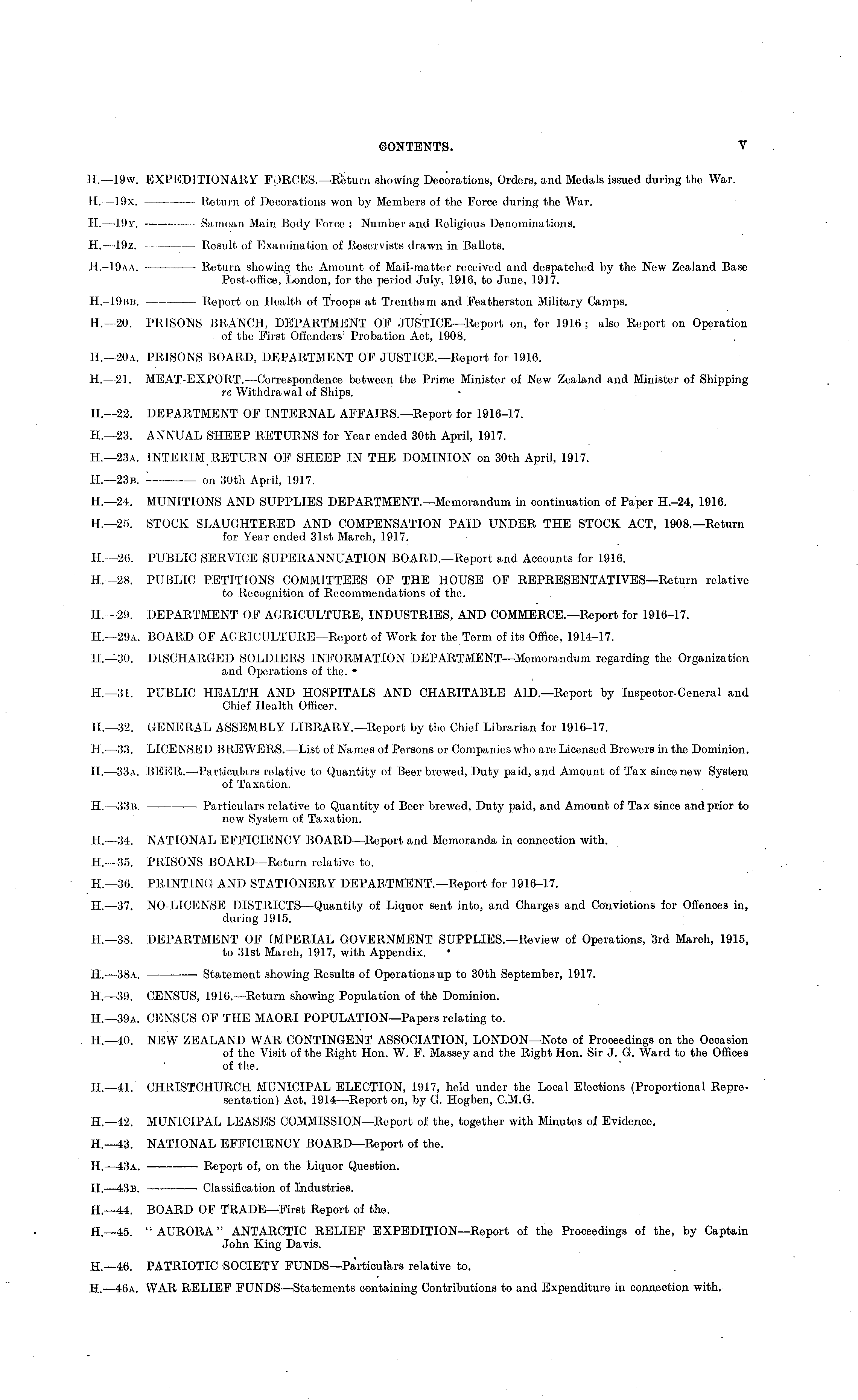 H.— l9w. EXPEDITIONARY FORCES.—Return showing Decorations, Orders, and Medals issued during the War. H. —19x. Return of Decorations won by Members of the Force during the War. H.—l9y. —■ — Samoan Main Body Force : Number and Religious Denominations. H. —19z. — Result of Examination of Reservists drawn in Ballots. H.-19aa. Return showing the Amount of Mail-matter received and despatched by the New Zealand Base Post-office, London, for the period July, 1916, to June, 1917. H.-19nn. Report on Health of Troops at Trcntham and Featherston Military Camps. IL—2O. PRISONS BRANCH, DEPARTMENT OF JUSTICE—Report on, for 1916; also Report on Operation of the First Offenders' Probation Act, 1908. 11.—20 a. PRISONS BOARD, DEPARTMENT OF JUSTICE.—Report for 1916. H. —21. MEAT-EXPORT.—Correspondence between the Prime Minister of New Zoaland and Minister of Shipping re Withdrawal of Ships. H— 22. DEPARTMENT OF INTERNAL AFFAIRS.—Report for 1916-17. H— 23. ANNUAL SHEEP RETURNS for Year ended 30th April, 1917. H.—23a. INTERIM RETURN OF SHEEP IN THE DOMINION on 30th April, 1917. H.—23e. . on 30th April, 1917. H.—24. MUNITIONS AND SUPPLIES DEPARTMENT.—Memorandum in continuation of Paper H.-24, 1916. H.—25. STOCK SLAUGHTERED AND COMPENSATION PAID UNDER THE STOCK ACT, 1908.—Return for Year ended 31st March, 1917. H.—26. PUBLIC SERVICE SUPERANNUATION BOARD.—Report and Accounts for 1916. H.—2B. PUBLIC PETITIONS COMMITTEES OF THE HOUSE OF REPRESENTATIVES—Return relative to Recognition of Recommendations of the. H.—29. DEPARTMENT OF AGRICULTURE, INDUSTRIES, AND COMMERCE.—Report for 1916-17. H— 29a. BOARD OF AGRICULTURE—Report of Work for the Term of its Office, 1914-17. H.—3o. DISCHARGED SOLDIERS INFORMATION DEPARTMENT—Memorandum regarding the Organization and Operations of the. • H.—3l. PUBLIC HEALTH AND HOSPITALS AND CHARITABLE AlD—Report by Inspector-General and Chief Health Officer. H.—32. GENERAL ASSEMBLY LIBRARY.—Report by the Chief Librarian for 1916-17. H.—33. LICENSED BREWERS.—List of Names of Persons or Companies who are Licensed Brewers in the Dominion. H.—-33a. BEER.—Particulars relative to Quantity of Beer browed, Duty paid, and Amount of Tax since new System of Taxation. H. —33b. Particulars relative to Quantity of Beer brewed, Duty paid, and Amount of Tax since and prior to new System of Taxation. H — 34. NATIONAL EFFICIENCY BOARD—Report and Memoranda in connection with. H— 35. PRISONS BOARD—Return relative to. H.—36. PRINTING AND STATIONERY DEPARTMENT.—Report for 1916-17. H.—37. NO-LICENSE DISTRICTS—Quantity of Liquor sent into, and Charges and Convictions for Offences in, during 1915. H—3B. DEPARTMENT OF IMPERIAL GOVERNMENT SUPPLIES.—Review of Operations, 3rd March, 1915, to 31st March, 1917, with Appendix. H.—3Ba. —■ Statement showing Results of Operations up to 30th September, 1917. H. —39. CENSUS, 1916. —Return showing Population of the Dominion. H.—39a. CENSUS OF THE MAORI POPULATION—Papers relating to. H— 40. NEW ZEALAND WAR CONTINGENT ASSOCIATION, LONDON—Note of Proceedings on the Occasion of the Visit of the Right Hon. W. F. Massey and the Right Hon. Sir J. G. Ward to the Offices of the. H— 41. CHRISTCHURCH MUNICIPAL ELECTION, 1917, held under the Local Elections (Proportional Representation) Act, 1914 —Report on, by G. Hogben, C.M.G. H—42. MUNICIPAL LEASES COMMISSION—Report of the, together with Minutes of Evidonco. H.—43. NATIONAL EFFICIENCY BOARD—Report of the. H. —43a. Report of, on the Liquor Question. H.—43b. Classification of Industries. H—44. BOARD OF TRADE—First Report of the. H— 45. "AURORA" ANTARCTIC RELIEF EXPEDITION—Report of the Proceedings of the, by Captain John King Davis. H— 46. PATRIOTIC SOCIETY FUNDS—Particulars relative to. H. —46a. WAR RELIEF FUNDS —Statements containing Contributions to and Expenditure in connection with.
