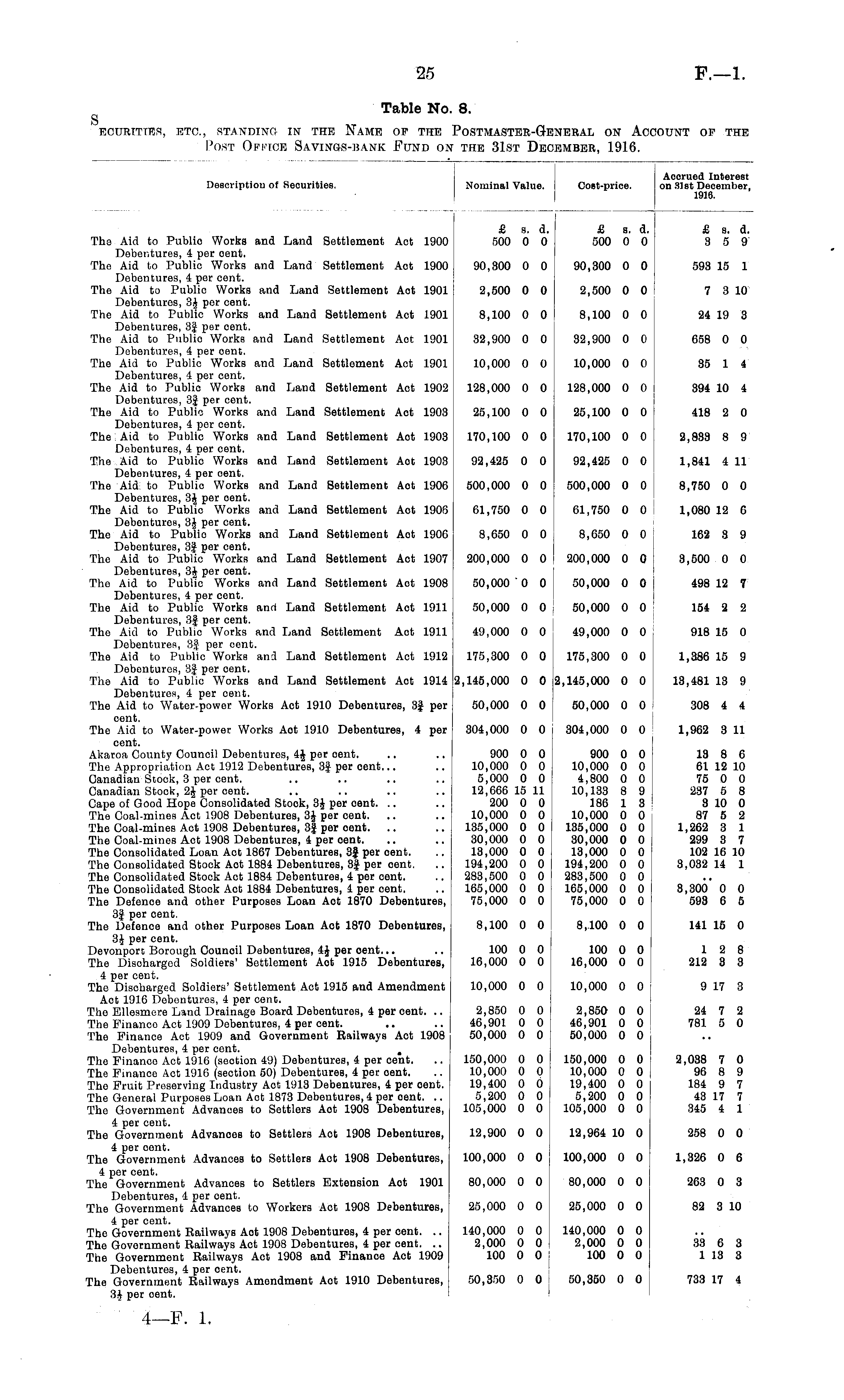 Table No. 8. Securities, etc., standing in the name of the postmaster-general on account of the Post Office Savings-bank Fund on the 31st December, 1916.