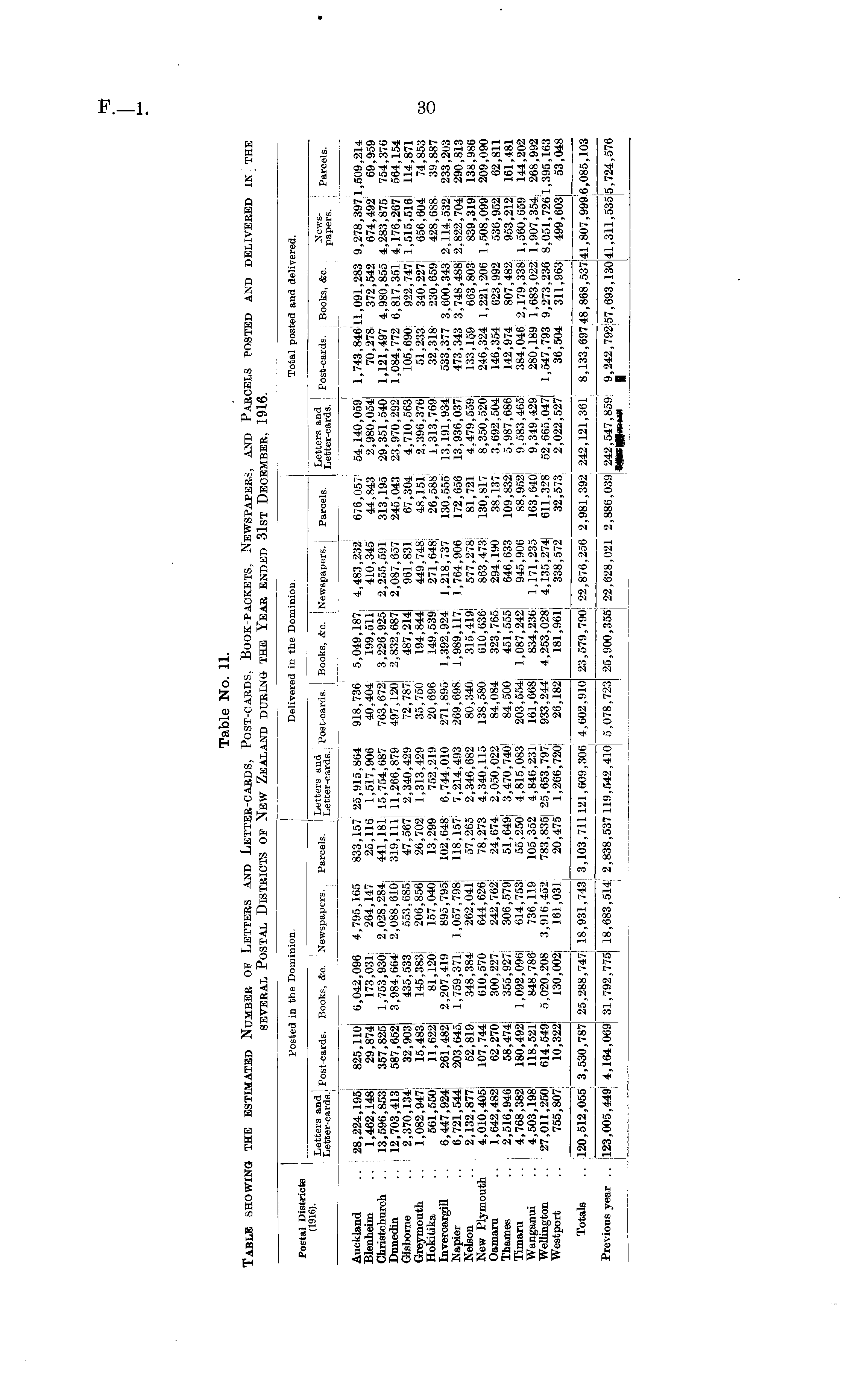 Table No. 11. Table showing the estimated Number of Letters and Letter-cards, Post-cards, Book-packets, Newspapers, and Parcels posted and delivered in the several Postal Districts of New Zealand during the Year ended 31st December, 1916.