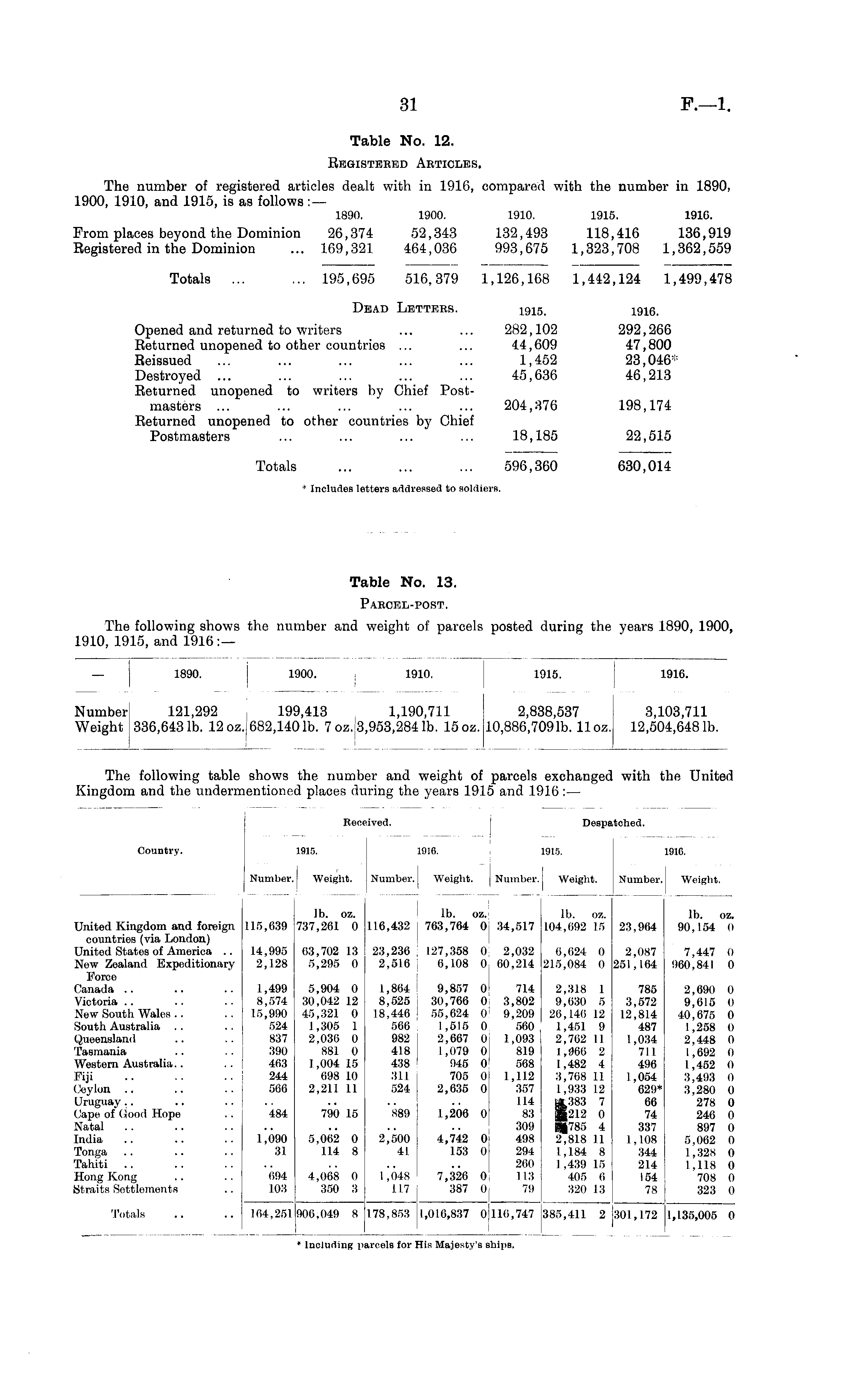 Table No. 12. Registered Articles. The number of registered articles dealt with in 1916, compared with the number in 1890, 1900, 1910, and 1915, is as follows :— 1890. 1900. 1910. 1915. 1916. From places beyond the Dominion 26,374 52,343 132,493 118,416 136,919 Registered in the Dominion ... 169,321 464,036 993,675 1,323,708 1,362,559 Totals ... ... 195,695 516,379 1,126,168 1,442,124 1,499,478 Dead Letters. 1915. 1916. Opened and returned to writers ... ... 282,102 292,266 Returned unopened to other countries ... ... 44,609 47,800 Reissued ... ... ... ... ... 1,452 23,046Destroyed ... ... ... ... ... 45,636 46,213 Returned unopened to writers by Chief Postmasters ... ... ... ... ... 204,376 198,174 Returned unopened to other countries by Chief Postmasters ... ... ... * ... 18,185 22,515 Totals ... ... ... 596,360 630,014 * Includes letters addressed to soldiers.