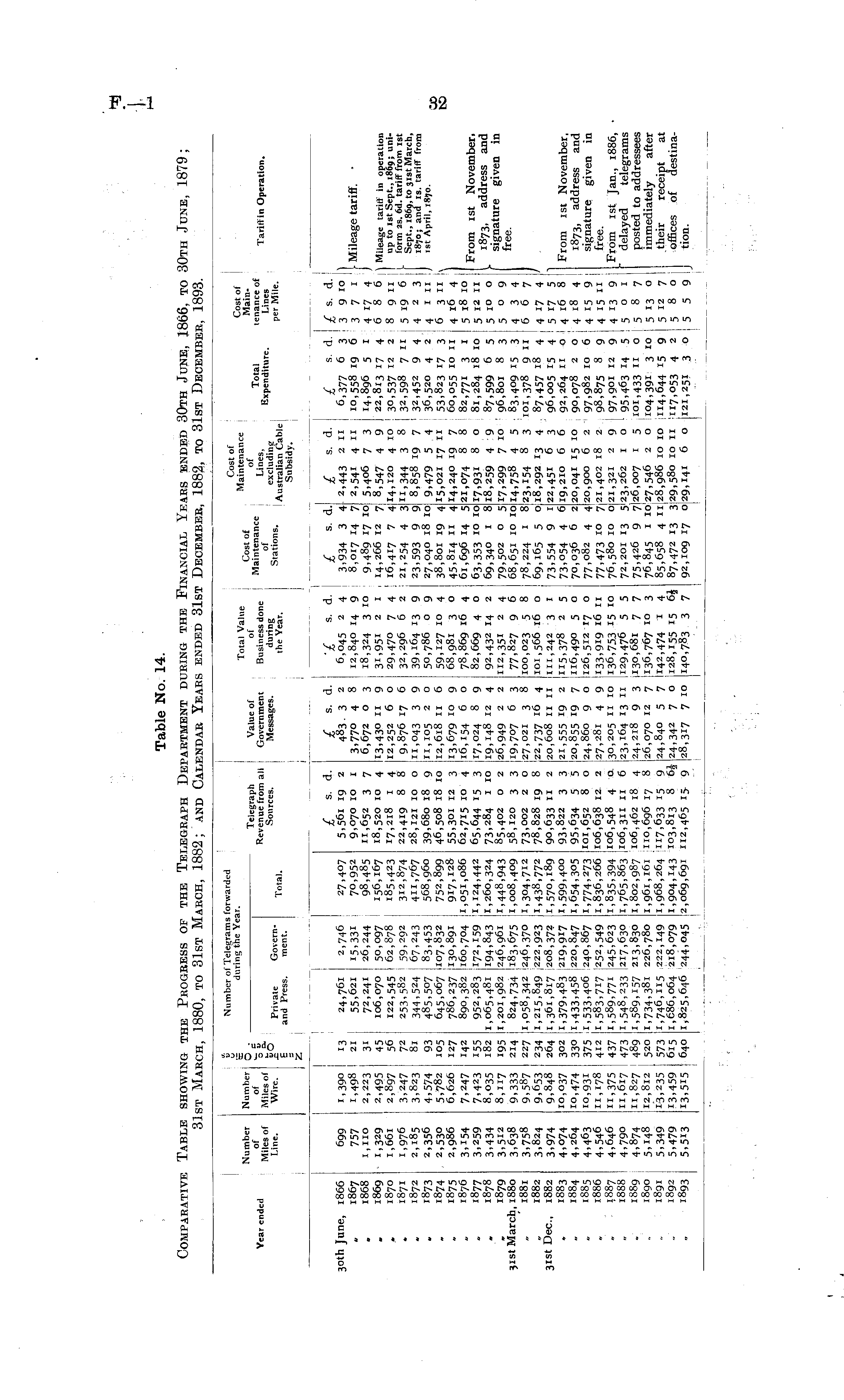Table No. 14. Comparative Table showing the Progress of the Telegraph Department during the Financial Years ended 30th June, 1866, to 30th June, 1879; 31st March, 1880, to 31st March, 1882; and Calendar Years ended 31st December, 1882, to 31st December, 1893.