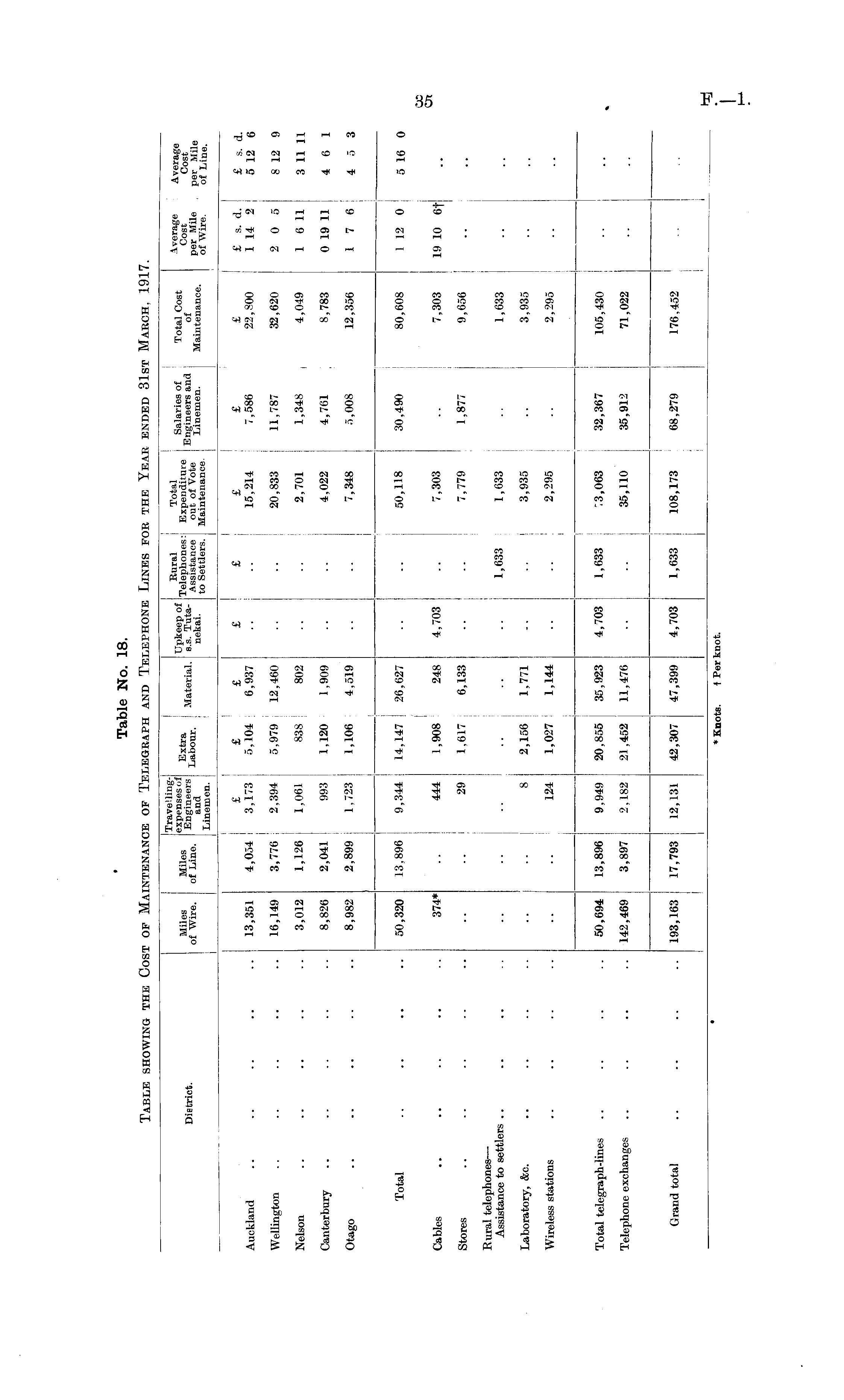 Table No. 18. Table showing the Cost of Maintenance of Telegraph and Telephone Lines for the Year ended 31st March, 1917.