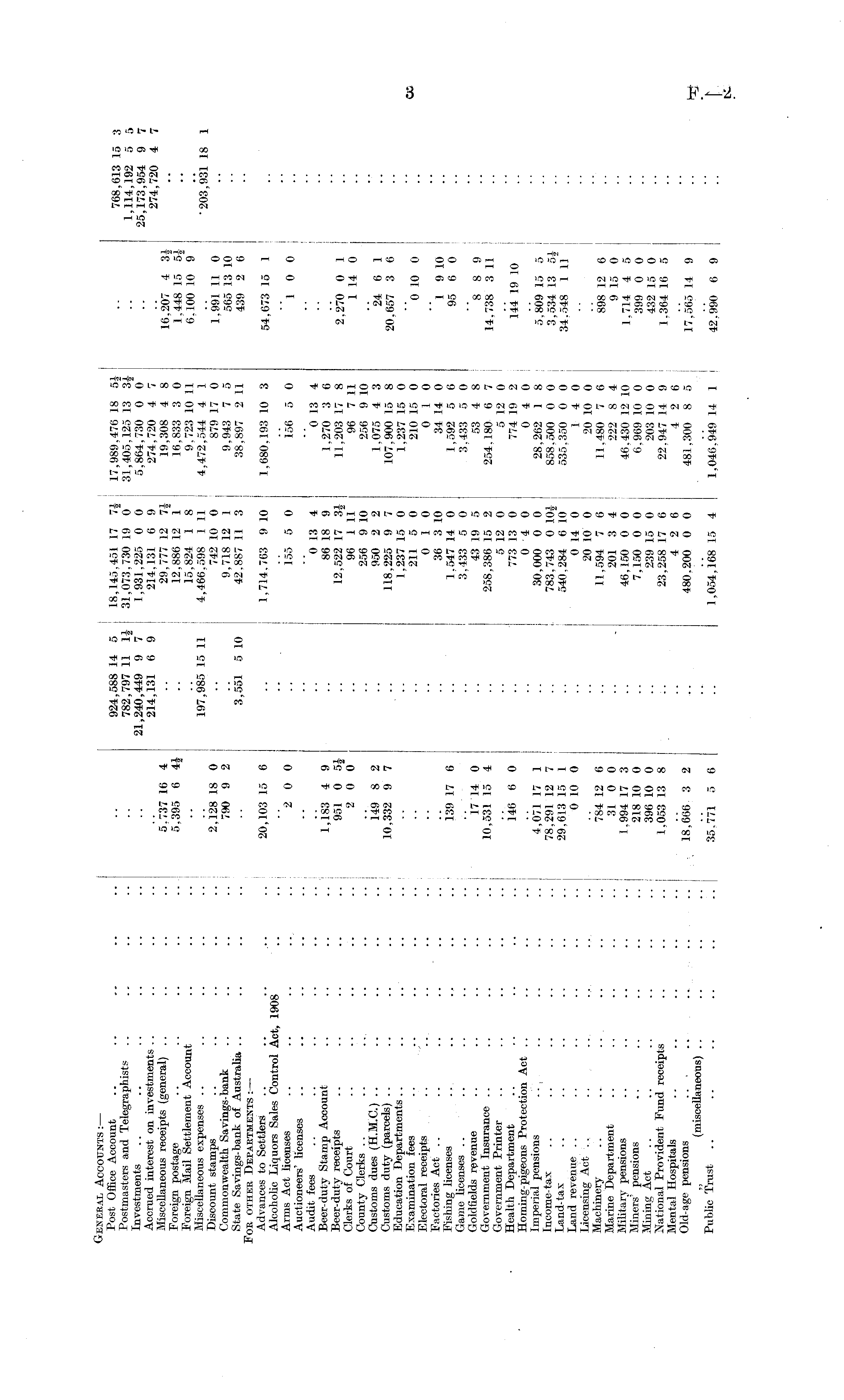 ceneral Accounts :— Post Office Account Postmasters and Telegraphists Investments Accrued interest on investments Miscellaneous receipts (general) Foreign postage Foreign Mail Settlement Account Miscellaneous expenses Discount stamps Commonwealth Savings-bank State Savings-bank of Australia 'or other Departments :— Advances to Settlers Alcoholic Liquors Sales Control Act, 1908 Arms Act licenses Auctioneers" licenses Audit fees Beer- duty Stamp Account Beer-duty receipts Clerks of Court County Clerks Customs dues (H.M.C.) .. Customs duty (parcels) Education Departments Examination fees Electoral receipts .. Factories Act Fishing licenses Game licenses Goldfields revenue Government Insurance Government Printer Health Department Homing-pigeons Protection Act Imperial pensions .'.'". Income-tax Land-tax Land revenue Licensing Act Machinery .. .. Marine Department Military pensions Miners' pensions Mining Act National Provident Fund receipts Mental Hospitals Old-age pensions ... „ (miscellaneous) Public Trust .. .. i 5.737 16 4 5,395 6 4J 2.128 18 0 790 9 2 20,103 15 6 2 0 0 1,183 4 9 951 0 5J 2 0 0 149 8 2 10,332 9 7 139 17 6 17 14 0 10,531 15 4 146 6 0 4,071 17 1 78.291 12 7 29.613 15 1 0 10 0 784 12 6 31 0 0 1.994 17 3 218 10 0 396 10 0 1,053 13 8 18,666 3 2 35,771 5 6 924,588 14 5 782,797 11 \\ 21,240,449 9 7 214,131 6 9 197,985 15 11 3,551 5 10 18,145,451 17 74 31,073,730 19 0 1,931,225 0 0 214,131 6 9 29,777 12 7| 12.886 12 1 15,824 1 8 4,466,598 1 11 742 10 0 I 9,718 12 1 i 42.887 11 3 1,714,763 9 10 155 5 0 0 13 4 86 18 9 12,522 17 3J 96 1 11 256 9 10 950 2 2 118,225 9 7 1.237 15 0 211 5 0 0 I 0 36 3 10 1.547 14 0 3,433 5 0 43 19 5 258.386 15 2 5 12 0 773 13 0 0 4 0 30,000 0 0 783,743 0 10J 540,284 6 10 0 14 0 20 10 0 11.594 7 6 201 3 4 46,150 0 0 7,150 0 0 239 15 0 23,258 17 6 4 2 6 480,200 0 0 1,054,168 15 4 17,989.476 18 5J 31,405.125 13 %\ 5,864,730 0 0 274,720 4 7 19,308 4 8 16,833 3 0 9,723 10 11 4,472,544 4 1 879 17 0 9.943 7 5 38.897 2 11 1,680,193 10 3 156 5 0 0 13 4 1.270 3 6 11.203 17 8 96 7 11 256 9 10 1.075 4 3 107,900 15 8 1,237 15 0 210 15 0 0 1 0 34 14 0 1.592 5 6 3.433 5 0 53 4 8 254.180 6 7 5 12 0 774 19 2 0 4 0 28,262 1 8 858.500 0 0 535.350 0 0 14 0 20 10 0 11.480 7 6 222 8 4 46,430 12 10 6.969 10 0 203 10 0 22,947 14 9 4 2 6 481.300 8 5 ; 16.207 4 34 1.448 15 5J 6,100 10 9 1.991 11 0 565 13 10 439 2 6 I 54,673 15 1 1 0 0 2.270 0 1 1 14 0 24 6 1 20.657 3 6 0 10 0 1 9 10 95 6 0 8 8 9 14,738 3 11 144 19 10 5,809 15 5 3,534 13 54 34.548 1 1) 898 12 6 9 15 0 1.714 4 5 399 0 0 432 15 0 1,364 16 5 17,565 14 9 768,613 1 1,114,192 , 25,173,954 ! 274,720 ■ •203,931 11 ■ 1,046,949 14 1 42,990 6 9