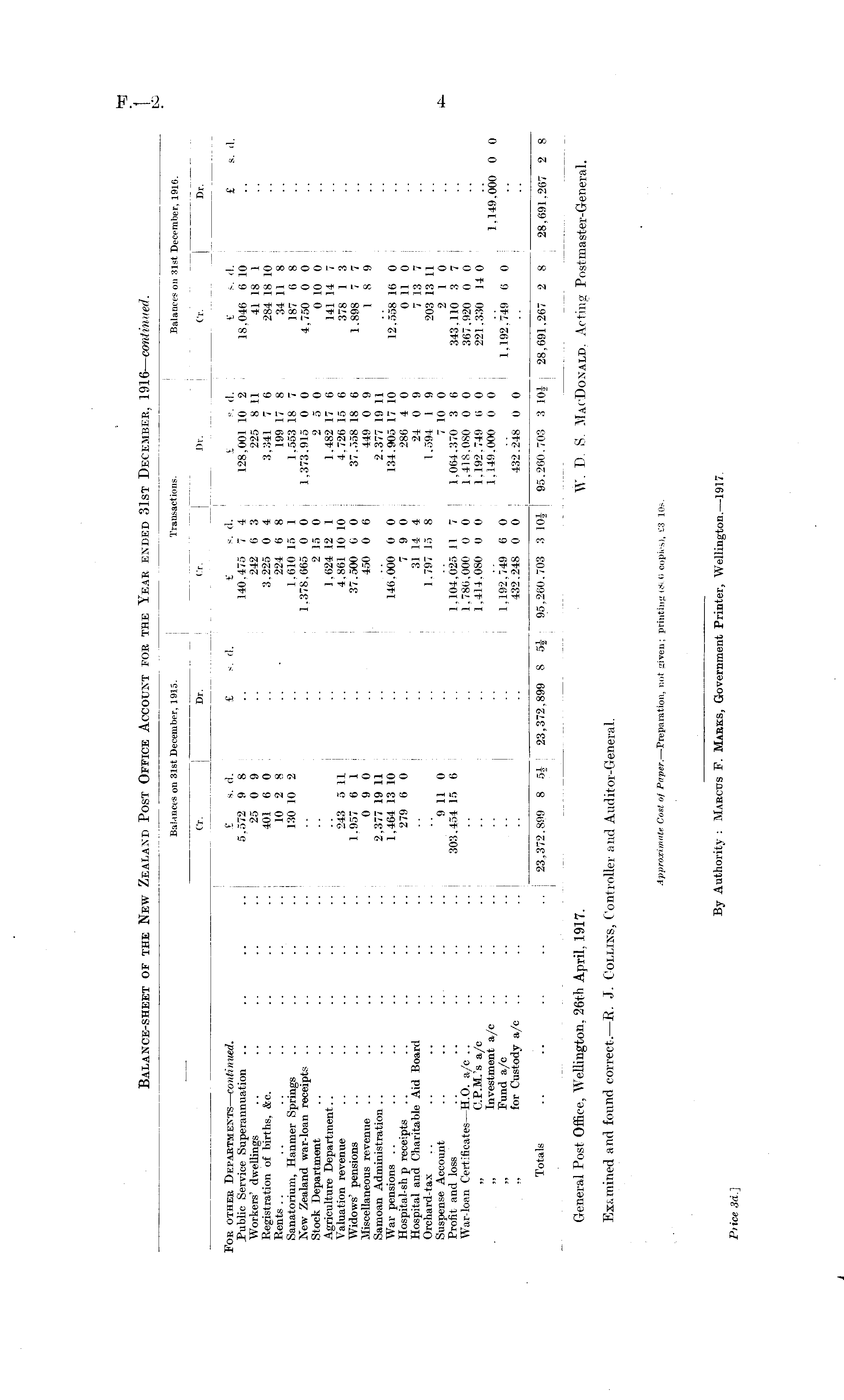 General Post Office, Wellington, 26th April, 1917. W. D. S. MacDoxald, Acting Postmaster-General. Examined and found correct.— B. J. Collins, Controller and Auditor-General.