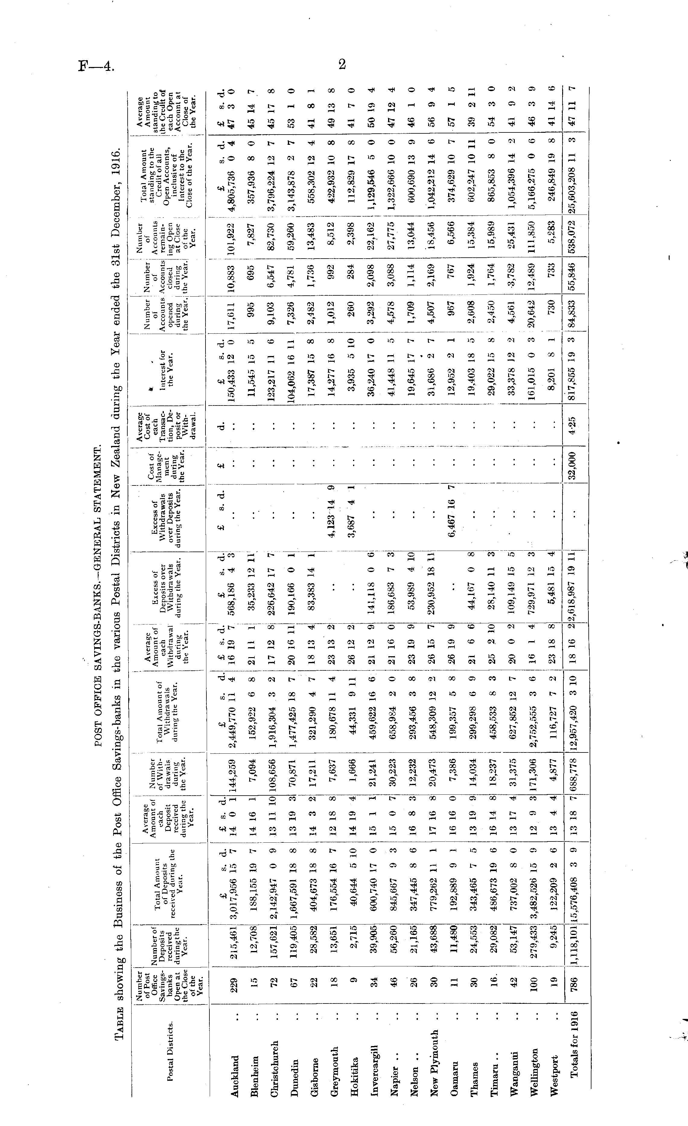 Postal Districts. Number of Post Office Savingsbanks Open at the Close of the j Year. Number of Deposits received duringthe Year. Total Amount of Deposits received during the Year. Average Average Amount of Number Amount of Excess of each of With- lOtalAmoun of each Deposits over Deposit drawais Withdrawals Withdrawal Withdrawals received during during the Year. dnri during the Year, during the the Year. tne Year. Year. ! Average ,. , Cost of '' Cost 1 ° f Excess of m each Withdrawals ' v i» na S e - Transacover Deposits , m . tion, Deduring the Year. t ?"U n f r posit or the Year. wi(h _ drawal. Interest for the Year. Number of Accounts opened during the Year. . Number Number of of Accounts Accounts remainclosed ing Open during at Close the Year. of the Year. Total Amount standing to the Credit of all Open Accounts, inclusive of Interest to the Close of the Year. Average Amount standing to :he Credit of each Open Account at Close of the Year. 229 215,46li £ S. d. 3,017,956 15 7 £ s. d. 14 0 1 £ s. d. 2,449,770 11 4 £ s. d. 16 19 7 £ s. d. 568,186 4 3 £ s. d. £ d. £ 8. d. 150,433 12 0 10,883 £ S. d. 101,922 4,805,736 0 4 £ s. d. 47 3 0 Auckland 144,259 17,611 Blenheim 15 ; 12,708 188,155 19 7 14 16 1 7,094 152,922 6 8 21 li 1 35,233 12 11 I 11,545 15 5 123,217 11 6 104,062 16 11 995 695 7,827 357,936 8 0 45 14 7 Christchurch 72 157,621 2,142,947 0 9 13 11 10 108,656 1,916,304 3 2 17 12 8 226,642 17 7 9,103 6,547 82,730 3,796,224 12 7 45 17 8 Dunedin 67 I 119,405 1,667,591 18 8 I 13 19 3l 70,871 1,477,425 18 7 20 16 11 ! 190,166 0 1 " I 7,326 4,781 59,260 3,143,878 2 7 53 1 0 Gisborne 22 ; 28,582 404,673 18 8 14 3 2 17,211 321,290 4 7 18 13 4 83,383 14 1 17,387 15 8 ! 2,482 1,736 13,483 558,302 12 4 41 8 1 Greymouth 18 j 13,651 176,554 16 7 12 18 8 7,637 180,678 11 4 23 13 2 4,123 14 9 14,277 16 8 1,012 992 8,512 ! 422,932 10 8 49 13 8 Hokitika 9 j 2,715 40,644 5 10 14 19 4 1,666 44,331 9 11 26 12 2 3,687 4 1 3,935 5 10 260 284 2,398 112,829 17 8 41 7 0 Invercargill 34 39,905 600,740 17 0 15 1 1 21,241 459,622 16 6 21 12 9 141,118 0 6 36,240 17 0 3,292 2,098 22,162 1,129,546 5 0 50 19 4 Napier 46 56,260 1 845,667 9 3 15 0 7 30,223 658,984 2 0 21 16 0 186,683 7 3 41,448 11 5 4,578 3,088 27,775 1,322,666 10 0 47 12 4 Nelson 26 : 21,165 347,445 8 6 16 8 3 12,232 293,456 3 8 23 19 9 53,989 4 10 19,645 17 7 1,709 1,114 13,044 600,690 13 9 46 1 0 ' New Plymouth .. 30 43,688 779,262 11 1 17 16 8 20,473 548,309 12 2 26 15 7 230,952 18 II 31,686 2 7 12,952 2 1 j 4,507 2,169 18,456 1,042,212 14 6 56 9 4 Oamaru 11 11,480 192,889 9 1 16 16 0 7,386 199,357 5 8 26 19 9, 6,467 16 7 967 767 6,566 374,629 10 7 57 1 5 Thames 30 24,553 343,465 7 5 13 19 9 14,034 299,298 6 9 21 6 6 44,167 0 8 19.403 18 5 2,608 1,924 15,384 ! 602,247 10 11 39 2 11 Timaru 16. 29,082 486,673 19 6 16 14 8 18,237 458,533 8 3 25 2 10 28,140 11 3 29,022 15 8 2,450 1,764 15,989 865,853 8 0 54 3 0 Wanganui 42 53,147 737,002 8 0 13 17 4 31,375 627,852 12 7 20 0 2 109,149 15 5 .. _ 33,378 12 2 4,561 3,782 25,431 1,054,396 14 2 41 9 2 Wellington 100 279,433 19 9,245 3,482,526 15 9 122,209 2 6 12 9 3 171,306 2,752,555 3 6 16 1 4 729,971 12 3 161,015 0 3 20,642 12,489 111,850 5,166,275 0 6 46 3 9 Westport 13 4 4 4,877 116,727 7 2 23 18 8 5,481 15 4 8,201 8 1 730 733 5,283 246,849 19 8 41 14 6 Totals lor 1916 786 l,118,10115,o76,408 3 9 13 18 7 688,778 12,957,420 3 10 18 16 2 2,618,987 19 !I 32,000 4-25 817,855 19 3 , 84,833 55,846 538,072 125,603,208 11 3 47 11 7