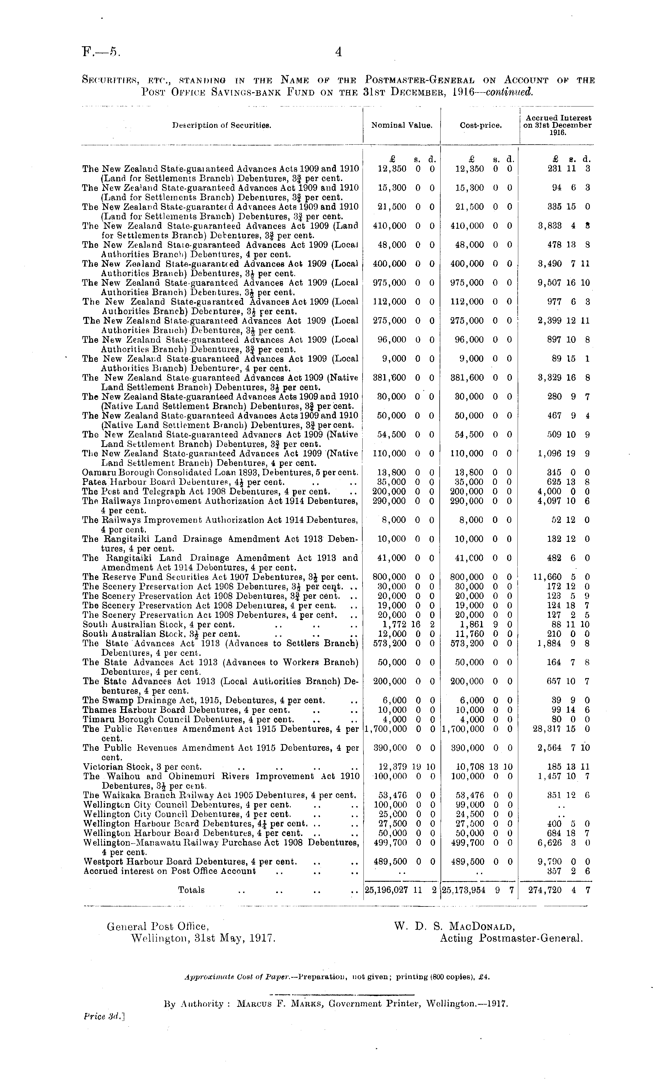Description of Securities. Nomiual Value. Cost-price. Accrued Interest on 31st December 1916. The New Zealand State-guaianteed Advances Acts 1909 and 1910 (Land for Settlements Branch) Debentures, 3} per cent. The New Zealand State-guaranteed Advances Aot 1909 and 1910 (Land for Settlements Branch) Debentures, 3} per cent. The New Zealand State-guaranteed Advances Acts 1909 and 1910 (Land for Settlements Branch) Debentures, S| per cent. The New Zealand State-guaranteed Advances Act 1909 (Land for Settlements Branch) Debentures, 3$ per cent. The New Zealand State-guaranteed Advances Act 1909 (Local Authorities Branch) Debentures, 4 per cent. The New Zealand State-guaranteed Advances Aot 1909 (Local Authorities Branch) Debentures, 3J per cent. The New Zealand State-guaranteed Advances Act 1909 (Local Authorities Branch) Debentures, 3J per cent. The New Zealand State-guaranteed Advances Act 1909 (Local Authorities Branch) Debentures, 3£ per cent. The New Zealand State-guaranteed Advances Aot 1909 (Local Authorities Branch) Debentures, 3J per cent. The New Zealand State-guaranteed Advances Act 1909 (Local Authorities Branch) Debentures, 3f per oent. The New Zealand State-guaranteed Advances Act 1909 (Local Authorities Bianch) 4 per cent. The New Zealand State-guaranteed Advances Aot 1909 (Native Land Settlement Branch) Dobentures, 3J per oent. The New Zealand State-guaranteed Advances Acts 1909 and 1910 (Native Land Settlement Branch) Debentures, 3| per oent. The New Zealand State-guaranteed Advances Acts 1909 and 1910 (Native Land Settlement Branch) Debentures, 3f percent. The New Zealand State-guaranteed Advances Act 1909 (Native Land Settlement Branch) Debentures, 3$ per cent. The New Zealand State-guaranteed Advances Act 1909 (Native Land Settlement Branch) Debentures, 4 per cent. OamaruBorough Consolidated Loan 1893, Debentures, 5 percent. Patea Harbour Board Debentures, 4J per cent. The Pest and Telegraph Act 1908 Debentures, 4 per cent. The Railways Improvement Authorization Act 1914 Debentures, 4 per cent. The Railways Improvement Authorization Aot 1914 Debentures, 4 por oent. The Rangitaiki Land Drainage Amendment Act 1913 Debentures, 4 per cent. The Rangitaiki Land Drainage Amendment Act 1913 and Amendment Act 1914 Debentures, 4 per cent. The Reserve Fund Securities Act 1907 Debentures, 3J per cent. The Scenery Preservation Act 1908 Debentures, 3J per cent. .. The Scenery Preservation Act 1908 Dobentures, 3| per cent. .. The Scenery Preservation Act 1908 Debentures, 4 per cent. The Scenery Preservation Act 1908 Debentures, 4 per cent. South Australian Stock, 4 per cent. South Australian Stock, 3J per cent. The State Advances Act 1913 (Advances to Settlers Branch) Debentures, 4 por oent. The State Advances Act 1913 (Advances to Workers Branch) Debentures, 4 per cent. The State Advances Act 1913 (Local Authorities Branch) Debentures, 4 per cent. The Swamp Drainage Act, 1915, Debentures, 4 per oent. Thames Harbour Board Debontures, 4 per oent. Timaru Borough Council Dobentures, 4 per cent. The Public Revenues Amendment Act 1915 Debentures, 4 per cent. The Public Revenues Amendment Act 1.915 Debentures, 4 per cent. Victorian Stook, 3 per cent. The Waihou and Ohinemuri Rivers Improvement Act 1910 Debentures, 3J per oent. The Waikaka Branch Railway Act 1905 Debentures, 4 per cent. Wellington City Council Debentures, 4 per cent. Wellington City Council Debentures, 4 per cent. Wellington Harbour Beard Debentures, 4J per cont. Wellington Harbour Board Debentures, 4 per cent. Wellington-llanawatu Railway Purchase Act 1908 Debentures, 4 per oent. Westport Harbour Board Debentures, 4 per oent. Accrued interest on Post Office Account £ s. d. 12,350 0 0 £ s. d. 12,350 0 0 £ s. d. 231 11 8 15,300 0 0 15,300 0 0 94 6 3 21,500 0 0 21,500 0 0 335 15 0 410,000 0 0 410,000 0 0 3,833 4 S 48,000 0 0 48,000 0 0 478 13 8 400,000 0 0 400,000 0 0 3,490 7 11 975,000 0 0 975,000 0 0 9,507 16 10 112,000 0 0 112,000 0 0 977 6 8 275,000 0 0 275,000 0 0 2,399 12 11 96,000 0 0 96,000 0 0 897 10 8 9,000 0 0 9,000 0 0 89 15 1 381,600 0 0 381,600 0 0 3,329 16 8 30,000 0' 0 30,000 0 0 280 9 7 50,000 0 0 50,000 0 0 467 9 4 54,500 0 0 54,500 0 0 509 10 9 110,000 0 0 110,000 0 0 1,096 19 9 13,800 0 0 35,000 0 0 200,000 0 0 290,000 0 0 13,800 0 0 35,000 0 0 200,000 0 0 290,000 0 0 345 0 0 625 13 8 4,000 0 0 4,097 10 6 8,000 0 0 8,000 0 0 52 12 0 10,000 0 0 10,000 0 0 132 12 0 41,000 0 0 41,000 0 0 482 6 0 800,000 0 0 30,000 0 0 20,000 0 0 19,000 0 0 20,000 0 0 1,772 16 2 12,000 0 0 573,200 0 0 800,000 0 0 30,000 0 0 20,000 0 0 19,000 0 0 20,000 0 0 1,861 9 0 11,760 0 0 573,200 0 0 11,660 5 0 172 12 0 123 5 9 124 18 7 127 2 5 88 11 10 210 0 0 1,884 9 8 50,000 0 0 50,000 0 0 164 7 8 200,000 0 0 200,000 0 0 657 10 7 6,000 0 0 10,000 0 0 4,000 0 0 1,700,000 0 0 6,000 0 0 10,000 0 0 4,000 0 0 1,700,000 0 0 39 9 0 99 14 6 80 0 0 28,317 15 0 390,000 0 0 390,000 0 0 2,564 7 1.0 12,379 19 10 100,000 0 0 10,708 13 10 100,000 0 0 .185 13 11 1,457 10 7 53,470 0 0 100,000 0 0 25,000 0 0 27,500 0 0 50,000 0 0 499,700 0 0 53,476 0 0 99,000 0 0 24,500 0 0 27,500 0 0 50,000 0 0 499,700 0 0 351 12 6 400 5 0 684 18 7 6,626 3 0 489,500 0 0 489,500 0 0 9,790 0 0 367 2 6 Totals 25,196,027 11 2 26,178,984 9 7 274,720 4 7