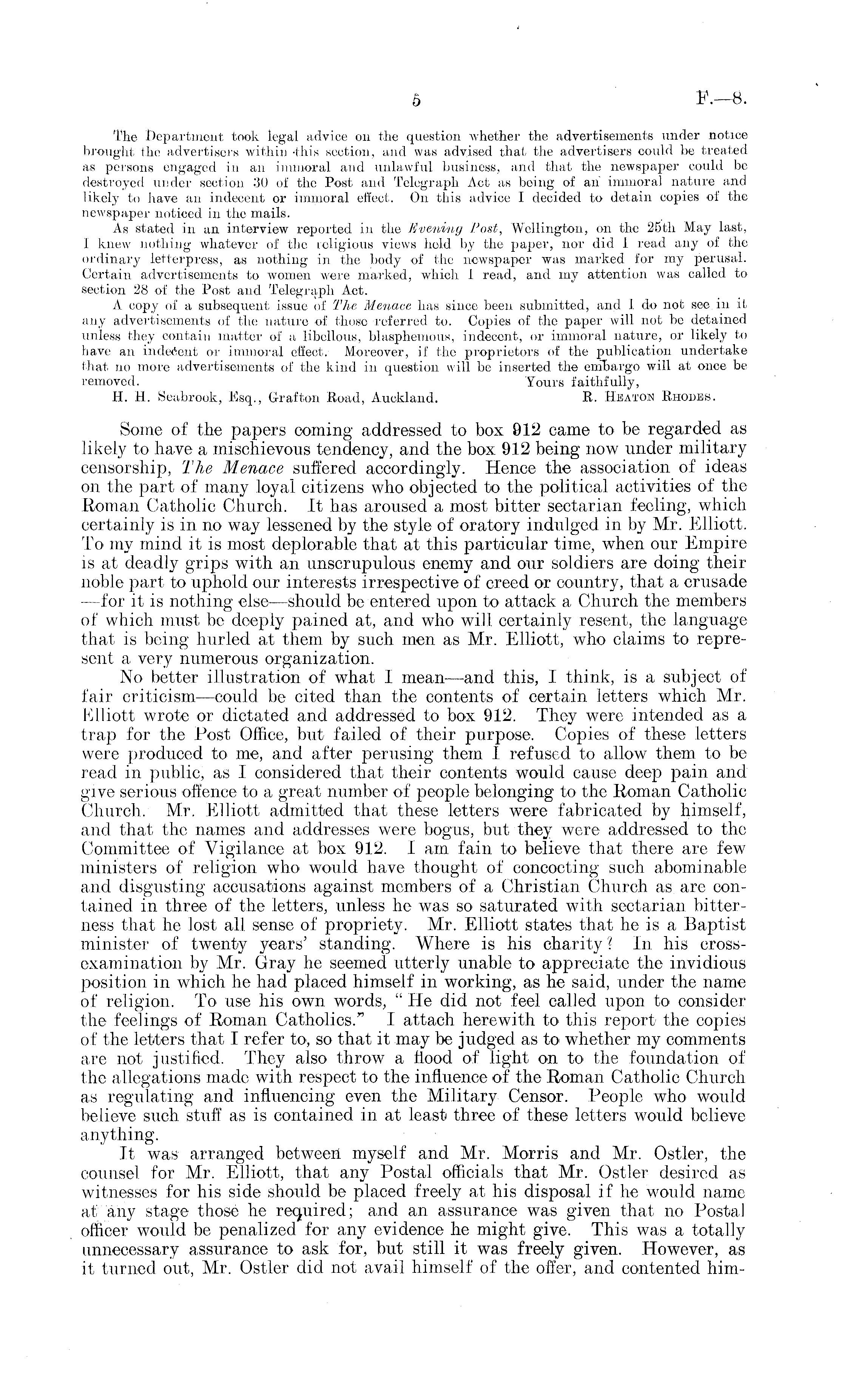 The Department took legal advice on the question whether the advertisements under notice brought the advertisers within -this section, and was advised that the advertisers could be treated as persons engaged in an immoral and unlawful business, and that the newspaper could be destroyed under section 30 of the Post and Telegraph Act as being of ah immoral nature and likely to have an indecent or immoral effect. On this advice I decided to detain copies of the newspaper noticed in the mails. As stated in an interview reported in the Evening Post, Wellington, on the 25th May last, I knew nothing whatever of the, religious views held by the paper, nor did 1 read any of the ordinary letterpress, as nothing in the body of the newspaper was marked for my perusal. Certain advertisements to women were marked, which I read, and my attention was called to section 28 of the Post and Telegraph Act. A copy of a subsequent issue of The Menace has since been submitted, and I do not see in it any advertisements of the nature of those referred to. Copies of the paper will not be detained unless they contain matter of a libellous, blasphemous, indecent, or immoral nature, or likely to have an indecent or immoral effect. Moreover, if the proprietors of the publication undertake that no more advertisements of the kind in question will be inserted the embargo will at once be removed. Yours faithfully, H. H. Seabrook, Esq., Grafton Road, Auckland. R. Heaton Rhodes. Some of the papers coming addressed to box 912 came to be regarded as likely to have a mischievous tendency, and the box 912 being now under military censorship, The Menace suffered accordingly. Hence the association of ideas on the part of many loyal citizens who objected to the political activities of the Roman Catholic Church. It has aroused a most bitter sectarian feeling, which certainly is in no way lessened by the style of oratory indulged in by Mr. Elliott. To my mind it is most deplorable that at this particular time, when our Empire is at deadly grips with an unscrupulous enemy and our soldiers are doing their noble part to uphold our interests irrespective of creed or country, that a crusade —for it is nothing else—should be entered upon to attack a Church the members of which must be deeply pained at, and who will certainly resent, the language that is being hurled at them by such men as Mr. Elliott, who claims to represent a very numerous organization. No better illustration of what I mean —and this, I think, is a subject of fair criticism—could be cited than the contents of certain letters which. Mr. Klliott wrote or dictated and addressed to box 912. They were intended as a trap for the Post Office, but failed of their purpose. Copies of these letters were produced to me, and after perusing them I refused to allow them to be read in public, as I considered that their contents would cause deep pain and give serious offence to a great number of people belonging to the Roman Catholic Church. Mr. Elliott admitted that these letters were fabricated by himself, and that the names and addresses were bogus, but they were addressed to the Committee of Vigilance at box 912. I am fain to' believe that there are few ministers of religion who would have thought of concocting such abominable and disgusting accusations against members of a Christian Church as are contained in three of the letters, unless he was so saturated with sectarian bitterness that he lost all. sense of propriety. Mr. Elliott states that he is a Baptist minister of twenty years' standing. Where is his charity ? In his crossexamination by Mr. Gray he seemed utterly unable to appreciate the invidious position in which he had placed himself in working, as he said, under the name of religion. To use his own words, "He did not feel called upon to consider the feelings of Roman Catholics." I attach herewith to this report the copies of the letters that I refer to, so that it may be judged as to whether my comments are not justified. They also throw a flood of light on to the foundation of the allegations made with respect to the influence of the Roman Catholic Church as regulating and influencing even the Military Censor. People who would believe such, stuff as is contained, in at least three of these letters would believe anything. It was arranged between myself and Mr. Morris and Mr. Ostler, the counsel for Mr. Elliott, that any Postal officials that Mr. Ostler desired as witnesses for his side should be placed freely at his disposal if he would name at any stage those he required; and an assurance was given that no Postal officer would be penalized for any evidence he might give. This was a totally unnecessary assurance to ask for, but still it was freely given. However, as it turned out, Mr. Ostler did not avail himself of the offer, and contented him-