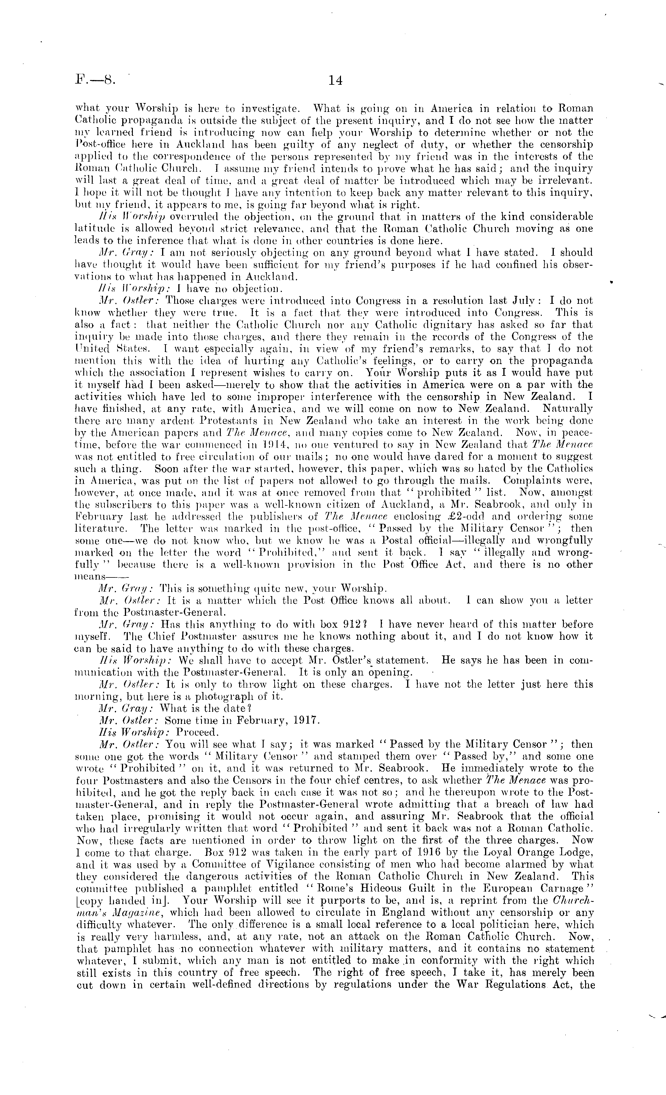 what your Worship is here to investigate. What is going on in America in relation to Roman Catholic propaganda is outside the subject of the present inquiry, and I do not see how the matter my learned friend is introducing now can help your Worship to determine whether or not the Post-office here in Auckland has been guilty of any neglect of duty, or whether the censorship applied to the correspondence of the persons represented by my friend was in the interests of the Roman Catholic Church, 1 assume my friend intends to prove what he has said; and the inquiry will last a great deal of time, and a great deal of matter be introduced which may be irrelevant. I hope it will not be thought I have any intention to keep back any matter relevant to this inquiry, bul my friend, it appears to me, is going far beyond what is right. His Worship overruled the objection, on the ground that in matters of the kind considerable latitude is allowed beyond strict relevance, and that the Roman Catholic Church moving as one leads to the inference that what is done in other countries is done here. Mr. Gray: lam not seriously objecting on any ground beyond what 1 have stated. I should have thought it would have been sufficient for my friend's purposes if he had confined his observations to what has happened in Auckland. His Worship: I have no objection. Mr. Ostler: Those charges were introduced into Congress in a resolution last July: I do not know whether they were true. It is a fact that they were introduced into Congress. This is also a fact : that neither the Catholic Church nor any Catholic dignitary lias asked so far that inquiry be made into those charges, and (here they remain in the records of the Congress of the United States. I want especially again, in view of my friend's remarks, to say that, I do not mention this with the idea of hurting any Catholic's feelings, or to carry on the propaganda which the association I represent wishes to carry on. Your Worship puts it as I would have put it myself had I been asked—merely to show that the activities in America were on a par with the activities which have led to some improper interference with the censorship in New Zealand. I have finished, at any rate, with America., and we will come on now to New Zealand. Naturally there are many ardent Protestants in New Zealand who fake an interest in the work being done by-the American papers and The Menace, and many copies come to New Zealand. Now, in peacetime, before the war commenced in 1914, no one ventured to say in New Zealand that The Menace was not entitled to free circulation of our mails; no one would have dared for a moment to suggest. such a thing. Soon after the war started, however, this paper, which was so hated by the Catholics in America, was put on the list of papers not allowed to go through the mails. Complaints were, however, at once made, and it was at once removed from that " prohibited " list. Now, amongst the subscribers to this paper was a well-known citizen of Auckland, a Mr. Seabrook, and only in February last he addressed the publishers of The Menace enclosing £2-odd and ordering some literature. The letter was marked in the post-office, "Passed by the Military Censor"; then some one—we do not know who, but we know he was a Postal official—illegally and wrongfully marked on the letter the word "Prohibited," and sent it back. 1 say "illegally and wrongfully " because there is a well-known provision in the Post Office Act, and there is no other means Mr. Gray: This is something quite new, your Worship. Mr. Ostler: It is a, matter which the Post Office knows all about, I can show you a, letter from the Postmaster-General. Mr. Gray: Has this anything to do with box 912? I have never heard of this matter before myself. The Chief Postmaster assures me he knows nothing about it, and I do not know how it can be said to have anything to do with these charges. His Wcrrshi]}: We shall, have to accept Mr. Ostler's statement. He says he has been in communication with the Postmaster-General. It is only an opening. Mr. Ostler: It is only to throw light, on these charges. I have not the letter just here this morning, but here is a photograph of it. Mr. Gray: What is the date? Mr. Ostler: Some time in February, 1917. His Worship): Proceed. Mr. Ostler: You will see what I say; it was marked " Passed by the Military Censor "; then some one got the words " Military Censor " and stamped them over " Passed by," and some one wrote " Prohibited " on it, and it was returned to Mr, Seabrook. He immediately wrote to the four Postmasters and also the Censors in the four chief centres, to ask whether The Menace was prohibited, and he got the reply back in each case it was not so ; and he thereupon wrote to the Post-master-General, and in reply the Postmaster-General wrote admitting thai a breach of law had taken place, promising it would not occur again, and assuring Mr. Seabrook that the official who had irregularly written that word "Prohibited " and sent it back was not a Roman Catholic. Now, these facts are mentioned in order to throw light on the first of the three charges. Now I come to that charge. Box 912 was taken in the early part of 1916 by the Loyal Orange Lodge, and it was used b)' a, Committee of Vigilance consisting of men who had become alarmed by what they considered the dangerous activities of the Roman Catholic Church in New Zealand. This committee published a pamphlet entitled "Rome's Hideous Guilt in the European Carnage" [copy handed inj. Your Worship will see it purports to be, and is, a reprint from the Churchman's Magazine, which had been allowed to oirculate in England without any censorship or any difficulty whatever. The only difference is a small local reference to a local politician here, which is really very harmless, and, at any rate, not an attack on the Roman Catholic Church. Now, that pamphlet has no connection whatever with military matters, and it contains no statemen
