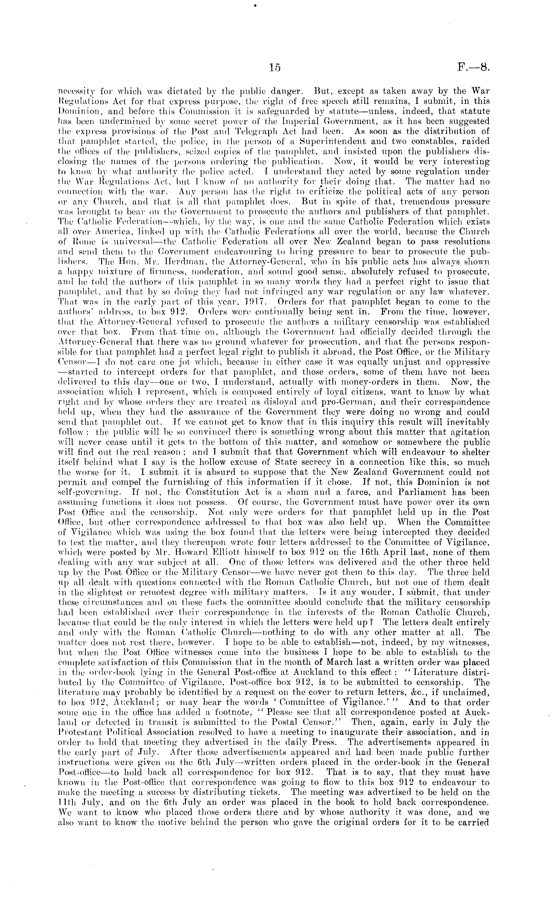 necessity for which was dictated by the public danger. But, except as taken away by the War Regulations Act for that express purpose, the right of free speech still remains, I submit, in this Dominion, and before this Commission it is safeguarded by statute—unless, indeed, that statute has been undermined by some secret power of the Imperial Government, as it has been suggested the express provisions of the Post and Telegraph Act had been. As soon as the distribution of that pamphlet started, the police, in the person of a Superintendent, and two constables, raided the offices of the publishers, seized copies of the pamphlet, and insisted upon the publishers disclosing the names of the persons ordering the publication. Now, it would be very interesting to know by what authority the police acted. I understand they acted by some regulation under the War Regulations Act, but 1 know of no authority for their doing that. The matter had no connection with the war. Any person has the right to criticize the political acts of any person or any Church, and that is all that pamphlet does. But in spite of that, tremendous pressure was brought to bear on the Government to prosecute the authors and publishers of that pamphlet. The Catholic Federation—which, by the way, is one and the same Catholic Federation which exists all over America, linked up with the Catholic Federations all over the world, because the Church of Rome is universal—the Catholic' Federation all over New Zealand began to pass resolutions and send them to the Government endeavouring to bring pressure to bear to prosecute the publishers. The Hon. Mr. Herdman, the Attorney-General, who in his public acts has always shown a happy mixture of firmness, moderation, and sound good sense, absolutely refused to prosecute, and he told the authors of Ihis pamphlet in so many words they had a perfect right to issue that pamphlet, and that by so doing they had not infringed any war regulation or any law whatever. That was in the early part of this year. 1917. Orders for that pamphlet began to come to the authors' address, to box 912. Orders were continually being sent in. Front the time, however, that the Attorney-General refused to prosecute the authors a military censorship was established over that box. From that time on, although the Government had officially decided through the Attorney-General that there was no ground whatever for prosecution, and that the persons responsible for that pamphlet had a perfect legal right, to publish it, abroad, the Post, Office, or the Military Censor—l do not care one jot which, because in either case it was equally unjust and oppressive —started to intercept orders for that pamphlet, and those orders, some of them have not been delivered to this day—one or two, I understand, actually with money-orders in them. Now, the association which I represent, which is composed entirely of loyal citizens, want to know by what right and by whose orders they are treated as disloyal and pro-German, and their correspondence held up, when they had the assurance of the Government, they were doing no wrong and could send that pamphlet out. If we cannot get to know that in this inquiry this result will inevitably follow : the public will be so convinced there is something wrong about this matter that agitation will never cease until it gets to the bottom of this matter, and somehow or somewhere the public will find out the real reason ; and 1 submit that that Government which will endeavour to shelter itself behind what, I say is the hollow excuse of State secrecy in a connection like this, so much the worse for it. I submit it is absurd to suppose that the New Zealand Government, could not permit and compel the furnishing of this information if it chose. If not, this Dominion is not self-governing. If nol, flu- Constitution Act is a sham and a farce, and Parliament has been assuming functions it does not possess. Of course, the Government must have power over its own Post Office and the censorship. Not, only were orders for that pamphlet held up in the Post Office, but other correspondence addressed to that box was also held up. When the Committee of Vigilance which was using the box found that the letters were being intercepted they decided to test the matter, and they I hereupon wrote four letters addressed to the Committee of Vigilance, which were posted by Mr. Howard Elliott himself to box 912 on the 16th April last, none of them dealing with any war subject at all. One of those letters was delivered and the other three held up by the Post Office or the Military Censor—we have never got them to this day. The three held up all dealt with questions connected with the Roman Catholic Church, but not one of them dealt in the slightest or remotest degree with military matters. Is it any wonder, I submit, that under these circumstances and on these facts the committee should conclude that the military censorship had been established over their correspondence in Ihe interests of the Roman Catholic Church, because that could be the only interest in which the letters were held up? The letters dealt entirely and only with the Roman Catholic Church —nothing to do with any other matter at all. The matter does not rest there, however. I hope to lie able to establish—not, indeed, by my witnesses, but when the Post Office witnesses come into the business 1 hope to be able to establish to the complete satisfaction of this Commission that in the month of March last a written order was placed in the order-book lying in the General Post-office at Auckland to this effect: "Literature distributed by the Committee of Vigilance, Post-office box 912, is to be submitted to censorship. The literature may probably be identified by a request on the cover to return letters, &c., if unclaimed, to box 912, Auckland; or may bear the words ' Committee of Vigilance.' " And to that order some one in the office has added a footnote, " Ple