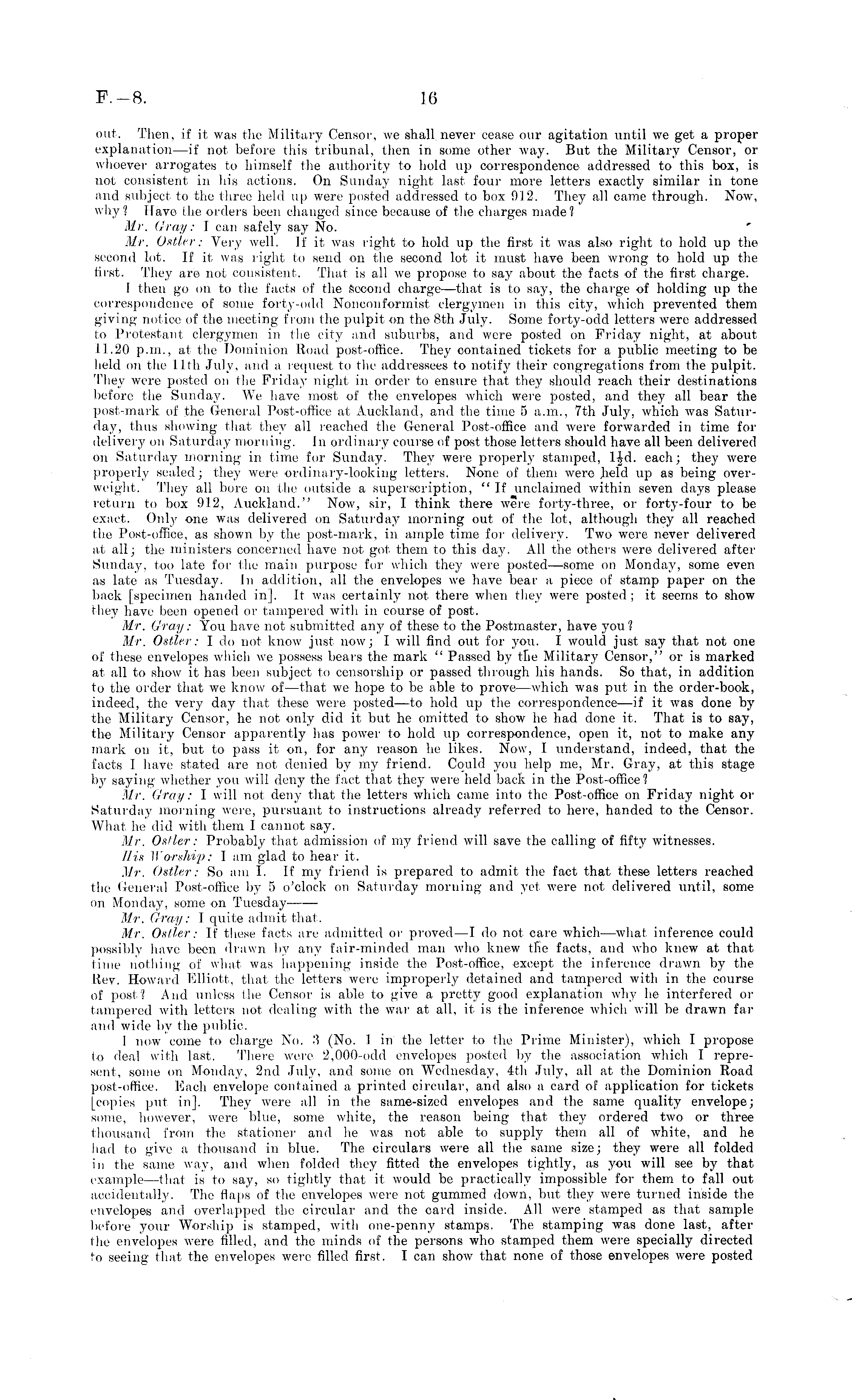 out. Then, if it was the Military Censor, we shall never cease our agitation until we get a proper explanation—if not before this tribunal, then in some other way. But the Military Censor, or whoever arrogates to himself the authority to hold up correspondence addressed to this box, is not consistent in his actions. On Sunday night last four more letters exactly similar in tone and subject to the three held up were posted addressed to box 912. They all came through. Now, why? Have the orders been changed since because of the charges made? Mr. Gray: I can safely say No. Mr. Ostler: Very well. If it was right to hold up the first it was also right to hold up the second lot. If it was right to send on the second lot it must have been wrong to hold up the first. They are not consistent. That is all we propose to say about the facts of the first charge. 1 then go on to the facts of the second charge—that is to say, the charge of holding up the correspondence of some forty-odd Nonconformist, clergymen in this city, which prevented them giving notice of the meeting from the pulpit on the Bth July. Some forty-odd letters were addressed to Protestant clergymen in the city and suburbs, and were posted on Friday night, at about 11.20 p.m., at the Dominion Road post-office. They contained tickets for a public meeting to be held on the 11th July, and a request to the addressees to notify their congregations from the pulpit. They were posted on the Friday night in order to ensure that they should reach their destinations before the Sunday. We have most of the envelopes which were posted, and they all bear the post-mark of the General Post-office at Auckland, and the time 5 a.m., 7th July, which was Saturday, thus showing that they all reached the General Post-office and were forwarded in time for delivery on Saturday morning. In ordinary course of post those letters should have all been delivered on Saturday morning in time for Sunday. They were properly stamped, each; they were properly sealed; they were ordinary-looking letters. None of them were held up as being overweight. They all bore on the outside a superscription, "If unclaimed within seven days please return to box 912, Auckland." Now, sir, I think there were forty-three, or forty-four to be exact. Only one was delivered on Saturday morning out of the lot, although they all reached the Post-office, as shown by the post-mark, in ample time for delivery. Two were never delivered at all; the ministers concerned have not got them to this day. All the others were delivered after Sunday, too late for the main purpose for which they were posted—some on Monday, some even as late as Tuesday. In addition, all the envelopes we have bear a piece of stamp paper on the back [specimen handed in]. It was certainly not there when they were posted ;it seems to show they have been opened or tampered with in course of post. Mr. Gray: You have not submitted any of these to the Postmaster, have you? Mr. Ostler: Ido not know just now; I will find out for you. I would just say that not one of these envelopes which we possess bears the mark " Passed by the Military Censor," or is marked at all to show it has been subject to censorship or passed through his hands. So that, in addition to the older that we know of—that we hope to be able to prove—which was put in the order-book, indeed, the very day that these were posted—to hold up the correspondence—if it was done by the Military Censor, he not only did it but he omitted to show he had done it. That is to say, the Military Censor apparently has power to hold up correspondence, open it, not to make any mark on it, but to pass it on, for any reason he likes. Now, I understand, indeed, that the facts I have stated are not denied by my friend. Could you help me, Mr. Gray, at this stage by saying whether you will deny the fact that they were held back in the Post-office? Mr. Gray: I will not deny that the letters which came into the Post-office on Friday night or Saturday morning were, pursuant to instructions already referred to here, handed to the Censor. What he did with them I cannot say. Mr. Ostler: Probably that admission of my friend will save the calling of fifty witnesses. His Worship: I am glad to hear it. Mr. Ostler: So am I. If my friend is prepared to admit the fact that these letters reached the General Post-office by 5 o'clock on Saturday morning and yet were not delivered until, some on Monday, some on Tuesday Mr. Gray: I quite admit that. Mr. Ostler: If these facts are admitted or proved—l do not care which —what inference could possibly have been drawn by any fair-minded man who knew the facts, and who knew at that lime nothing of what was happening inside the Post-office, except the inference drawn by the Rev. Howard Elliott, that the letters were improperly detained and tampered with in the course of post? And unless the Censor is able to give a pretty good explanation why he interfered or tampered with letters not dealing with the war at all, it is the inference which will be drawn far and wide by the public. 1 now come to charge No. 3 (No. I in the letter to the Prime Minister), which I propose to deal with last. There were 2,000-odd envelopes posted by the association which I represent, some on Monday, 2nd July, and some on Wednesday, 4th July, all at the Dominion Road post-office. Each envelope contained a printed circular, and also a card of application for tickets [copies put in]. They were all in the same-sized envelopes and the same quality envelope; some, however, were blue, some white, the reason being that they ordered two or three thousand from the stationer and he was not able to supply them all of white, and he had to give a thousand in blue. The circulars were all the same size; they were all folded in the same way, and when folded they fitted the envelopes tightly, as you will see by that example—that, is to say, so tightly that it would be practically impossible fo