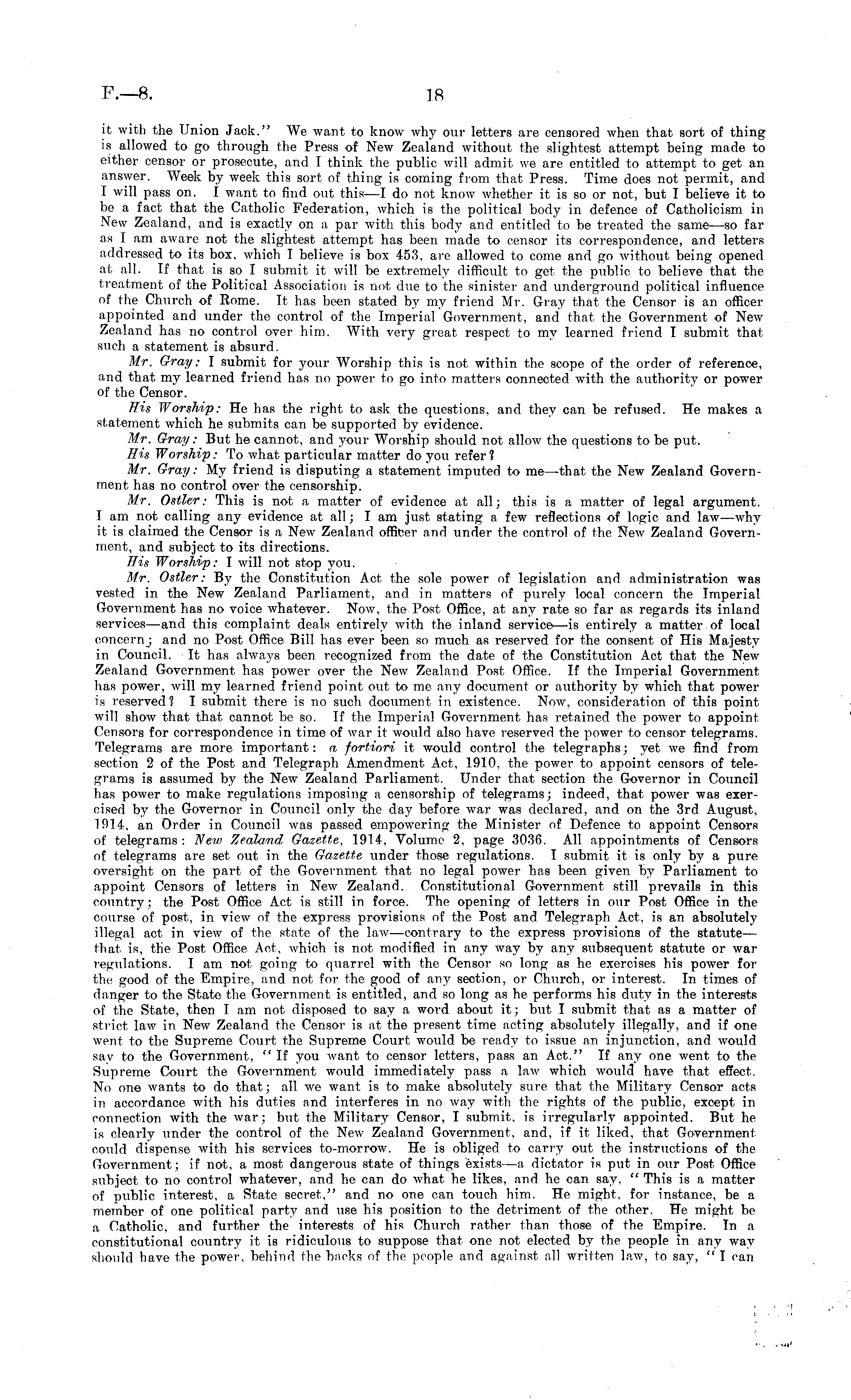 it with the Union Jack." We want to know why our letters are censored when that sort of thing is allowed to go through the Press of New Zealand without the slightest attempt being made to either censor or prosecute, and I think the public will admit we are entitled to attempt to get an answer. Week by week this sort, of thing is coming from that Press. Time does not permit, and I will pass on. I want to find out this—l do not know whether it is so or not, but I believe it to be a fact that the Catholic Federation, which is the political body in defence of Catholicism in New Zealand, and is exactly on a par with this body and. entitled to be treated the same' —so far as I am aware not the slightest attempt has been made to censor its correspondence, and letters addressed to its box, which I believe is box 453, are allowed to come and go without being opened at all. If that is so I submit it will be extremely difficult to get the public to believe that the treatment of the Political Association is not due to the sinister and underground political influence of the Church of Rome. It has been stated by my friend Mr. Gray that the Censor is an officer appointed and under the control of the Imperial Government, and that the Government of New Zealand has no control over him. With very great respect to my learned, friend I submit that such a statement is absurd. Mr. Gray: I submit for your Worship this is not within the scope of the order of reference, and that my learned friend has no power to go into matters connected with the authority or power of the Censor. His Worship: He has the right to ask the questions, and they can be refused. He makes a statement which he submits can be supported by evidence. Mr. Gray: But he cannot, and your Worship should not allow the questions to be put. His Worship: To what particular matter do you refer? Mr. Gray: My friend is disputing a statement imputed to me—that the New Zealand Government has no control over the censorship. Mr. Ostler: This is not a matter of evidence at all; this is a matter of legal argument. lam not calling any evidence at all; lam just stating a few reflections of logic and law—why it is claimed the Censor is a New Zealand officer and under the control of the New Zealand Government, and subject to its directions. His Worship: I will not stop you. Mr. Ostler: By the Constitution Act the sole power of legislation and administration was vested in the New Zealand Parliament, and in matters of purely local concern the Imperial. Government has no voice whatever. Now, the Post Office, at any rate so far as regards its inland services—and this complaint deals entirely with the inland service—is entirely a matter of local concernj and no Post Office Bill has ever been so much as reserved for the consent of His Majesty in Council. It has always been recognized from the date of the Constitution Act that the New Zealand Government has power over the New Zealand Post Office. If the Imperial Government has power, will my learned friend point out to me any document or authority by which that power is reserved? I submit there is no such document in existence. Now, consideration of this point will show that that cannot be so. If the Imperial Government has retained the power to appoint Censors for correspondence in time of war it would also have reserved the power to censor telegrams. Telegrams are more important: a, fortiori it would control the telegraphs; yet we find from section 2 of the Post and Telegraph Amendment Act, 1910, the power to appoint censors of telegrams is assumed by the New Zealand Parliament. Under that section the Governor in Council has power to make regulations imposing a censorship of telegrams; indeed, that power was exercised by the Governor in Council only the day before war was declared, and on the 3rd August, 1914, an Order in Council was passed empowering the Minister of Defence to appoint Censors of telegrams: New Zealand Gazette, 1914, Volume 2, page 3036. All appointments of Censors of telegrams are set out in the Gazette under those regulations. I submit it is only by a pure oversight on the part of the Government that no legal power has been given by Parliament to appoint Censors of letters in New Zealand. Constitutional Government still prevails in this country; the Post Office Act is still in force. The opening of letters in our Post Office in the course of post, in view of the express provisions of the Post and Telegraph Act, is an absolutely illegal act in view of the state of the law—contrary to the express provisions of the statute — that is, the Post Office Act, which is not modified in any way by any subsequent statute or war regulations. I am not going to quarrel with the Censor so long as he exercises his power for the good of the Empire, and not for the good of any section, or Church, or interest. In times of danger to the State the Government is entitled, and so long as he performs his duty in the interests of the State, then I am not disposed to say a word about it; but I submit that as a matter of strict law in New Zealand the Censor is at the present time acting absolutely illegally, and if one went to the Supreme Court the Supreme Court would be ready to issue an injunction, and would say to the Government, "If you want to censor letters, pass an Act." If any one went to the Supreme Court the Government would immediately pass a law which would have that effect. No one wants to do that; all we want is to make absolutely sure that the Military Censor acts in accordance with his duties and interferes in no way with the rights of the public, except in connection with the war; but the Military Censor, I submit, is irregularly appointed. But he is clearly under the control of the New Zealand Government, and, if it liked, that Government could dispense with his services to-morrow. He is obliged to carry out the instructions of the Government; if not, a most dangerous state of things exists—