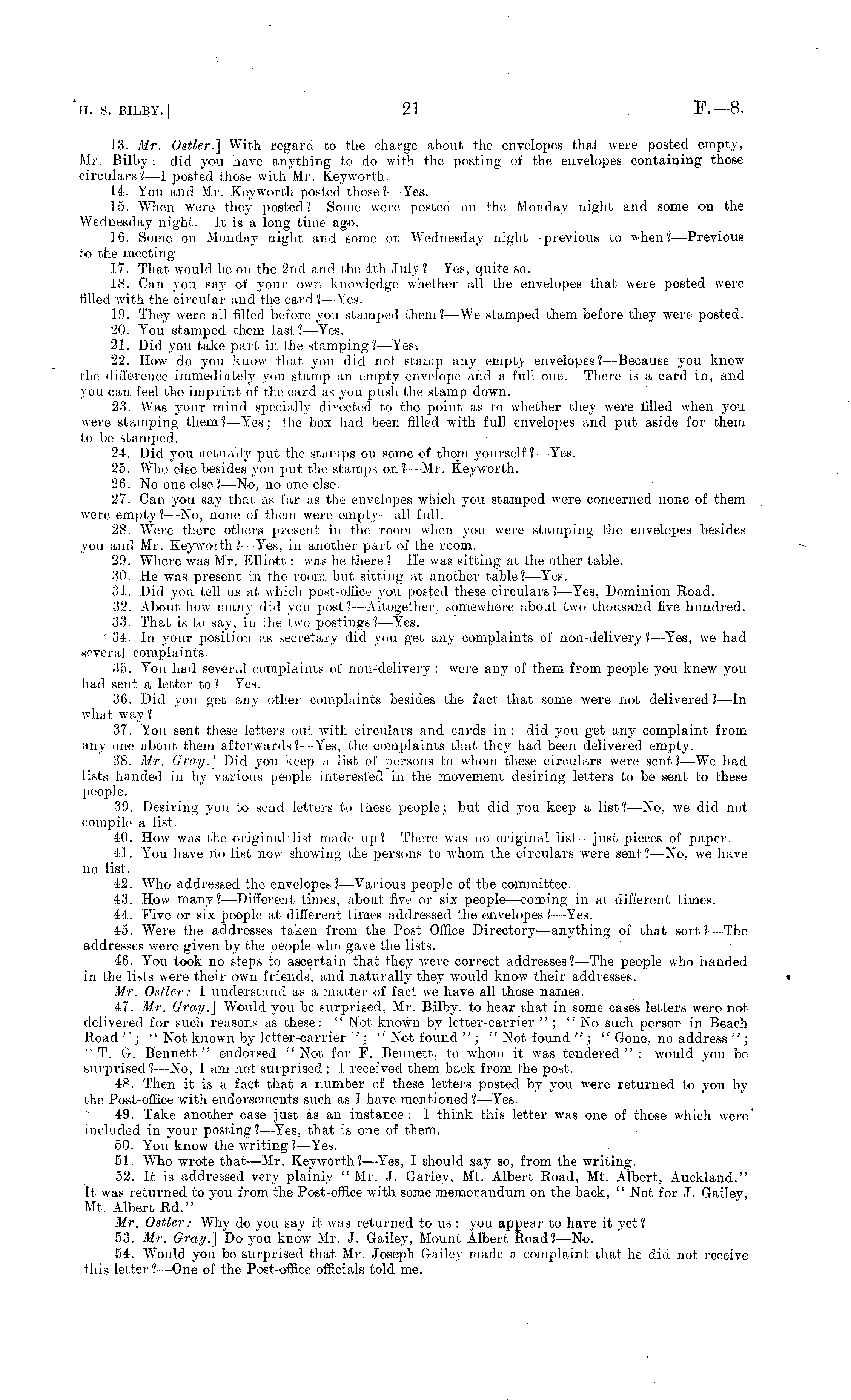 13. Mr. Ostler.] With regard to the charge about the envelopes that were posted empty, Mr. Bilby : did you have anything to do with the posting of the envelopes containing those circulars?—I posted those with Mr. Keyworth. 14. You and Mr. Keyworth posted those? —Yes. 15. When were they posted?—Some were posted on the Monday night and some on the Wednesday night. It is a long time ago. 16. Some on Monday night and some on Wednesday night—previous to when?—Previous to the meeting. 17. That would be on the 2nd and the 4-th July?—Yes, quite so. 18. Can you say of your own knowledge whether all the envelopes that were posted were filled with the circular and the card? —Yes. 19. They were all. filled before you stamped them? —We stamped them before they were posted. 20. You stamped them last ?- —Yes. 21. Did you take part in the stamping?—Yesi 22. How do you know that you did not stamp any empty envelopes?—Because you know the difference immediately you stamp an empty envelope and a full one. There is a card in, and you can feel the imprint of the card as you push the stamp down. 23. Was your mind specially directed to the point as to whether they were filled when you were stamping them ?—Yes; the box had been filled with full envelopes and put aside for them Lo be stamped. 24. Did you actually put the stamps on some of them yourself?—Yes. 25. Who else besides you put the stamps on? —Mr. Keyworth. 26. No one else?—No, no one else. 27. Can you say that as far as the envelopes which you stamped were concerned none of them were empty?—No, none of them were empty —all full. 28. Were there others present in the room when you were stamping the envelopes besides you and Mr. Keyworth? —Yes, in another part of the room. 29. Where was Mr. Elliott : was he there ?—He was sitting at the other table. 30. He was present, in the room but sitting at another table?—Yes. 31. Did you. tell us at which post-office you posted these circulars?—Yes, Dominion Road. 32. About how mam- did you post?—Altogether, somewhere about two thousand five hundred. 33. That is to say, in the two postings? —Yes. ' 34. In your position as secretary did you get any complaints of non-delivery?—Yes, we had several complaints. 35. You had several complaints of non-delivery : were any of them from people you knew you had sent a letter to? —Yes. 36. Did you get any other complaints besides the fact that some were not delivered?—In what way ? 37. You sent these letters out with circulars and cards in : did you get any complaint from any one about them afterwards?—Yes, the complaints that they had been delivered empty. 38. Mr. Gray.] Did you keep a list of persons to whom these circulars were sent? —We had lists handed in by various people interested in the movement desiring letters to be sent to these people. 39. Desiring you to send letters to these people; but did you keep a list?—No, we did not compile a list. 40. How was the original list made up?—There was no original list —just pieces of paper. 41. You have no list now showing the persons to whom the circulars were sent? —No, we have no list. 42. Who addressed the envelopes?—Various people of the committee. 43. How many?—Different times, about five or six people—coming in at different times. 44. Five or six people at different times addressed the envelopes?—Yes. 45. Were the addresses taken from the Post Office Directory —anything of that sort?—The addresses were given by the people who gave the lists. .46. You took no steps to ascertain that they were correct addresses?—The people who handed in the lists were their own friends, and naturally they would know their addresses. Mr. Ostler: I understand as a matter of fact we have all those names. 47. Mr. Gray.] Would you be surprised, Mr. Bilby, to hear that in some cases letters were not delivered for such reasons as these: " Not known by letter-carrier "; " No such person in Beach Road " ; " Not known by letter-carrier " ; " Not found " ; " Not found "; " Gone, no address " ; "T. G. Bennett" endorsed "Not for F. Bennett, to whom it was tendered": would you be surprised 1 —No, I am not surprised; I received them back from the post. 48. Then it is a fact that a number of these letters posted by you were returned to you by the Post-office with endorsements such as I have mentioned?—Yes. 49. Take another case just as an instance: I think this letter was one of those which were' included in your posting?—Yes, that is one of them. 50. You know the writing?—Yes. 51. Who wrote that —Mr. Keyworth? —Yes, I should say so, from the writing. 52. It is addressed very plainly " Mr. J. Garley, Mt. Albert Road, Mt. Albert, Auckland." It was returned to you from the Post-office with some memorandum on the back, " Not for J. Gailey, Mt. Albert Rd." Mr. Ostler: Why do you say it was returned to us : you appear to have it yet? 53. Mr. Gray.] Do you know Mr. J. Gailey, Mount Albert Road?—No. 54. Would you be surprised that Mr. Joseph Gailey made a complaint that he did not receive this letter?—One of the Post-office officials told me.