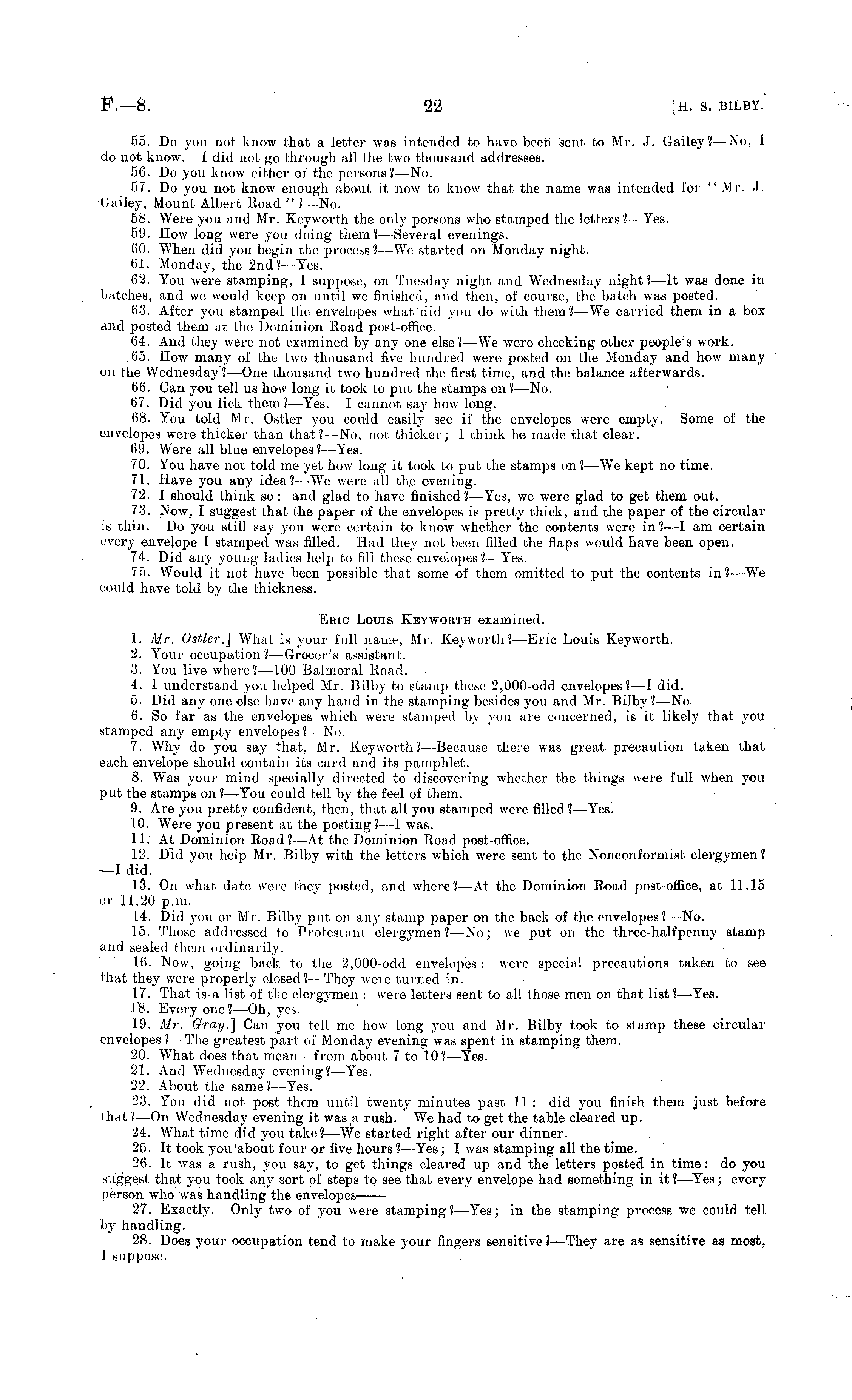 55. Do you not know that a letter was intended to have been sent to Mr. J. Gailey ?—No, 1 do not know. I did not go through all the two thousand addresses. 56. Do you know either of the persons?— No. 57. Do you not know enough about it now to know that the name was intended for " Mr- J, Gailey, Mount Albert Road " ?—No. 58. Were you and Mr. Keyworth the only persons who stamped the letters?— Yes. 59. How long were you doing them? —Several evenings. 60. When did you begin the process?—We started on Monday night. 61. Monday, the 2nd? —Yes. 62. You were stamping, I suppose, on Tuesday night and Wednesday night?—lt was done in batches, and we would keep on until we finished, and then, of course, the batch was posted. 63. After you stamped the envelopes what did you do with them? —We carried them in a box and posted them at the Dominion Road post-office. 64. And they were not examined by any one else? —We were checking other people's work. .65. How many of the two thousand five hundred were posted on the Monday and how many on the Wednesday ?—One thousand two hundred the first time, and the balance afterwards. 66. Can you tell us how long it took to put the stamps on ? —No. 67. Did you lick them? —Yes. I cannot say how long. 68. You told Mi\ Ostler you could easily see if the envelopes were empty. Some of the envelopes were thicker than that?—No, not thicker; I think he made that clear. 69. Were all blue envelopes?— Yes. 70. You have not told me yet how long it took to put the stamps on ?—We kept no time. 71. Have you any idea?—We were all the evening. 72. I should think so : and glad to have finished?— Yes, we were glad to get them out. 73. Now, I suggest that the paper of the envelopes is pretty thick, and the paper of the circular is thin. Do you still say you were certain to know whether the contents were in ?—I am certain every envelope I stamped was filled. Had they not been filled the flaps would have been open. 74. Did any young ladies help to fill these envelopes?— Yes. 75. Would it not have been possible that some of them omitted to put the contents in?—We could have told by the thickness. Eric Louis Keyworth examined. 1. Mr. Ostler.] What is your full name, Mr. Keyworth?—Eric Louis Keyworth. 2. Your occupation?— Grocer's assistant. 3. You live where? —100 Balmoral Road. 4. 1 understand you helped Mr. Bilby to stamp these 2,000-odd envelopes?—l did. 5. Did any one else have any hand in the stamping besides you and Mr. Bilby?—No6. So far as the envelopes which were stamped by you are concerned, is it likely that you stamped any empty envelopes?— No. 7. Why do you say that, Mr. Keyworth?—Because there was great precaution taken that each envelope should contain its card and its pamphlet. 8. Was your mind specially directed to discovering whether the things were full when you put the stamps on ?—-You could tell by the feel of them. 9. Are you pretty confident, then, that all you stamped were filled? —Yes. 10. Were you present at the posting?—l was. 11. At Dominion Road? —At the Dominion Road post-office. 12. Did you help Mr. Bilby with the letters which were sent to the Nonconformist clergymen? —I did. 13. On what date were they posted, and where?—At the Dominion Road post-office, at 11.15 or 11.20 p.m. 14. Did you or Mr. Bilby put on any stamp paper on the back of the envelopes? —No. 15. Those addressed to Protestant clergymen?—No; we put on the three-halfpenny stamp and sealed them ordinarily. 16. Now, going bads, to the 2,000-odd envelopes: were special precautions taken to see that they were properly closed?— They were turned in. 17. That isa list of the clergymen : were letters sent to all those men on that list?— Yes. 18. Every one?—Oh, yes. 19. Mr. Gray.] Can you tell me how long you and Mr. Bilby took to stamp these circular envelopes ?—The greatest part of Monday evening was spent in stamping them. 20. What does that mean—from about 7 to lO?—Yes. 21. And Wednesday evening?— Yes. 22. About the same? —Yes. 23. You did not post them until twenty minutes past 11 : did you finish them just before that?—On Wednesday evening it was a rush. We had to get the table cleared up. 24. What time did you take?—We started right after our dinner. 25. It took you about four or five hours ?—Yes; I was stamping all the time. 26. It was a rush, you say, to get things cleared up and the letters posted in time: do you suggest that you took any sort of steps to see that every envelope had something in it ?—Yes; every person who was handling the envelopes— 27. Exactly. Only two of you were stamping?— Yes; in the stamping process we could tell by handling. 28. Does your occupation tend to make your fingers sensitive? —They are as sensitive as most, 1 suppose.