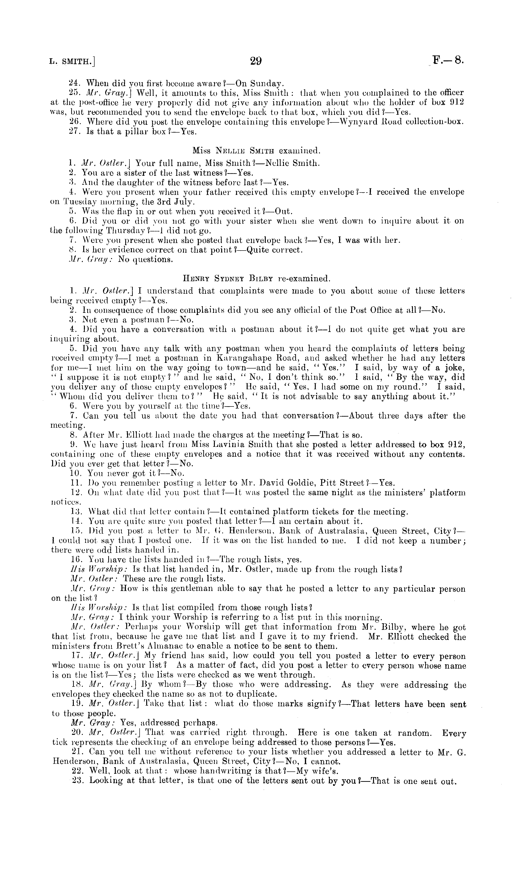 24. When did you first become aware?- —On Sunday. 25. Mr. Gray.] Well, it amounts to this, Miss Smith : that when you complained to the officer at the post-office he very properly did not give any information about who the holder of box 912 was, but recommended you to send the envelope back to that box, which you did?— Yes. 26. Where did you post the envelope containing this envelope?—Wynyard Road collection-box. 27. Is that a pillar box?— Yes. Miss Nellie Smith examined. 1. Mr. Ostler.] Your full name, Miss Smith? —Nellie Smith. 2. You are a sister of the last witness ?—Yes. 3. And the daughter of the witness before last? —Yes. 4. Were you present when your father received this empty envelope?—-I received the envelope on Tuesday morning, the 3rd July. 5. Was the flap in or out when you received it? —Out. 6. Did you or did you not go with your sister when she went down to inquire about it on the following Thursday?—l did not go. 7. Were you present when she posted that envelope back?— Yes, I was with her. 8. Is her evidence correct on that point?— Quite correct. Mr. Gray: No questions. Henry Sydney Bilby re-examined. 1. Mr. Ostler.] I understand that complaints were made to you about some of these letters being received empty? —Yes. 2. In consequence of those complaints did you see any official of the Post Office at all?— No. 3. Not even a postman?— No. 4. Did you have a conversation with a postman about it? —I do not quite get what you are inquiring about. 5. Did you have any talk with any postman when you heard the complaints of letters beingreceived empty?—l met a postman in Karangahape Road, and asked whether he had any letters for me—l met him on the way going to town —and he said, " Yes." I said, by way of a joke, " I suppose it is not empty? " and he said, " No, I don't think so." 1 said, "By the way, did you deliver any of those empty envelopes? " He said, " Yes, I had some on my round." I said, " Whom did you deliver them to? " He said, "It is not advisable to say anything about it." 6. Were you by yourself at the time?— Yes. 7. Can you tell us about the date you had that conversation? —About three days after the meeting. 8. After Mr. Elliott had made the charges at the meeting?— That is so. 9. We have just heard from Miss Lavinia Smith that she posted a letter addressed to box 912, containing one of these empty envelopes and a notice that it was received without any contents. Did you ever get that letter ?—No. 10. You never got it? —No. 11. Do you remember posting a letter to Mr. David Goldie, Pitt Street?— Yes. 12. On what date did you post that?—lt. was posted the same night as the ministers' platform notices. 13. What did that letter contain? —It contained platform tickets for the meeting. 14. You arc quite sure you posted that letter?—l am certain about it. 15. Did you post a, letter to Mr. G. Henderson, Bank of Australasia, Queen Street, City?— 1 could not say that I posted one. If it was on the list handed to me. I did not keep a number; there were odd lists handed in. 1.6. You have the lists handed in ?—The rough lists, yes. His Worship: Is that list handed in, Mr. Ostler, made up from the rough lists? Mr. Ostler: These are the rough lists. Mr. Gray: How is this gentleman able to say that he posted a letter to any particular person on the list ? His Worship: Is that list compiled from those rough lists? Mr. Gray: I think your Worship is referring to a list put in this morning. Mr. Ostler: Perhaps your Worship will get that information from Mr. Bilby, where he got that list from, because he gave me that list and I gave it to my friend. Mr. Elliott checked the ministers from Brett's Almanac to enable a notice to be sent to them. 17. Mr. Ostler.] My friend has said, how could you tell you posted a letter to every person whose name is on your list? As a matter of fact, did you post a letter to every person whose name is on the list? —Yes; the lists were checked as we went through. 18. Mr. Gray.] By whom? —By those who were addressing. As they were addressing the envelopes they checked the name so as not to duplicate. 19. Mr. Ostler.] Take that list: what do those marks signify?— That letters have been sent to those people. Mr. Gray: Yes, addressed perhaps. 20. Mr. Ostler.] That was carried right through. Here is one taken at random. Every tick represents the checking of an envelope being addressed to those persons?— Yes. 21. Can you tell me without reference to your lists whether you addressed a letter to Mr. G. Henderson, Bank of Australasia, Queen Street, City?—No, I cannot. 22. Well, look at that : whose handwriting is that? —My wife's. 23. Looking at that letter, is that one of the letters sent out by you?— That is one sent out.