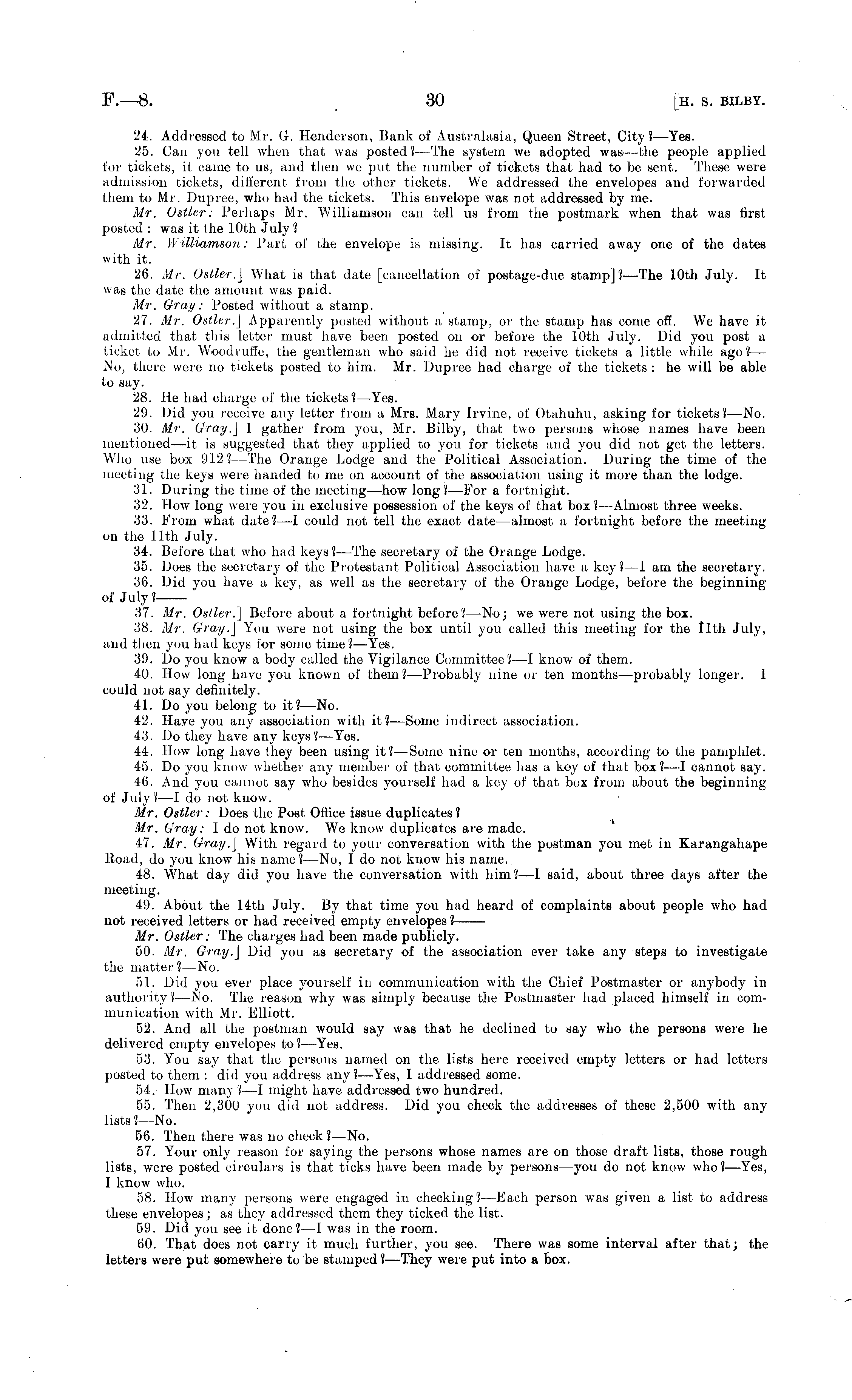 24. Addressed to Mr. G. Henderson, Bank of Australasia, Queen Street, City? —Yes. 25. Can you tell when that was posted? —The system we adopted was —the people applied for tickets, it came to us, and then we put the number of tickets that had to be sent. These were admission tickets, different from the other tickets. We addressed the envelopes and forwarded them to Mr. Dupree, who had the tickets. This envelope was not addressed by me. Mr. Ostler: Perhaps Mr. Williamson can tell us from the postmark when that was first posted : was it the 10th July ? Mr. Williamson: Part of the envelope is missing. It has carried away one of the dates with it. 26. Mr. Ostler.] What is that date [cancellation of postage-due stamp]?— The 10th July. It was the date the amount was paid. Mr. Gray: Posted without a stamp. 27. Mr. Ostler.] Apparently posted without a stamp, or the stamp has come off. We have it admitted that this letter must have been posted on or before the 10th July. Did you post a ticket to Mr. Woodruffe, the gentleman who said he did not receive tickets a little while ago? — No, there were no tickets posted to him. Mr. Dupree had charge of the tickets : he will be able to say. 28. He had charge of the tickets? —Yes. 29. Did you receive any letter from a Mrs. Mary Irvine, of Otahuhu, asking for tickets?— No. 30. Mr. Gray.] 1 gather from you, Mr. Bilby, that two persons whose names have been mentioned—it is suggested that they applied to you for tickets and you did not get the letters. Who use box 912? —The Orange Lodge and the Political Association. During the time of the meeting the keys were handed to me on account of the association using it more than the lodge. 31. During the time of the meeting—how long? —For a fortnight. 32. How long were you in exclusive possession of the keys of that box? —Almost three weeks. 33. From what date? —I could not tell the exact date —almost a fortnight before the meeting on the 11th July. 34. Before that who had keys?— The secretary of the Orange Lodge. 35. Does the secretary of the Protestant Political Association have a key? —1 am the secretary. 36. Did you have a key, as well as the secretary of the Orange Lodge, before the beginning of July ? 37. Mr. Ostler.] Before about a fortnight before? —No; we were not using the box. 38. Mr. Gray.] You were not using the box until you called this meeting for the llth July, and then you had keys for some time? —Yes. 39. Do you know a body called the Vigilance Committee? —I know of them. 40. How long have you known of them? —Probably nine or ten months—probably longer. I could not say definitely. 41. Do you belong to it? —No. 42. Have you any association with it?— Some indirect association. 43. Do they have any keys?— Yes. 44. How long have they been using it?— Some nine or ten months, according to the pamphlet. 45. Do you know whether any member of that committee has a key of that box? —I cannot say. 46. And you cannot say who besides yourself had a key of that box from about the beginning of July? —I do not know. Mr. Ostler: Does the Post Office issue duplicates? Mr. Gray: Ido not know. We know duplicates are made. 47. Mr. Gray.] With regard to your conversation with the postman you met in Karangahape Road, do you know his name? —No, I do not know his name. 48. What day did you have the conversation with him?—l said, about three days after the meeting. 49. About the 14th July. By that time you had heard of complaints about people who had not received letters or had received empty envelopes ? Mr. Ostler: The charges had been made publicly. 50. Mr. Gray.] Did you as secretary of the association ever take any steps to investigate the matter? —No. 51. Did you ever place yourself in communication with the Chief Postmaster or anybody in authority?— No. The reason why was simply because the Postmaster had placed himself in communication with Mr. Elliott. 52. And all the postman would say was that he declined to say who the persons were he delivered empty envelopes to?— Yes. 53. You say that the persons named on the lists here received empty letters or had letters posted to them : did you address any?— Yes, I addressed some. 54. How many ?—I might have addressed two hundred. 55. Then 2,300 you did not address. Did you check the addresses of these 2,500 with any lists?— No. 56. Then there was no check ? —No. 57. Your only reason for saying the persons whose names are on those draft lists, those rough lists, were posted circulars is that ticks have been made by persons—you do not know who? —Yes, I know wdio. 58. How many persons were engaged in checking? —Each person was given a list to address these envelopes; as they addressed them they ticked the list. 59. Did you see it done?—l was in the room. 60. That does not carry it much further, you see. There was some interval after that; the letters were put somewhere to be stamped?— They were put into a box.