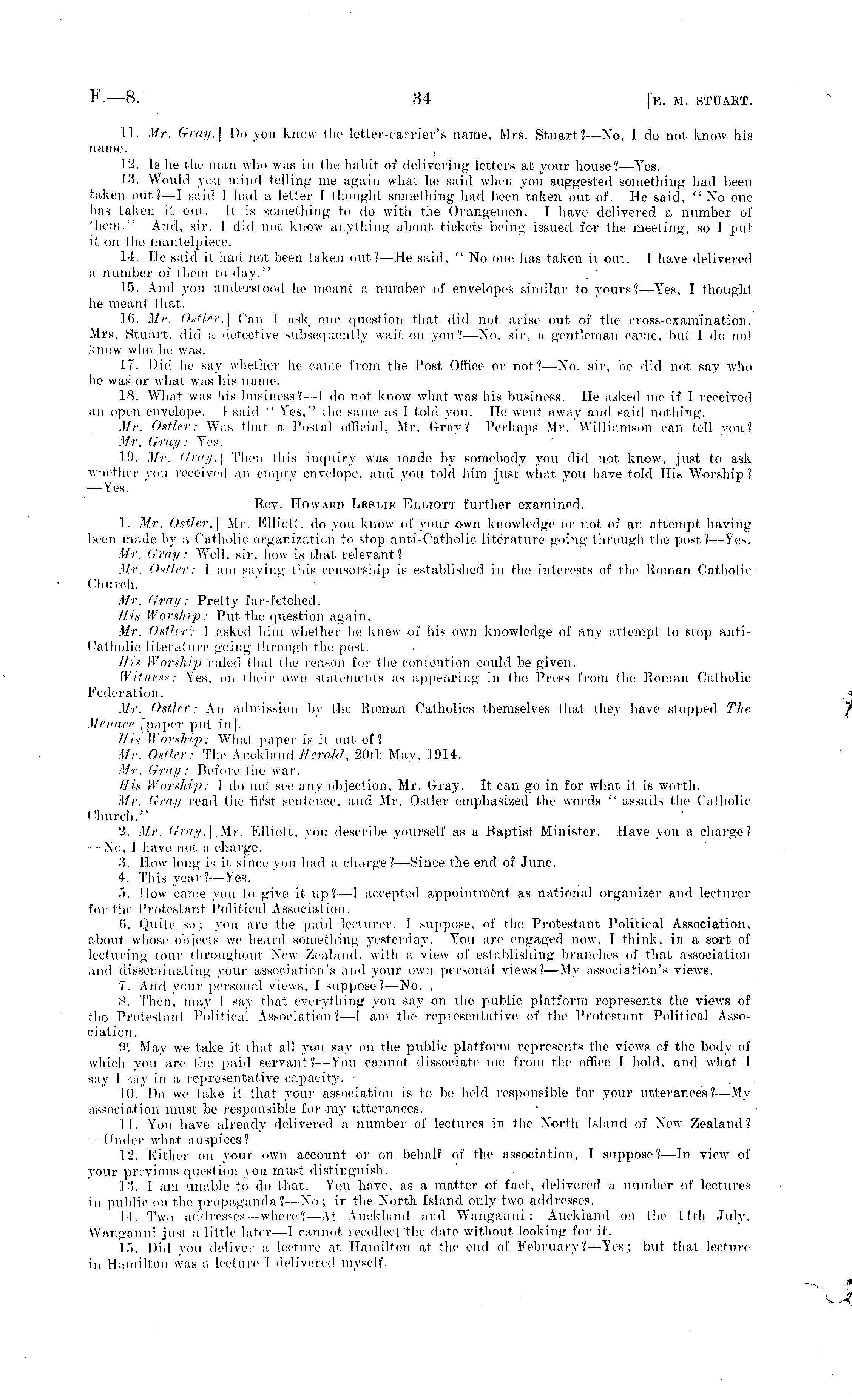 11. Mr. Gray.] Do you know the letter-carrier's name, Mrs. Stuart?—No, I do not know his name. 12. Is he the man who was in the habit of delivering letters at your house?— Yes. 13. Would you mind telling me again what he said when you suggested something had been taken out?—l said I had a letter I thought something had been (alien out of. He said, "No one has taken it out. It is something to do with the Orangemen. I have delivered a number of them." And, sir, 1 did not know anything about tickets being issued for (lie meeting, so 1 put it on the mantelpiece. 14. He said it had not been taken out?—He said, " No one has taken i( out. I have delivered a number of them to-day." 15. And you understood he meant a number of envelopes similar to yours?— Yes, I thought he meant that. 16. Mr. Ostler.] Can I ask one question thai did not arise out of the cross-examination. Mrs. Stuart, did a detective subsequently wait on you?—No, sir, a gentleman came, but I do not know who he was. 17. Did he say whether lie came from the Post Office or not?—No, sir, lie did not say who he was or what was Ins name. 18. What was his business?—l do not know what was his business. He asked me if I received an open envelope. 1 said " Yes,'' the same as I told you. lie went away anil said nothing. Mr. Ostler: Was thai a Postal official, Mr. Gray? Perhaps Mr. Williamson can tell you? Mr. Gray: Yes. 19. Mr. Gray.] Then this inquiry was made by somebody you did not know, just, to ask whether you received an empty envelope, and you (old him just what yon have told His Worship? —Yes. Rev. Howard Leslie Elliott further examined. 1. Mr. Ostler.] Mr. Elliott, do you know of your own knowledge or not of an attempt having been made by a, Catholic! organization to stop anti-Catholic literature going through (he post ? —Yes. Mr. Gray: Well, sir, how is that relevant? Mr. Ostler: I am saying (his censorship is established in the interests of the Roman Catholic Church. Mr. Gray: Pretty far-fetched. His Worship: Put the question again. Mr. Ostler: I asked him whether he knew of his own knowledge of any attempt to stop antiCatholic literature going through the post. /lis Worship ruled thai I he reason for the contention could be given. Witness: Yes, on their own statements as appearing in the Press from the Roman Catholic Federation. Mr. Ostler: An admission by the Roman Catholics themselves that they have stopped The Menace [paper put in |. Hit Worship: What paper is il out of? Mr. Ostler: The Auckland Herald. 20th May, 1914. Mr. Gray: Before the War. His Worship: Ido not sec any objection, Mr. Gray. It can go in for what it is worth. Mr. Gray read the first sentence, and Mr. Ostler emphasized the words "assails the Catholic Church." 2. Mr. Gray.\ Mr. Elliott, you describe yourself as a Baptist Minister. Have you a charge? —No, I have not a charge. 3. How long is it since you had a charge?— Since the end of June. 4. This year ?—Yes. 5. How came you to give it up?—] accepted appointment as national organizer and lecturer for the Protestant Political Association. 6. Quite so; you are the paid lecturer, I suppose, of the Protestant Political Association, about whose objects we heard something yesterday. You are engaged now, 1 think, in a sort of lecturing lour throughout New Zealand, with a view of establishing branches of thai association and disseminating your association's and your own personal views ?—My association's view's. 7. And your personal views, I suppose?— No. 8. Then, may I say thai everything you say on the public' platform represents the views of the Protestant Political Association ?—-I am the representative of the Protectant Political Association. 9. May we take it that all you say on the public platform represents the views of the body of which you are (he paid servant?— You cannot dissociate me from Hie office I hold, and what 1 say 1 say in a representative capacity. 10. Do we take it that your association is to be held responsible for your utterances?—My association must, be responsible for-my utterances. 11. You have already delivered a number of lectures in the North Island of New Zealand? —Under what auspices? 12. Either on your own account or on behalf of the association, I suppose?—ln view of your previous question you must distinguish. 13. I am unable to do that. You have, as a matter of fact, delivered a number of lectures in public on the propaganda? —No; in the North Island only two addresses. 14. Two addresses—-where ?—At Auckland and Wanganui: Auckland on the lllh July. Wanganui just a little later—l cannol recollect the dale without looking for it. 15. Did you deliver a lecture at Hamilton at the end of February? Yes; but that lecture in Hamilton was a lecture I delivered myself