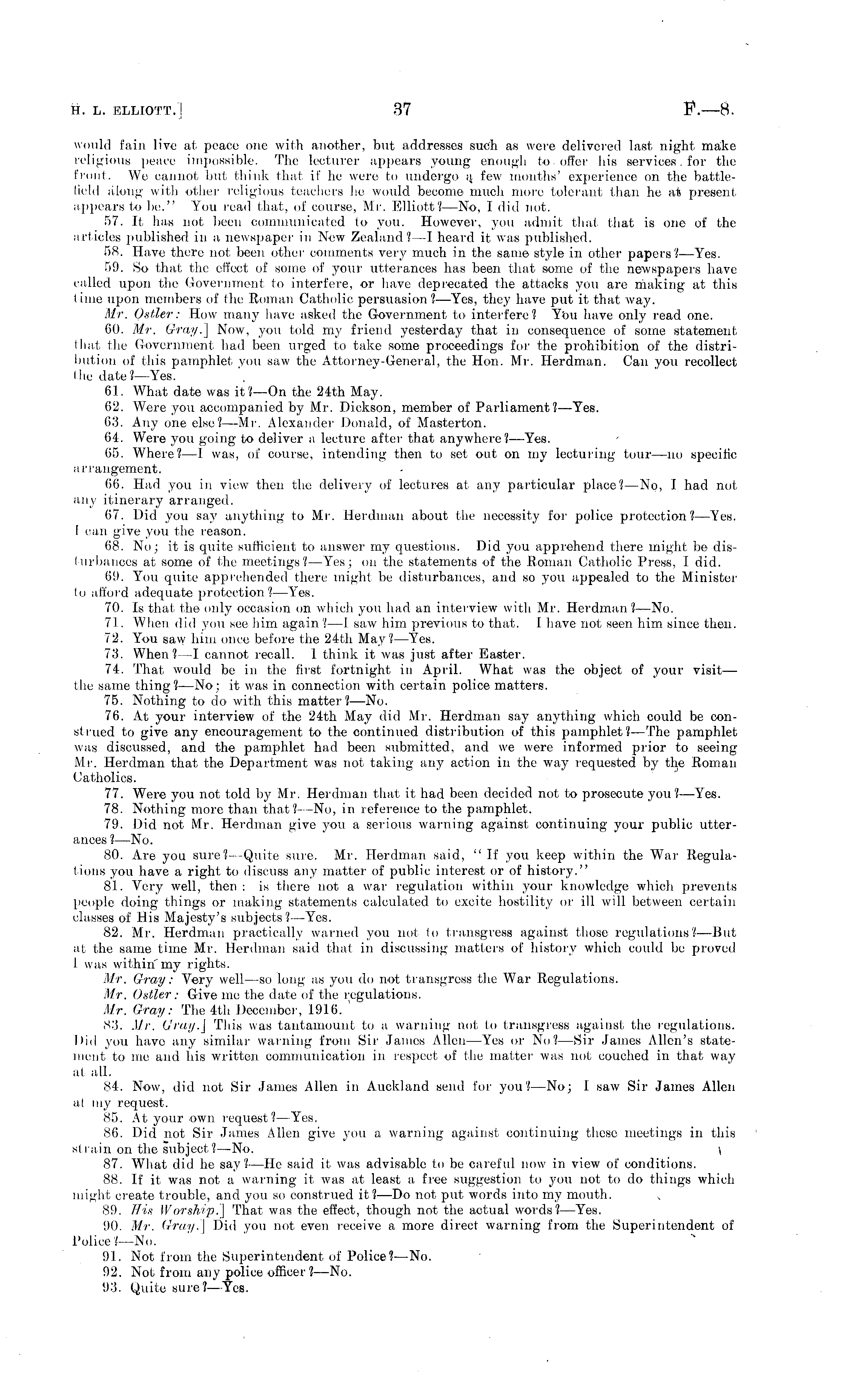 would fain live at peace one with another, but addresses such as were delivered last night make religious peace impossible. The lecturer appears young enough to offer his services, for the front. We cannot but think that if he were to undergo a, few months' experience on the battlefield along with other religious teachers he would become much more tolerant than he at present, appears to be." You read that, of course, Mr, Elliott? —No, I did not. 57. It has not been communicated to you. However, you admit that that is one of the articles published in a newspaper in New Zealand?—l heard it was published. 58. Have there not been other comments very much in the same style in other papers?— Yes. 59. So that the effect of sonic of your utterances has been that some of the newspapers have called upon the Government to interfere, or have deprecated the attacks you are making at this time upon members of the Roman Catholic persuasion ?—Yes, they have put it that way. Mr. Ostler: How many have asked the Government to interfere? You have only read one. 60. Mr. Gray.] Now, you told my friend yesterday that in consequence of some statement thai the Government had been urged to take some proceedings for the prohibition of the distribution of this pamphlet you saw the Attorney-General, the Hon. Mr. Herdman. Can you recollect Ihe date?— Yes. 61. What date was it ?—On the 24th May. 62. Were you accompanied by Mr. Dickson, member of Parliament?— Yes. 63. Any one else?— Mr. Alexander Donald, of Masterton. 64. Were you going to deliver a lecture after that anywhere? —Yes. 65. Where?—l was, of course, intending then to set out on my lecturing tour —no specific arrangement. 66. Had you in view then the delivery of lectures at any particular place?—No, I had not any itinerary arranged. 67. Did you say anything to Mr. Herdman about the necessity for police protection?— Yes. I can give you the reason. 68. No; it is quite sufficient to answer my questions. Did you. apprehend there might be disturbances at some of Hie meetings?— Yes; on the statements of the Roman Catholic Press, 1 did. 69. You quite apprehended there might be disturbances, and so you appealed to the Minister to afford adequate protection?— Yes. 70. Is that the only occasion on which you had an interview with Mr. Herdman ? —No. 71. When did you see him again ? —I saw him previous to that. 1 have not seen him since then. 72. You saw him once before the 24th May ? —Yes. 73. When?—l cannot recall. I think it was just after Easter. 74. That would be in the first fortnight in April. What was the object of your visit— the same thing?—No; it was in connection with certain police matters. 75. Nothing to do with this matter?— No. 76. At your interview of the 24th May did Mr. Herdman say anything which could be construed to give any encouragement to the continued distribution of this pamphlet?— The pamphlet was discussed, and the pamphlet had been submitted, and we were informed prior to seeing Mr. Herdman that the Department was not taking any action in the way requested by the Roman Catholics. 77. Were you not told by Mr. Herdman that it had been decided not to prosecute you?— Yes. 78. Nothing more than that?—No, in reference to the pamphlet. 79. Did not Mr. Herdman give you a serious warning against continuing your public utterances ?—No. 80. Are you sure?--Quite sure. Mr. Herdman said, "If you keep within the War Regulations you have a right to discuss any matter of public interest or of history." 81. Very well, then: is there not a war regulation within your knowledge which prevents people doing things or making statements calculated to excite hostility or ill will between certain classes of His Majesty's subjects?— Yes. 82. Mr. Herdman practically warned you not to transgress against those regulations?— But at the same time Mr. Herdman said that in discussing matters of history which could be proved 1 was within'my rights. Mr. Gray: Very well—so long as you do not transgress the War Regulations. Mr. Ostler: Give me the date of the regulations. Mr. Gray: The 4th December, 1916. 83. Mr. Gray.] This was tantamount to a warning not to transgress against the regulations. Did you havo any similar warning from Sir James Allen —Yes or No?— Sir James Allen's statement to me and his written communication in respect of the matter was not couched in that way al all. 84. Now, did not Sir James Allen in Auckland send for you?—No; I saw Sir James Allen at my request. 85. At your own request? —Yes. 86. Did not Sir James Allen give you a warning against continuing these meetings in this strain on the subject?— No. 87. What did he say?—He said it was advisable to be careful now in view of conditions. 88. If it was not a warning it was at least a free suggestion to you not to do things which might create trouble, and you so construed it? —Do not put words into my mouth. 89. His Worship.] That was the effect, though not the actual words? —Yes. 90. Mr. Gray.] Did you not even receive a more direct warning from the Superintendent of Police?— No. 91. Not from the Superintendent of Police? —No. 92. Not from any police officer ?—No. 9.'i. Quite sure?— Yes.