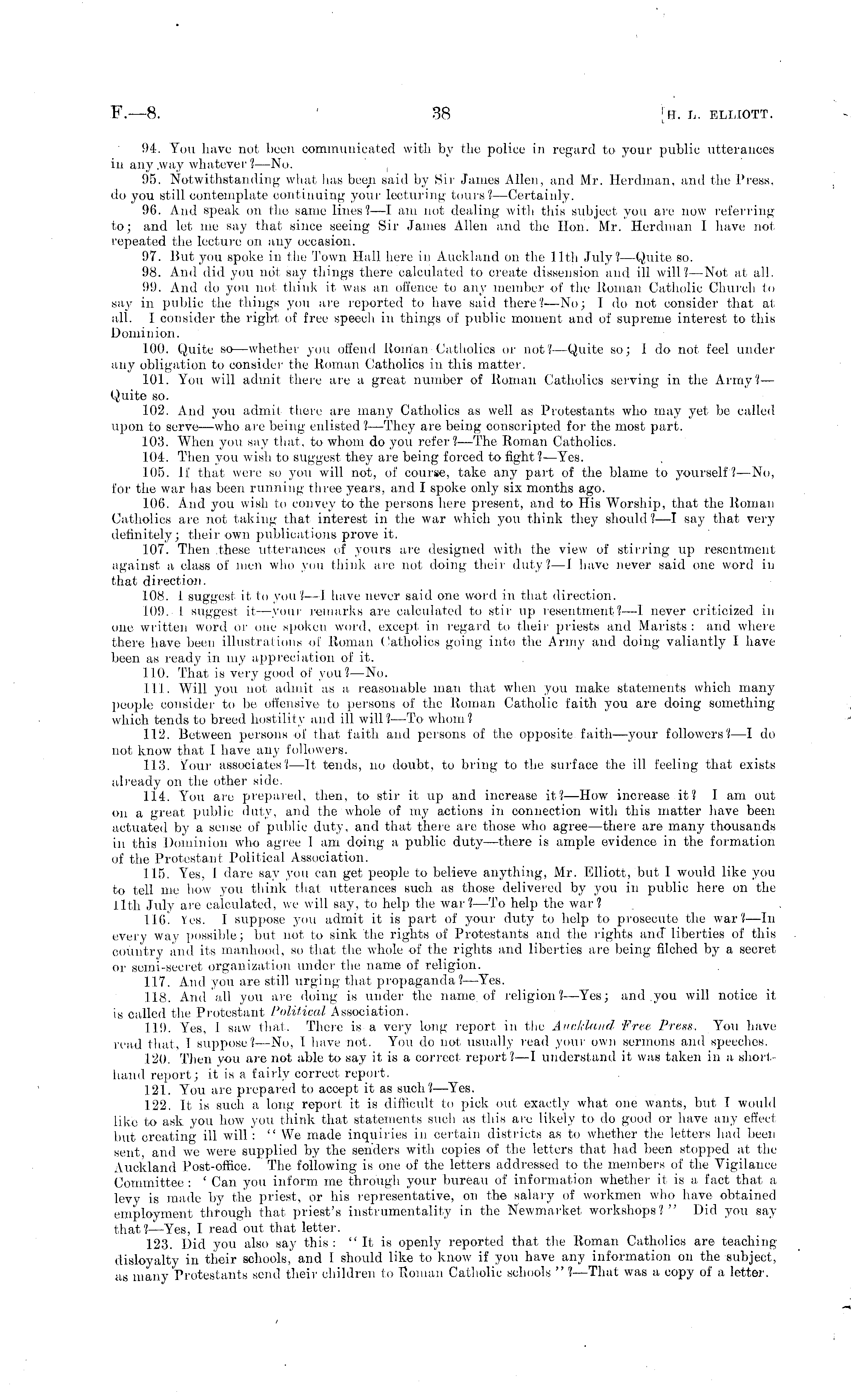 94. You have mil been communicated with by the police in regard lo your public utterances in anyway whatever? —No. 95. Notwithstanding what has been said by Sir James Allen, and Mr. Herdman. and the Press, do you still contemplate continuing your lecturing tours?— Certainly. 96. And speak on the same lines?—l am not dealing with this subject you are now referring to; and let me say (hat since seeing Sir James Allen and the Hon. Mr. Herdman I have not repeated the lecture on any occasion. 97. But you spoke in the Town Hall here in Auckland on the I lib July?— Quite so. 98. And did you mil say things there calculated to create dissension and ill will?— Not at all. 99. And do you not think it was an offence to any member of the Roman Catholic Church to say in public the things you are reported to have said there?—No; I do not consider that at all. I consider the right of free speech in things of public moment and of supreme interest to this Dominion. 100. Quite so—whether you offend Roman Catholics or not?— Quite so; I do not feel under any obligation to consider the Roman Catholics in this matter. 101. You will admit, there are a great number of Roman Catholics serving in the Army?— Quite so. 102. And you admit there are many Catholics as well as Protestants who may yet be called upon to serve—who.are being enlisted?— They are being conscripted for the most part. 103. When you say that, to whom do you refer?— The Roman Catholics. 104. Then you wish to suggest they are being forced to fight?— Yes. 105. If that were so you will not, of course, take any part of the blame to yourself?—No, for the war has been running three years, and I spoke only six months ago. 106. And you wish lo convey to the persons here present, and to His Worship, that the Roman Catholics are not taking that interest in the war which you think they should?—l say that very definitely; their own publications prove it. 107. Then these utterances of yours are designed with the view of stirring up resentment against a class of men who you think are not doing their duty? — I have never said one word in that direction. 108. 1 suggest it to you ?- I have never said one word in that direction. 109. I suggest it your remarks are calculated lo stir up resentment? —I never criticized in one written word or one spoken word, except in regard to their priests and Marists: and where there have been illustrations of Roman Catholics going into Ihe Army and doing valiantly I have been as ready in my appreciation of it. 110. That is very good of you?— No. 111. Will yon not admit as a reasonable man that when you make statements which many people consider to be offensive to persons of the Roman Catholic faith you are doing something which tends to breed hostility and ill will? —To whom? 112. Between persons of that faith and persons of the opposite faith—your followers?—l do not know that I have any followers. 113. your associates?—lt tends, no doubt, to bring to the surface the ill feeling that exists already on the other side. 114. You are prepared, then, to stir it up and increase it?— How increase it? I am out on a great public duly, and Ihe whole of my actions in connection with this matter have been actuated by a sense of public duty, and that there are those who agree —there are many thousands in this Dominion who agree I am doing a public duty—there is ample evidence in the formation of the Protestant Political Association. 115. Yes, I dare say you can get people to believe anything, Mr. Elliott, but 1 would like you to tell me how you think that utterances such as those delivered by you in public here on the I.lth July are calculated, we will say, lo help the war?—To help the war? 116. Yes. I suppose you admit it is part of your duty to help to prosecute the war?—ln every way possible; but not to sink the rights of Protestants and Hie rights and liberties of this country and its manhood, so that the whole of the rights and liberties are being filched by a secret or semi-secret organization under Hie name of religion. 117. And you are still urging thai propaganda?—-Yes. 118. And all you are doing is under the name of religion?— Yes; and you will notice it is called the Protestant Political Association. 119. Yes, 1 saw that. There is a very long report in the Auckland •Free Press. You have read that, 1 suppose? —No, I have not. You do not usually read your own sermons and speeches. 120. Then you are not able to say it, is a correct report?—l understand it was taken in a short hand report; it is a fairly correct report. 121. You are prepared to accept it as such? —Yes. 122. It is such a long report it is difficult to pick out exactly what one wants, but, I would like to ask. you how you think that statements such as this are likely to do good or have any effect but creating ill will: " We made inquiries in certain districts as to whether the letters had been sent, and we were supplied by the senders with copies of the letters that hail been stopped al (he Auckland Post-office. The following is one of the letters addressed to the members of the Vigilance Committee: 'Can you inform me through your bureau of informal ion whether it is a fact that a levy is made by (he priest, or his representative, on the salary of workmen who have obtained employment through Hint priest's instrumentality in the Newmarket workshops?" Did you say that?— Yes, I read out that letter. 123. Did you also say this : " It is openly reported that the Roman Catholics are teaching disloyalty in their schools, and I should like to know if you have any information on the subject, as many Protestants send their children to Roman Catholic schools " I —That was a copy of a letter.