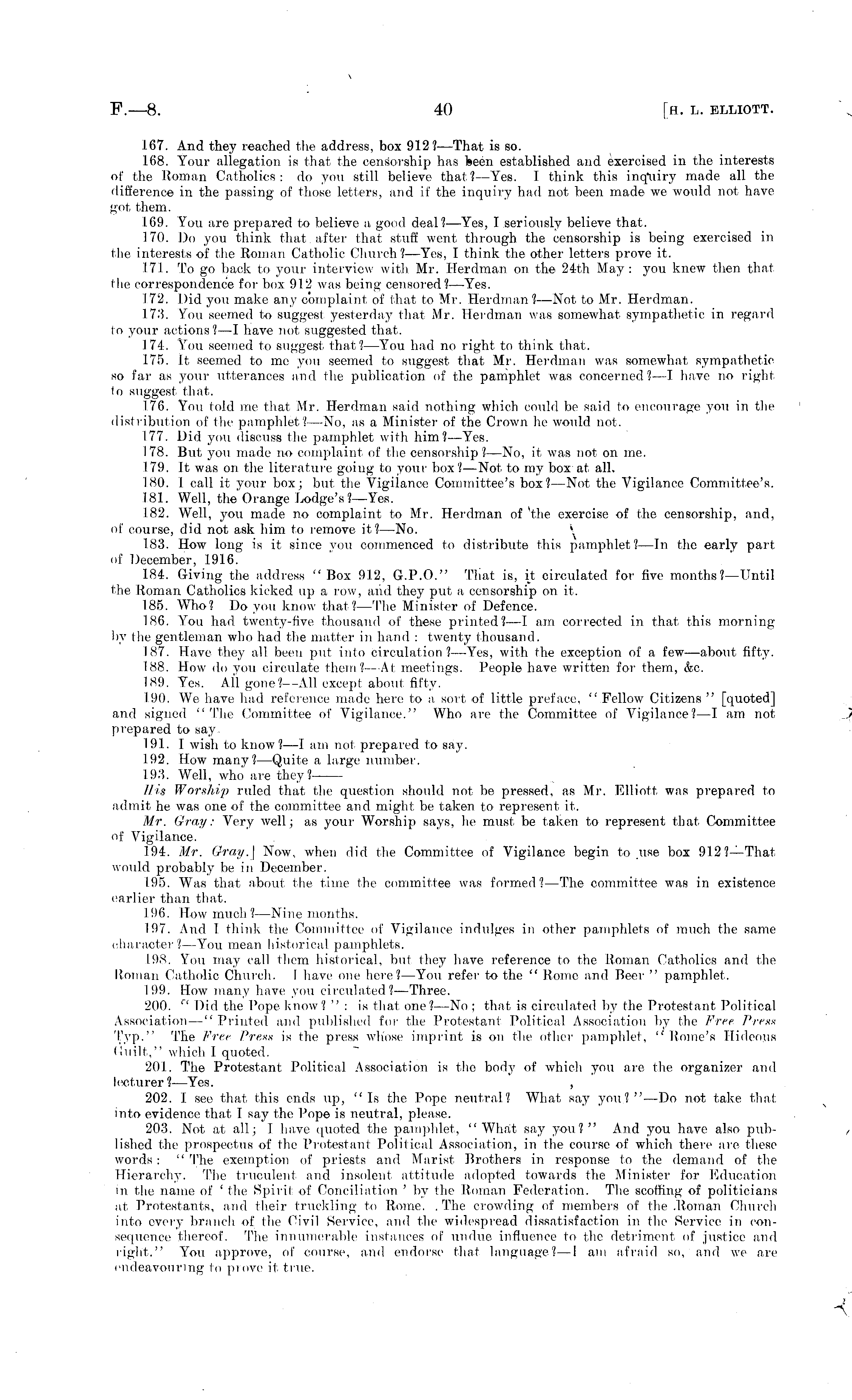 167. And they reached the address, box 912? —That is so. 168. Your allegation is that the censorship has "been established and exercised in the interests of the Roman Catholics: do you still believe that?— Yes. I think this inquiry made all the difference in the passing of those letters, and if the inquiry had not been made we would not have got them. 169. You are prepared to believe a good deal?— Yes, I seriously believe that. 170. Do you think that after that stuff went through the censorship is being exercised in Ihe interests of the Roman Catholic Church?— Yes, I think the other letters prove it. 171. To go back to your interview with Mr. Herdman on the 24th May : you knew then that the correspondence for box 912 was being censored?— Yes. 172. Did you make any complaint of that to Mr. Herdman?—Not to Mr. Herdman. 173. You seemed to suggest, yesterday that Mr. Herdman was somewhat sympathetic in regard to your actions? —I have not suggested that. 174. You seemed to suggest that?— You had no right to think that. 175. It seemed to me you seemed to suggest that Mr. Herdman was somewhat sympathetic so far as your utterances and the publication of the pamphlet was concerned? —I have no right, to suggest that. 176. You told me that Mr. Herdman said nothing which could be said to encourage you in the distribution of the pamphlet?—No, as a Minister of the Crown he would not. 177. Did you discuss the pamphlet with him?— Yes. 178. But you made no complaint of the censorship?—No, if was not on me. .179. It was on the literature going to your box?— Not to my box at all. 180. I call it your box; but, the Vigilance Committee's box? —Not, the Vigilance Committee's. 181. Well, the Orange Lodge's ?—Yes. 182. Well, you made no complaint to Mr. Herdman of the exercise of the censorship, and, of course, did not ask him to remove it?— No. 183. How long is it since you commenced to distribute this pamphlet?—ln the early part of December, 1916. 184. Giving the address "Box 912, G.P.0." That is, it circulated for five months ?—Until the Roman Catholics kicked up a row, and they put. a censorship on it. 185. W T ho? Do you know that?— The Minister of Defence. 186. You had twenty-five thousand of these printed?—l am corrected in that this morning by the gentleman who had the matter in hand : twenty thousand. 187. Have they all been put. into circulation?— Yes, with the exception of a few—about, fifty. 188. How do you circulate them?—Ai meetings. People have written for them, <fee. 189. Yes. All gone?— All except about fifty. " 190. We have had reference made here to a sort of little preface, " Fellow Citizens " [quoted] and signed "The Committee of Vigilance." Who are the Committee of Vigilance?—l am not prepared to say 191. I wish to know? —I am not prepared to say. 192. How many?— Quite a large number. 193. Well, who are they? His Worship ruled that the question should not be pressed, as Mr. Elliott was prepared to admit he was one of the committee and might be taken to represent, it. Mr. Gray: Very well; as your Worship says, he must, be taken to represent that Committee of Vigilance. 194. Mr. Gray.] Now, when did the Committee of Vigilance begin to use box 912? —That would probably be in December. 195. Was that about the time the committee was formed? —The committee was in existence earlier than that. 196. How much? —Nine months. 197. And I think the Committee of Vigilance indulges in other pamphlets of much the same character?— You mean historical pamphlets. 198. You may call them historical, but they have reference to the Roman Catholics and the Roman Catholic Church. I have one here?— You refer to the " Rome and Peer " pamphlet. 199. How many have you circulated? —Three. 200. " Did the Pope know? " : is that one?—No ; that is circulated by the Protestant, Political Association — "Printed and published for the Protestant Political Association by the Free Press Typ." The Free Press is the press whose imprint is on the other pamphlet, " Rome's Hideous Guilt," which I quoted. 201. The Protestant Political Association is the body of which you are the organizer and lecturer?— Yes. , 202. I see that this ends up, "Is the Pope neutral? What say you?"—Do not take that into evidence that I say the Pope is neutral, please. 203. Not at all; I have quoted the pamphlet, "What say you?" And you have also published the prospectus of the Protestant Political Association, in the course of which there are these words: "The exemption of priests and Marist Brothers in response to (he demand of the Hierarchy. The truculent and insolent attitude adopted towards the Minister for Education in the name of ' the Spiril of Conciliation 'by the Roman Federation. The scoffing of politicians at Protestants, and their truckling to Rome. , The crowding of members of Hie .Roman Church into ever}- branch of, the Civil Service, and the widespread dissatisfaction in the Service in consequence thereof. The innumerable instances of undue influence lo the detriment of justice and right." You approve, of course, and endorse thai language?—l am afraid so. and we are endeavouring to prove il true.