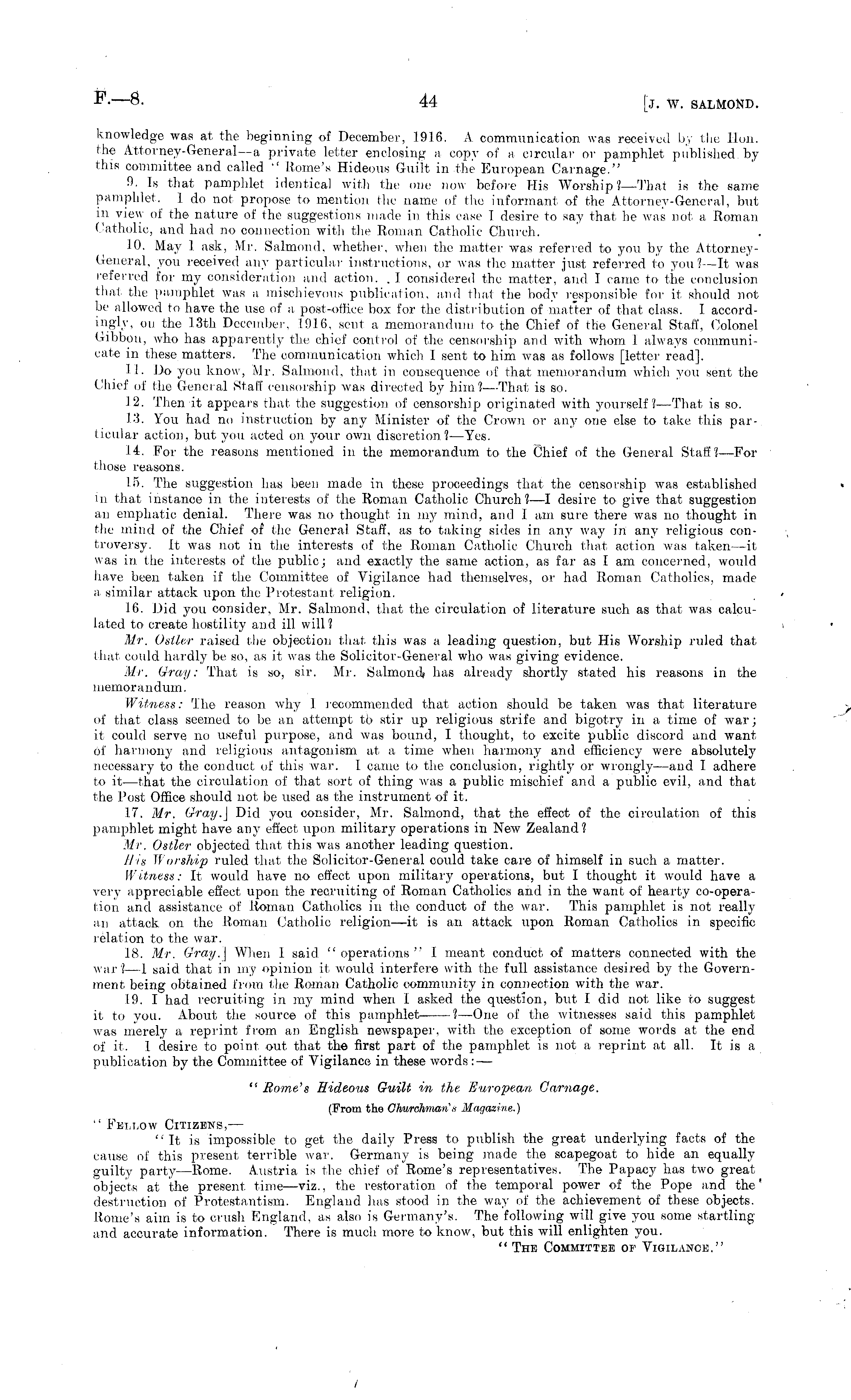knowledge was at the beginning of December, 1916. A communication was received by the Hon. the Attorney-General—a private letter enclosing a copy of a circular or pamphlet, published by this committee and called " Rome's Hideous Guilt in the European Carnage." 9. Is that pamphlet identical with (he one now before His Worship?— That is the same pamphlet. 1 do not propose to mention the name of the informant of the Attorney-General, but in view of the nature of the suggestions made in this case I desire to say that he was not a Roman Catholic, and had no connection with the Roman Catholic Church. 10. May 1 ask, Mr. Salmond, whether, when the matter was referred to you by the AttorneyGeneral, you received any particular instructions, or was the matter just referred to you? -It was referred for my consideration and action. . I considered the matter, and I came to the conclusion thai the pamphlet was a mischievous publication, and that the body responsible for it should not be allowed to have the use of a post-office box for the distribution of matter of that class. I accordingly, on the 13th December. 1916, sent a memorandum to the Chief of the General Staff, Colonel Gibbon, who has apparently the chief control of the censorship and with whom I always communicate in these matters. The communication which I sent, to him was as follows [letter read]. 11. Do you know, Mr. Salmond. that in consequence of that memorandum which you sent the Chief of the General Staff censorship was directed by him?— That is so. 12. Then it appears that the suggestion of censorship originated with yourself?— That is so. 13. You had no instruction by any Minister of the Crown or any one else to take this particular action, but you acted on your own discretion?— Yes. 14. For the reasons mentioned in the memorandum to the Chief of the General Staff?— For those reasons. 15. The suggestion has been made in these proceedings that the censorship was established in that instance in the interests of the Roman Catholic Church?—l desire to give that suggestion an emphatic denial. There was no thought in my mind, and 1 am sure there was no thought in the mind of the Chief of the General Staff, as to taking sides in any way in any religious controversy. It was not in the interests of the Roman Catholic Church that action was taken—it was in the interests of the public; and exactly the same action, as far as I am. concerned, would have been taken if the Committee of Vigilance had themselves, or had Roman Catholics, made a similar attack upon the Protestant religion. 16. Did you consider, Mr. Salmond, that the circulation of literature such as that was calculated to create hostility and ill will? Mr. Ostler raised the objection that this was a leading question, but His Worship ruled that that could hardly be so, as it was the Solicitor-General who was giving evidence. Mr. Gray: That is so, sir. Mr. Salmond* has already shortly stated his reasons in the memorandum. Witness: The reason why 1 recommended that action should be taken was that literature of that class seemed to be an attempt to stir up religious strife and bigotry in a time of war; it could serve no useful purpose, and was bound, I thought, to excite public discord and want of harmony and religious antagonism at a time when harmony and efficiency were absolutely necessary to the conduct of this war. I. came to the conclusion, rightly or wrongly —and I. adhere to it—that the circulation of that sort of thing was a public mischief and a public evil, and that the Post Office should not be used as the instrument of it. 17. Mr. Gray.] Did. you consider, Mr. Salmond, that the effect of the circulation of this pamphlet might have any effect upon military operations in New Zealand? Mr. Ostler objected that this was another leading question. His Worship ruled that, the Solicitor-General could take care of himself in such a matter. Witness: It would have no effect upon military operations, but I thought it would have a very appreciable effect upon the recruiting of Roman Catholics and in the want of hearty co-opera-tion and assistance of Roman Catholics in the conduct of the war. This pamphlet is not really an attack on the Roman Catholic religion—it is an attack upon Roman Catholics in. specific relation to the war. 18. Mr. Gray.] When I said "operations'' I meant conduct of matters connected with the war?—l said that in my opinion it would interfere with the full assistance desired by the Government being obtained from the Roman Catholic community in connection with the war. 19. I had recruiting in my mind when 1 asked the question, but I did not, like to suggest it to you. About the source of this pamphlet ?—One of the witnesses said this pamphlet was merely a reprint from an English newspaper, with the exception of sonic words at the end of it. I desire to point, out that the first part of the pamphlet is not a reprint at all. It is a publication by the Committee of Vigilance in these words : — " Rome's Hideous Guilt in the European Carnage. (From the Churchman '« Magazine.) " Fellow Citizens, — "It is impossible to get the daily Press to publish the great underlying facts of the cause of this present terrible war. Germany is being made the scapegoat, to hide an equally guilty party —Rome. Austria is the chief of Rome's representatives. The Papacy has two great objects at the present time—viz., the restoration of the temporal power of the Pope and the' destruction of Protestantism. England has stood in the way of the achievement of these objects. Rome's aim is to crush England, as also is Germany's. The following will give you some startling and accurate information. There is much more to know, but this will enlighten you. " The Committee of Vigilance." /