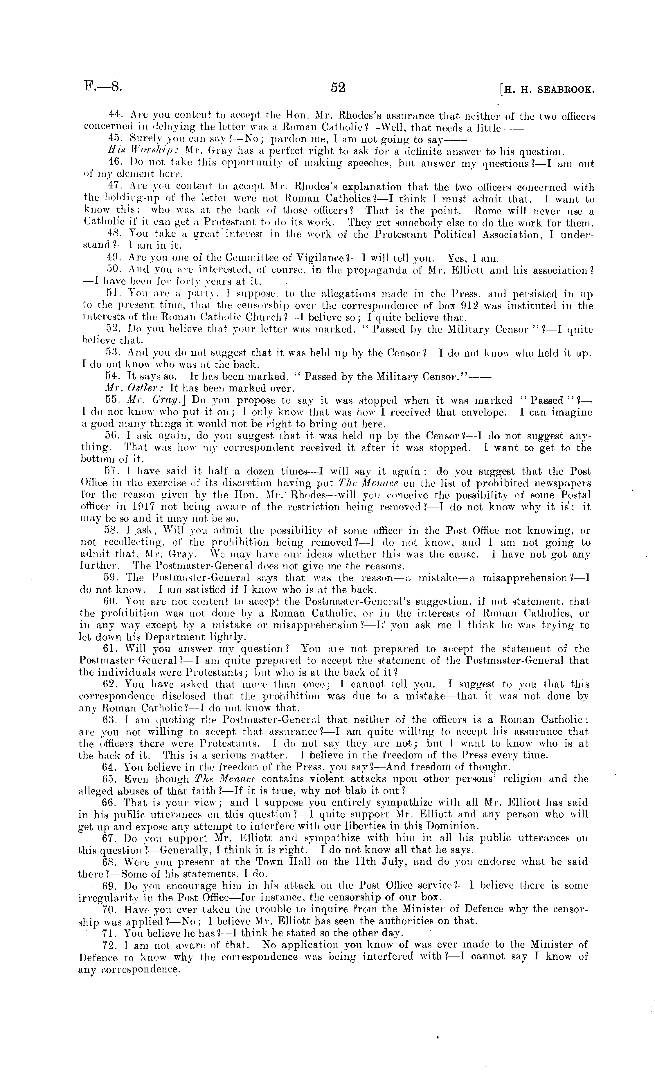 44. Are you content to accept the Hon. Mr. Rhodes's assurance that neither of the two officers concerned in delaying the letter was a Roman Catholic?— Well, that needs a little 45. Surely you can say?—No; pardon me, 1 am not going to say His Worship: Mr. Gray has a perfect right to ask for a definite answer to his question. 46. Do not take this opportunity of making speeches, but answer my questions? —I am out of my element, here. 47. Are you content to accept Mr. Rhodes's explanation that the two officers concerned with the holding-up of the letter were not Roman Catholics?—l think I must admit that. I want to know this: who was at the back of those officers? That is the point, Rome will never use a Catholic if it, can get a Protestant to do its work. They get somebody else to do the work for them. 48. You take a great interest in the work of the Protestant Political Association, 1 understand?—l am in it. 49. Are you one of the Committee of Vigilance?—l will tell you. Yes, I am. 50. And you are interested, of course, in the propaganda of Mr. Elliot! and his association? —I have been for forty years at it. 51. You are a party, I suppose, to the allegations made in the Press, and persisted in up to the present time, that the censorship over the correspondence of box 912 was instituted in the interests of the Roman Catholic Church ?—I believe so; I quite believe that. 52. Do you believe that your letter was marked, " Passed by the Military Censor "?—I quite believe that. 53. And you do not suggest that it, was held up by the Censor? —I do not know who held it up. I do not know wdio was at the back. 54. It says so. It has been marked, " Passed by the Military Censor." Mr. Ostler: It has been marked over. 55. Mr. Gray.] Do you propose to say it was stopped when it was marked "Passed"?— Ido not know who put it on; 1 only know that, was how 1 received that envelope. I can imagine a good many things it. would not be right to bring out here. 56. 1 ask again, do you suggest that it was held up by the Censor?—l do not suggest anything. That was how my correspondent received it after it was stopped. I want to get to the bottom of it. 57. I have said it half a dozen times—l will say it again : do you suggest that the Post Office in the exercise of its discretion having put. The Menace on the list of prohibited newspapers for the reason given by the Bon. Mr.' Rhodes —will you conceive the possibility of some Postal officer in 1917 not being aware of the restriction being removed?—l do not know why it is; it may be so and it may not be so. 58. I .ask, Will you admit the possibility of some officer in the Post Office not knowing, or not recollecting, of the prohibition being removed?—l do not know, and 1 am not going to admit that, Mr. Gray. We may have our ideas whether this was the cause. I have not got any further. The Postmaster-General does not give me the reasons. 59. The Postmaster-General says that was the reason —a mistake—a misapprehension?—l do not know. lam satisfied if I know who is at the back. 60. You are not content to accept the Postmaster-General's suggestion, if not statement, that the prohibition was not done by a Roman Catholic, or in the interests of Roman Catholics, or in any way except by a mistake or misapprehension?—lf you ask me 1 think he was trying to let down his Department lightly. 61. Will you answer my question? You are not prepared to accept the statement of the Postmaster-General? —I am quite prepared to accept the statement of the Postmaster-General that the individuals were Protestants; but who is at the back of it? 62. You have asked that more than once; I cannot tell you. I suggest to you that this correspondence disclosed that the prohibition was due to a mistake —that it was not done by any Roman Catholic? —I do not know that. 63. 1 am quoting the Postmaster-General that neither of the officers is a Roman Catholic : are you not willing to accept that assurance?—l am quite willing to accept his assurance that the officers there were Protestants. T do not say they are not; but I want to know who is at the back of it. This is a serious matter. I believe in the freedom of the Press every time. 64. You believe in the freedom of the Press, you say?— And freedom of thought. 65. Even though The Menace contains violent attacks upon other persons' religion and the alleged abuses of that faith?—lf it is true, why not blab it out? 66. That is your view; and I suppose you entirely sympathize with all Mr. Elliott has said in his public utterances on this question?—l quite support Mr. Elliott and any person who will get up and expose any attempt to interfere with our liberties in this Dominion. 67. Do you support Mr. Elliott and sympathize with him in all his public utterances on this question ? —Generally, I think it is right. Ido not know all that he says. 68. Were you present at. the Town Hall on the 11th July, and do you endorse what he said there? —Some of his statements, I do. 69. Do you encourage him in his attack on the Post Office service?—l believe there is some irregularity in the Post Office —for instance, the censorship of our box. 70. Have you ever taken the trouble to inquire from the Minister of Defence why the censorship was applied?—No ; I believe Mr. Elliott has seen the authorities on that. 71. You believe he has? —I think he stated so the other day. 72. 1 am not aware of that, No application you know of was ever made to the Minister of Defence to know why the correspondence was being interfered with?—l cannot say I know of any correspondence. i
