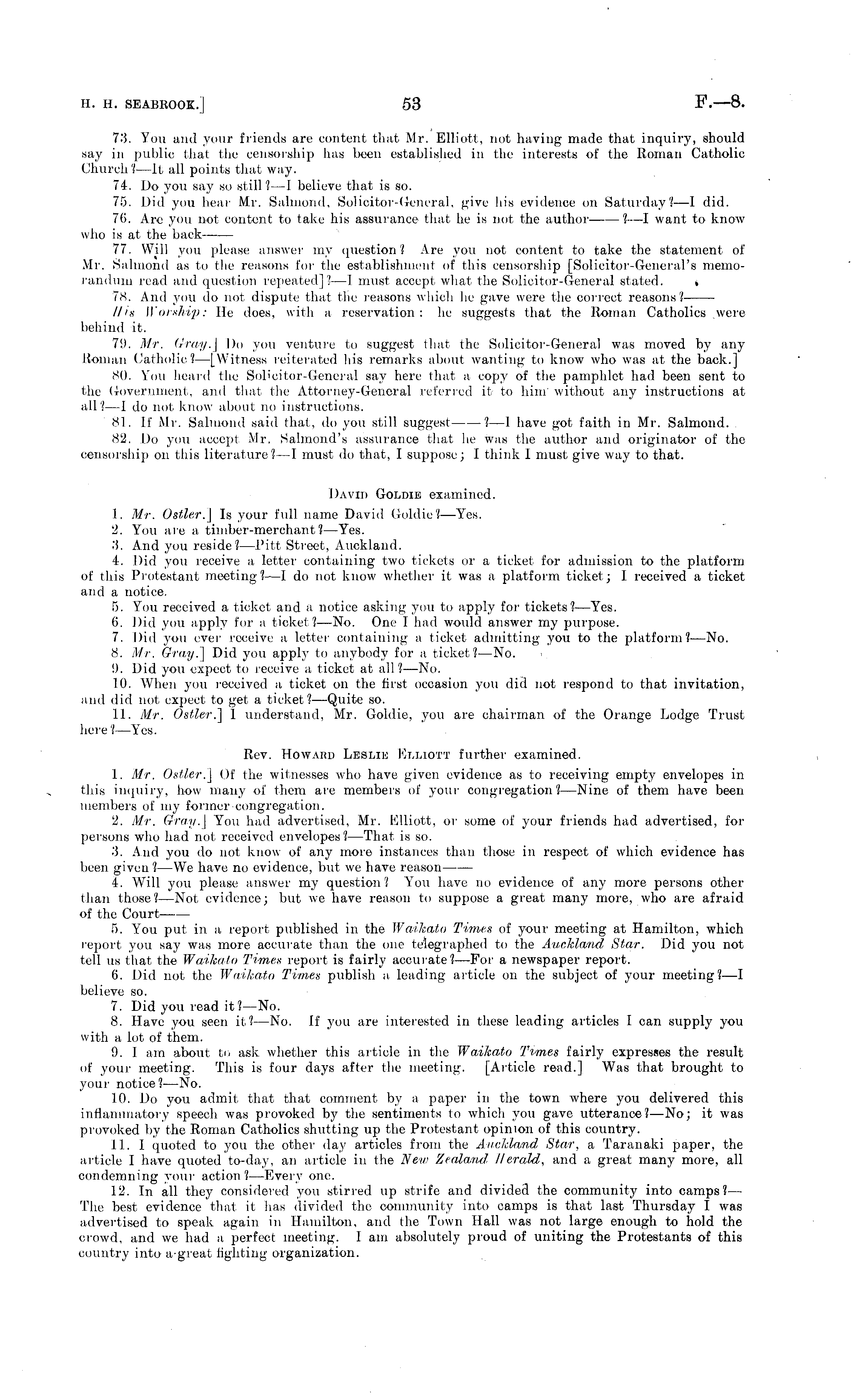 73. You and your friends are content that Mr. Elliott, not having made that inquiry, should say in public that the censorship has been established in the interests of the Roman Catholic Church?—lt all points that way. 74. Do you say so still? —I believe that is so. 75. Did you hear Mr. Salmond, Solicitor-General, give his evidence on Saturday?—l did. 76. Are you not content to take his assurance that he is not the author ?—I want to know who is at the back 77. Will you please answer my question? Are you not content to take the statement of Mr. Salmond as to the reasons for the establishment of this censorship [Solicitor-General's memorandum read and question repeated]?—l must accept what the Solicitor-General stated. 78. And you do not dispute that the reasons which he gave were (he correct reasons? Ihs Worship: He does, with a reservation: he suggests that the Roman Catholics were behind it. 79. Mr. Gray.] Do you venture to suggest that the Solicitor-General was moved by any Roman Catholic?—[Witness reiterated his remarks about wanting to know who was at the back.] 80. You heard the Solicitor-General say here that a copy of the pamphlet had been sent to the Government, and that the Attorney-General referred it to hint without any instructions at all?—I do not know about no instructions. 81. If Mr. Salmond said that, do you still suggest ?—I have got faith in Mr. Salmond. 82. Do you accept Mr. Salmond's assurance that he was the author and originator of the censorship on this literature?—l must do that, I suppose; I think I must give way to that. David Goldie examined. 1. Mr. Ostler.] Is your full name David Goldie?—Yes. 2. You are a timber-merchant? —Yes. 3. And you reside?—Pitt Street, Auckland. 4. Did you receive a letter containing two tickets or a ticket for admission to the platform of this Protestant meeting? —1 do not know whether it was a platform ticket; I received a ticket and a notice. 5. You received a ticket and a notice asking you to apply for tickets? —Yes. 6. Did you apply for a ticket?— No. One I had would answer my purpose. 7. Did you ever receive a letter containing a ticket admitting you to the platform?— No. 8. Mr. Gray.] Did you apply to anybody for a ticket? —No. 9. Did you expect to receive a ticket at all? —No. 10. When you received a ticket on the first occasion you did not respond to that invitation, and did not expect to get a ticket?— Quite so. 11. Mr. Ostler.] 1 understand, Mr. Goldie, you are chairman of the Orange Lodge Trust here?— Yes. Rev. Howard Leslie Elliott further examined. 1. Mr. Ostler.] Of the witnesses who have given evidence as to receiving empty envelopes in this inquiry, how many of them are members of your congregation?— Nine of them have been members of my former (Congregation, 2. Mr. Gray.] You had advertised, Mr. Elliott, or some of your friends had advertised, for persons who had not received envelopes ? —That is so. 3. And you do not know of any more instances than those in respect of wdiich evidence has been given ?—We have no evidence, but we have reason 4. Will you please answer my question? You have no evidence of any more persons other than those?— Not evidence; but we have reason to suppose a great many more, who are afraid of the Court 5. You put in a report published in the Waikato Times of your meeting at Hamilton, which report you say was more accurate than the one telegraphed to the Auckland Star. Did you not tell us that the Waikato Times report is fairly accurate?— For a newspaper report. 6. Did not the Waikato Times publish a, leading article on the subject of your meeting?—l believe so. 7. Did you read it?— No. 8. Have you seen it? —No. If you are interested in these leading articles I can supply you with a lot of them. 9. I am about to ask. whether this article in the Waikato Times fairly expresses the result of your meeting. This is four days after the meeting. [Article read.] Was that brought to your notice ?—No. 10. Do you admit that that comment by a paper in the town where you delivered this inflammatory speech was provoked by the sentiments to which you gave utterance?—No; it was provoked by the Roman Catholics shutting up the Protestant opinion of this country. 11. I quoted to you the other day articles from the Auckland Star, a Taranaki paper, the article I have quoted to-day, an article in the New Zealand Herald, and a great many more, all condemning your action?— Every one. 12. In all they considered you stirred up strife and divided the community into camps?— The best evidence that it has divided the community into camps is that last Thursday I was advertised to speak again in Hamilton, and the Town Hall was not large enough to hold the crowd, and we had a perfect meeting. I am absolutely proud of uniting the Protestants of this country into a-great fighting organization.
