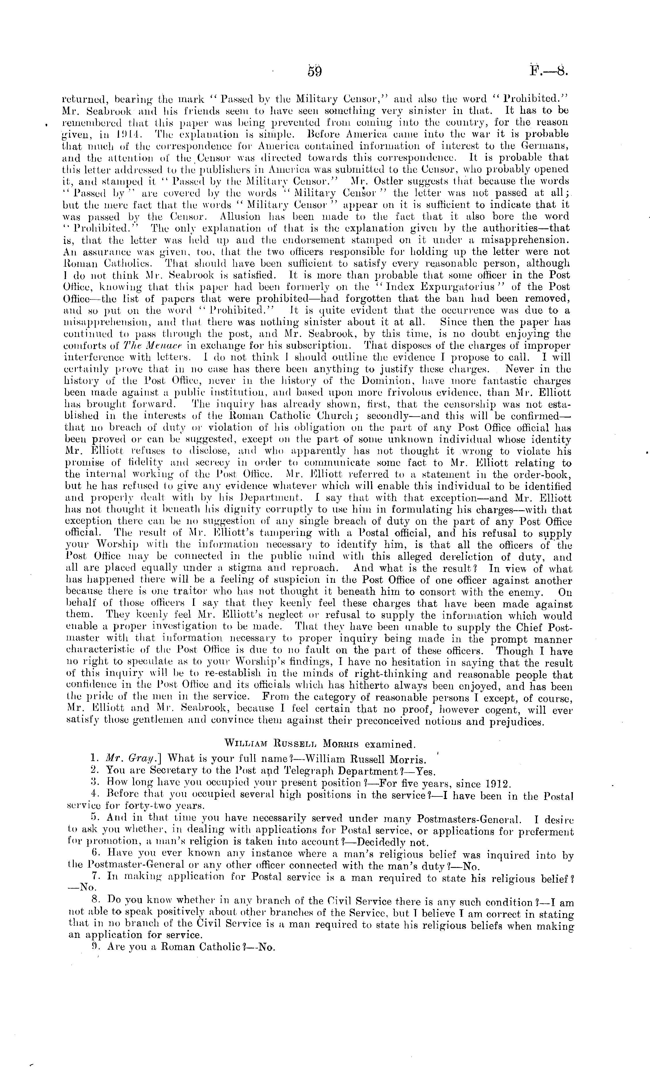returned, bearing the mark " Passed by the Military Censor," and also the word " Prohibited." Mr. Seabrook and his friends seem to have seen something very sinister in that. It has to be remembered that this paper was being prevented from coming into the country, for the reason given, in 1911. The explanation is simple. Before America came into the war it is probable that much of the correspondence for America contained information of interest to the Germans, and the attention of the Censor was directed towards this correspondence. It is probable that this letter addressed to the publishers in America was submitted to the Censor, who probably opened it, and stamped it " Passed by the Military Censor." Mr. Ostler suggests that because the words "Passed by" are covered by the words "Military Censor" the letter was not passed at all;, but the mere fact that the words " Military Censor " appear on it is sufficient to indicate that it was passed by Hie Censor. Allusion has been made to the fact that it also bore the word " Prohibited." The only explanation of that is the explanation given by the authorities—that is, that the letter was held up and the endorsement stamped on it under a misapprehension. An assurance was given, too, thai the two officers responsible for holding up the letter were not Roman Catholics. That should have been sufficient to satisfy every reasonable person, although Ido not think Mr. Seabrook is satisfied. It is more than probable that, some officer in the Post Office, knowing that this paper had been formerly on the "Index Expurgatorius " of the Post Office—the list of papers that were prohibited —had forgotten that the ban had been removed, and so put on the word " Prohibited." It is quite evident that the occurrence was due to a misapprehension, and thai there was nothing sinister about it at all. Since then the paper has continued to pass through the post, and Mr. Seabrook, by this time, is no doubt enjoying the comforts of The Menace in exchange for his subscription. That disposes of the charges of improper interference with letters. I do not think I should outline the evidence I propose to call. I will certainly prove that in no case has there been anything to justify these charges. Never in the history of the Post Office, never in the history of the Dominion, have more fantastic charges been made against, a public institution, and based upon more frivolous evidence, than Mr. Elliott, has brought forward. The inquiry has already shown, first, that the censorship was not established in the interests of the Roman Catholic Church; secondly —and this will be confirmed— that no breach of duly or violation of his obligation on the part of any Post Office official has been proved or can be suggested, except on the part of some unknown individual whose identity Mr. Elliott refuses to disclose, and who apparently has not thought it wrong to violate his promise of fidelity and secrecy in order to communicate some fact to Mr. Elliott relating to the internal working of the Post Office, Mr. Elliott referred to a statement in the order-book, but he has refused to give any evidence whatever which will enable this individual to be identified and properly dealt with by his Department, I say that with that exception—and Mr. Elliott has not thought it beneath his dignity corruptly to use him in formulating his charges —with that exception there can be no suggestion of any single breach of duty on the part of any Post Office official. The result of Mr. Elliott's tampering with a Postal official, and his refusal to supply your Worship with the informal ion necessary to identify him, is that all the officers of the Post Office may be connected in the public mind with this alleged dereliction of duty, and all are placed equally under a stigma and reproach. And what is the result? In view of what has happened there will be a feeling of suspicion in the Post Office of one officer against another because there is one traitor who has not thought it beneath him to consort with the enemy. On behalf of those officers I say that they keenly feel these charges that have been made against them. They keenly feel Mr. Elliott's neglect or refusal to supply the information which would enable a proper investigation to be made. That they have been unable to supply the Chief Postmaster with that, information necessary to proper inquiry being made in the prompt manner characteristic of the Post Office is due to no fault on the part of these officers. Though I have no right to speculate as to your Worship's findings, I have no hesitation in saying that the result of this inquiry will be to re-establish in the minds of right-thinking and reasonable people that confidence in the Post Office and its officials which has hitherto always been enjoyed, and has been the pride of the men in the service. From the category of reasonable persons I except, of course, Mr. Elliott and Mr. Seabrook, because I feel certain that no proof, however cogent, will ever satisfy those gentlemen and convince them against their preconceived notions and prejudices. William Russell Morris examined. 1. Mr. Gray.] What is your full name?— William Russell Morris. 2. You are Secretary to the Post and Telegraph Department?— Yes. 3. How long have you occupied your present position?— For five years, since 1912. 4. Before that you occupied several high positions in the service?—l have been in the Postal service for forty-two years. 5. And in that time you have necessarily served under many Postmasters-General. I desire to ask you whether, in dealing with applications for Postal service, or applications for preferment for promotion, a man's religion is taken into account?— Decidedly not, 6. Have you ever known any instance where a man's religious belief was inquired into by the Postmaster-General or any other officer connected with the man's duty? No. 7. In making application for Postal service is a man required to 